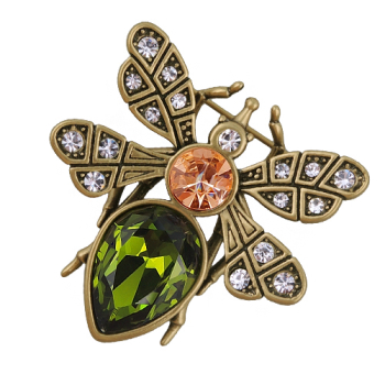 Изготовлено из ювелирного сплава на основе латуни с гальваническим покрытием бронзой. Изделие украшают кристаллы SW зеленого, шампань и белого цвета. Размер украшения 4х4см. Застежка-булавка.