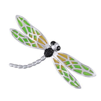Изготовлено из ювелирного сплава на основе латуни с гальваническим покрытием матовым родием. Изделие вручную расписано ювелирной краской зеленого и желтого цвета, покрыто эмалью и украшено агатом и фианитами. Замок с задвижной гильзой. Размер 8х4см