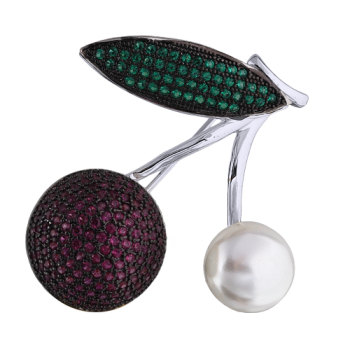 Брошь Вишенка (Майорка белая, фианиты фуксия, зеленые; покрытие родий)