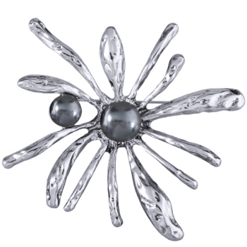 Изготовлено из ювелирного сплава на основе латуни с гальваническим покрытием родием. Изделие украшает жемчуг Майорка диаметром 12-16мм темно-серого цвета. Размер 10х9см. Замок-английская булавка.