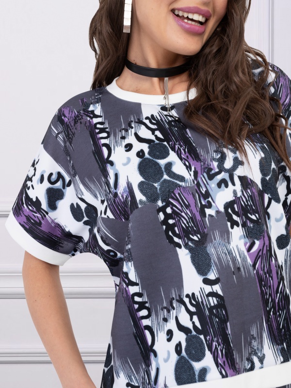 Состав: Трикотаж набивной (95% п/э, 5% спандекс) Основной цвет ткани: Фиолетовый Отрезная талия: Есть Подклад: Есть Резинка по талии: Есть Вид принта: орнамент Комментарии к товару
