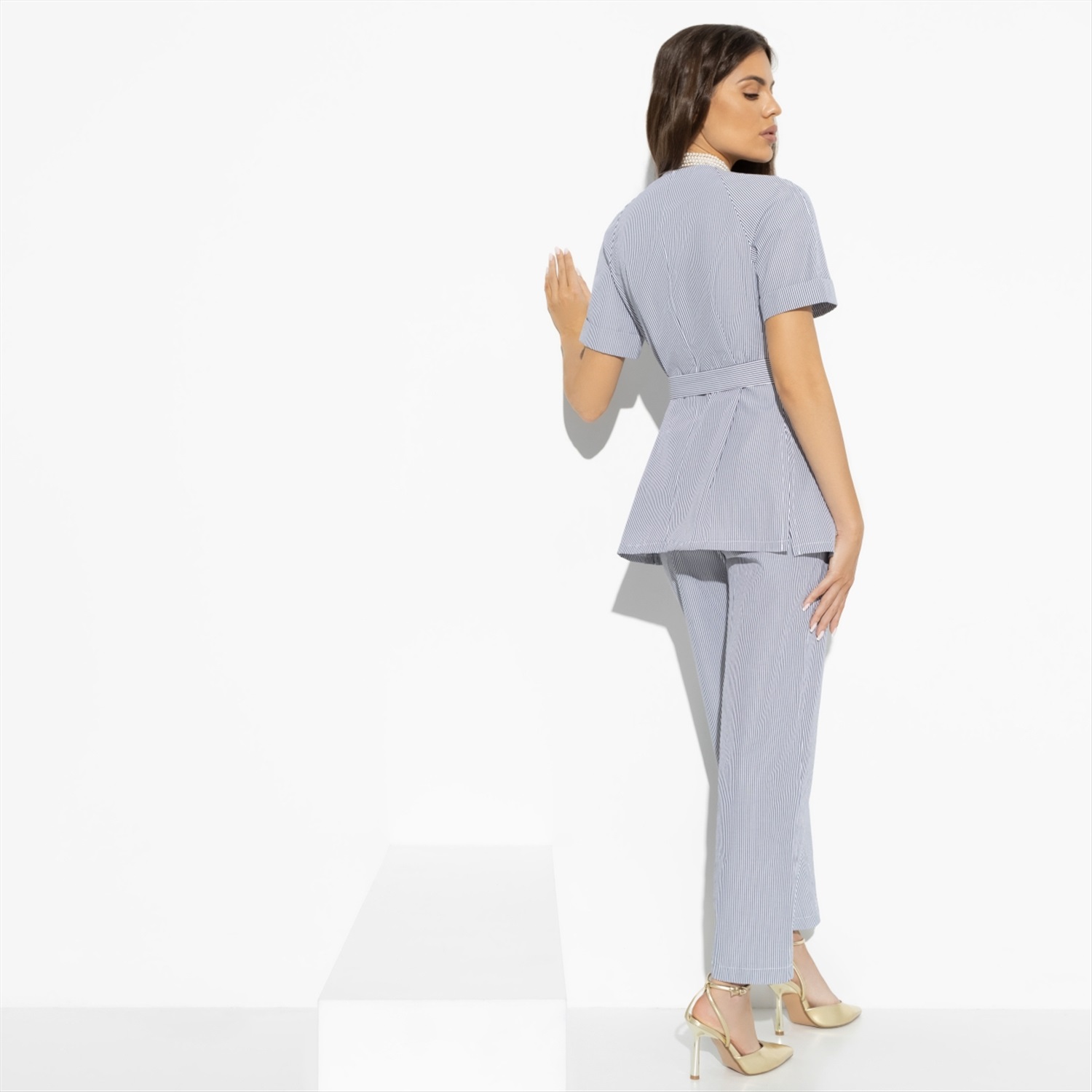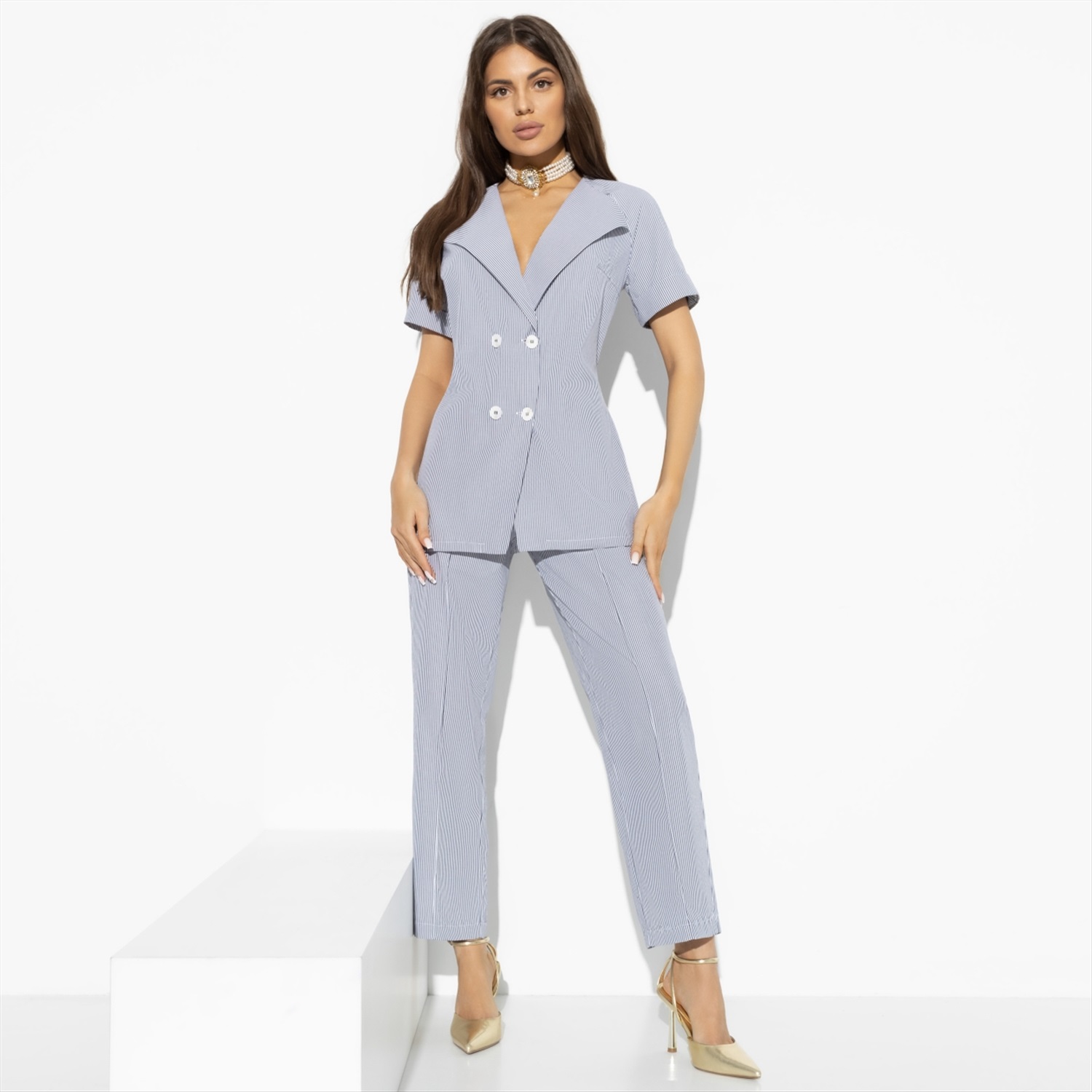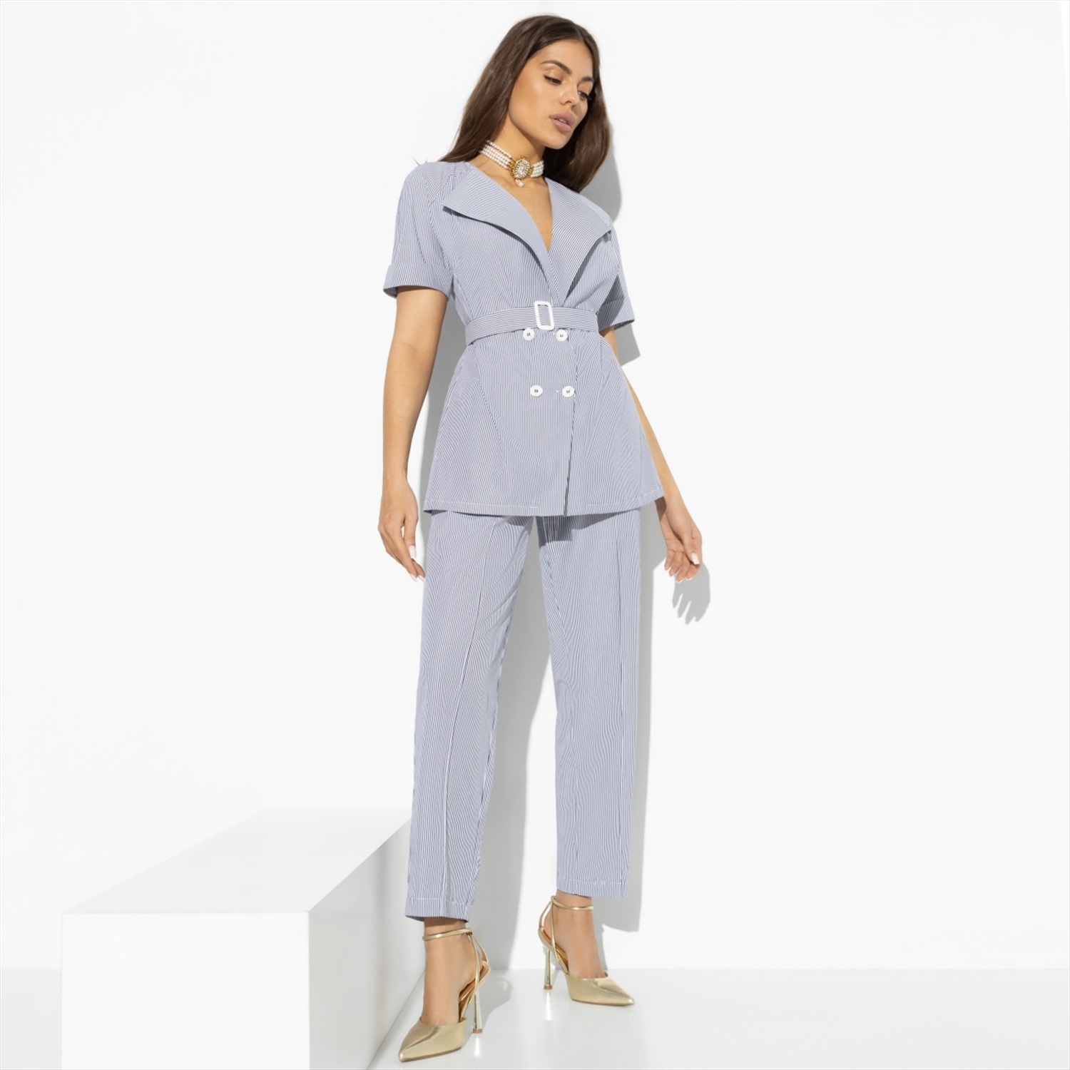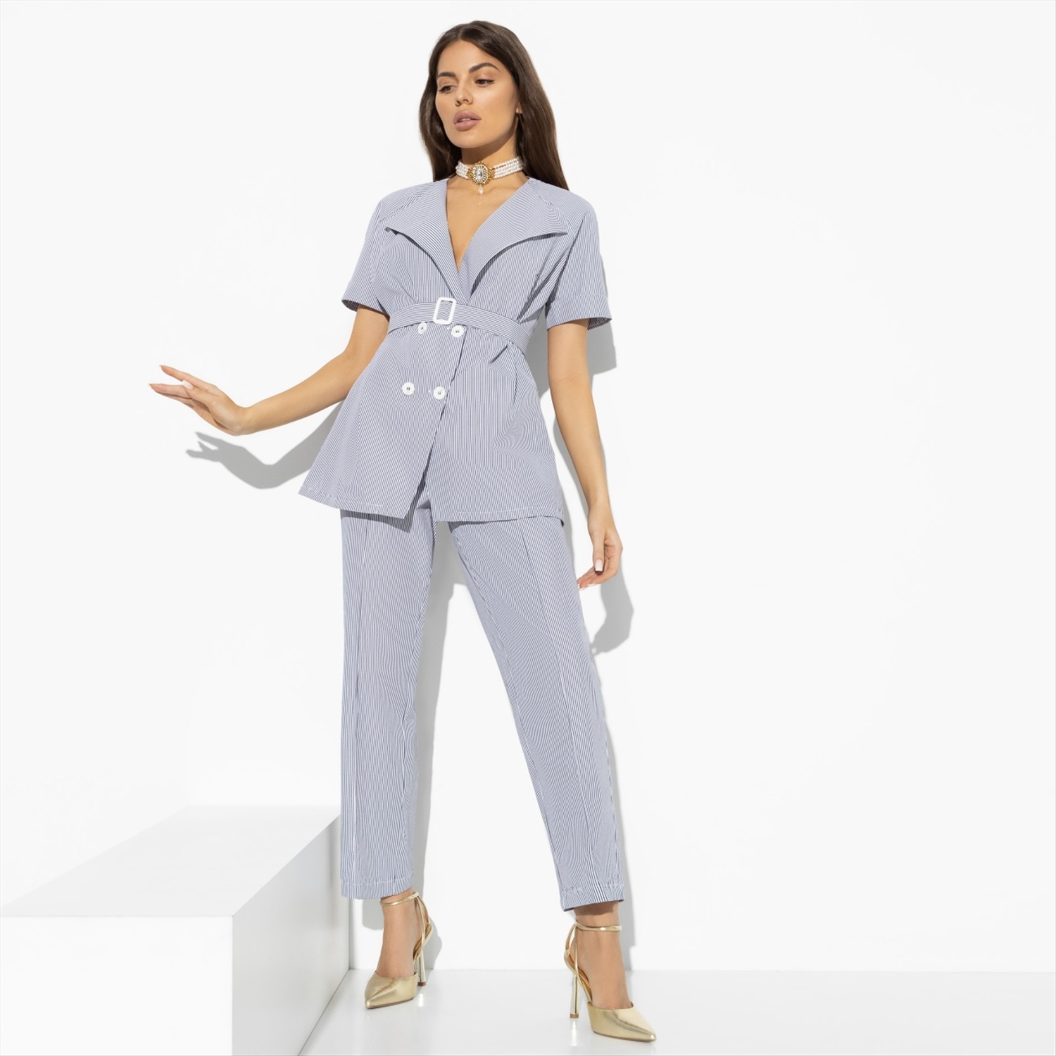 Состав: «Поплин тиси» (50% хлопок, 50% полиэстер) Плотность ткани: Средняя Тип ткани: Текстиль Вид застежки: Пуговица/-ы Дополнительный цвет ткани: Белый Карманы: Накладные Основной цвет ткани: Черный Отрезная талия: Нет Подклад: Нет Резинка по талии: Есть Рисунок/раппорт: Каждое изделие уникально из-за расположения рисунка на ткани Сезон: Лето Этот брючный костюм — настоящее воплощение элегантности. Сочетание классического кроя брюк и изысканного жакета с поясом придает вашему облику неповторимый шарм и стиль. Каждый шаг в этом костюме превратится в настоящий модный показ, где вы будете олицетворением изыска и безупречного вкуса. Этот брючный костюм не только элегантен, но и удивительно универсален. Жакет с поясом и брюки — это не просто одежда, это инвестиция в ваш стиль и уверенность. С легкостью переходите от деловой встречи к романтическому ужину, сохраняя непревзойденную элегантность и шарм. Этот брючный костюм изготовлен из высококачественного материала «поплин тиси», сочетающего в себе 50% хлопка и 50% полиэстера. Такое сочетание обеспечивает не только роскошный внешний вид, но и комфорт при носке. Вы будете чувствовать себя уверенно и комфортно в любой ситуации, оставаясь вершиной стиля и элегантности. Комментарии к товару