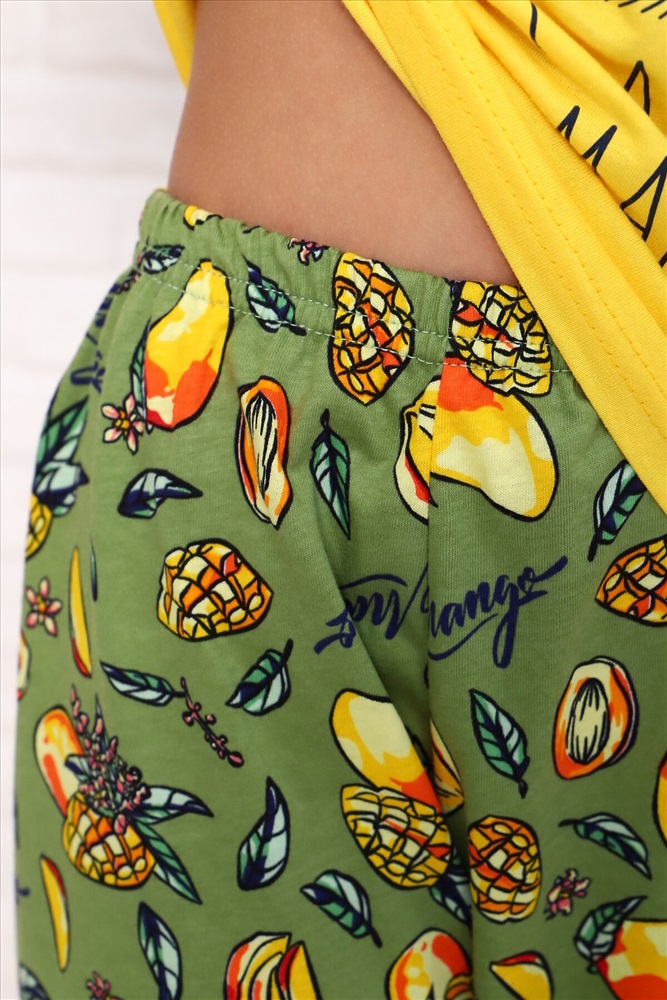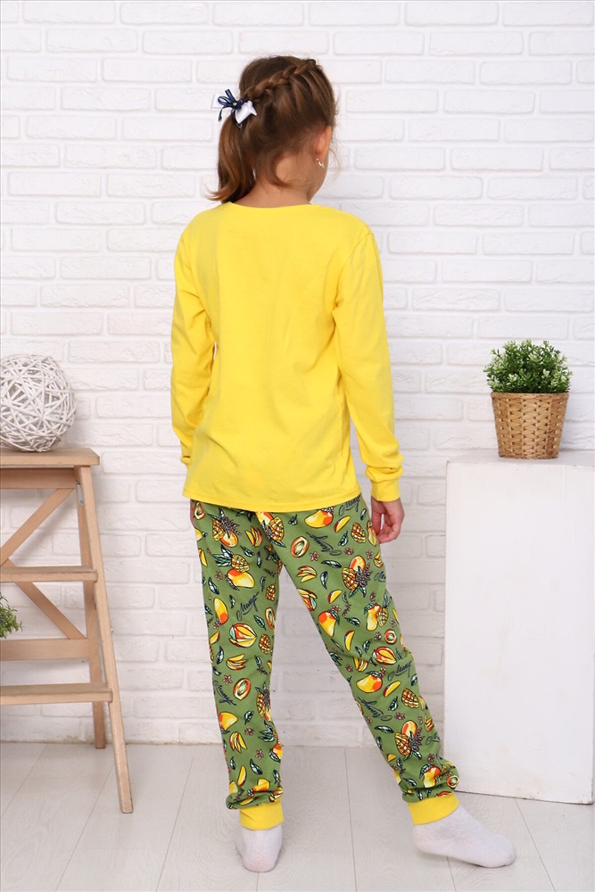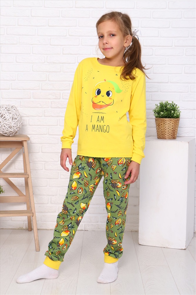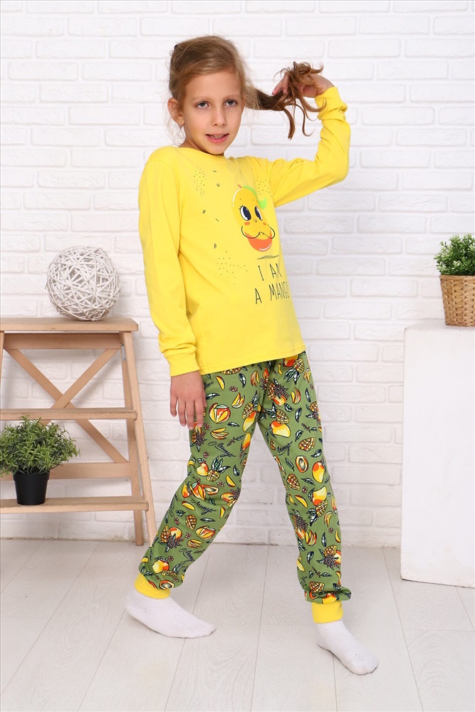 Страна производства: Россия Пижама для девочек дошкольного, младшего и старшего школьного возраста, из набивного и однотонного трикотажных полотен кулирная гладь и эластичного трикотажного полотна - рибана. Пижама состоит из свободных брюк и лонгслива. Лонгслив выполнен из однотонного полотна, брюки из набивного.Манжеты рукавов и брюк и обтачка горловины выполнены из рибаны. Лонгслив прямого силуэта, с втачным рукавом. Спереди и на спинке отсутствуют линии членения. Рукав длинный, одношовный, на манжете. Горловина с обтачкой. По шву втачивания обтачки в горловину проложена отделочная строчка. Низ лонгслива подогнут. Брюки прямые, на манжетах. Верхний срез брюк подогнут с резинкой 2см. На переднюю часть лонгслива нанесен печатный рисунок.