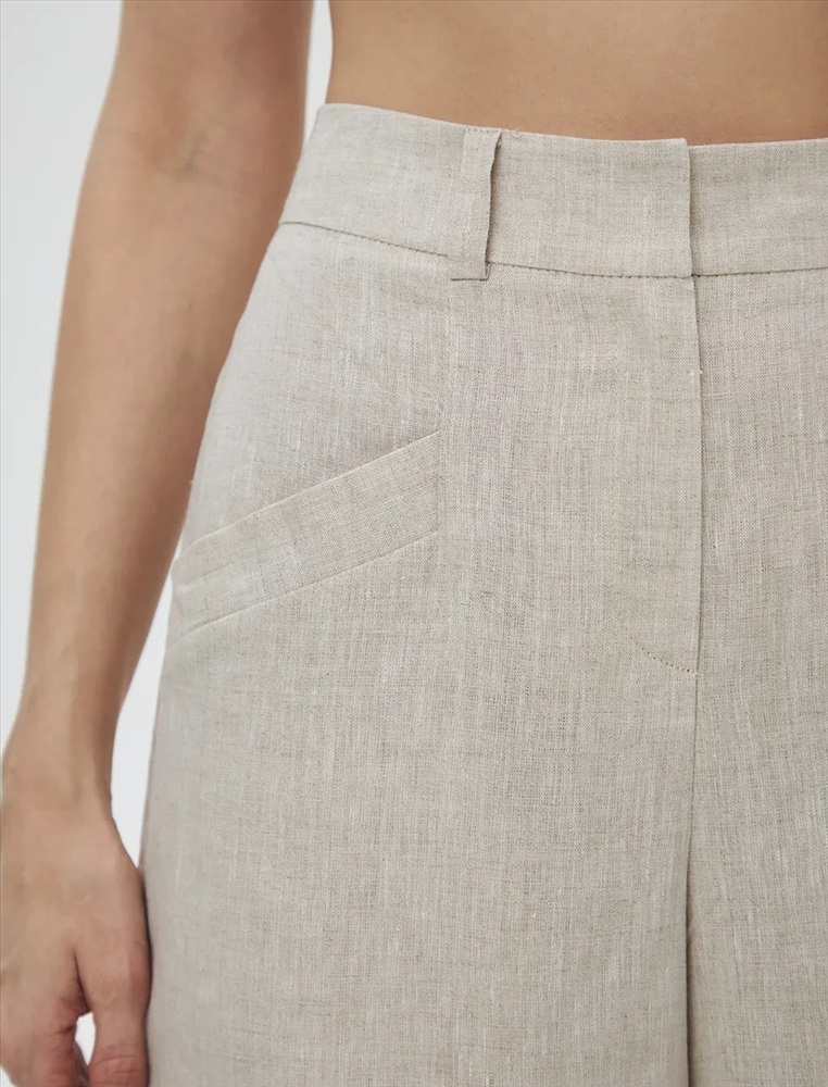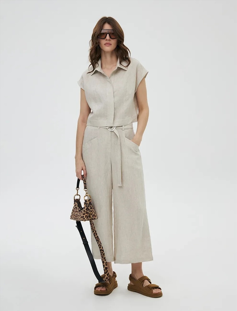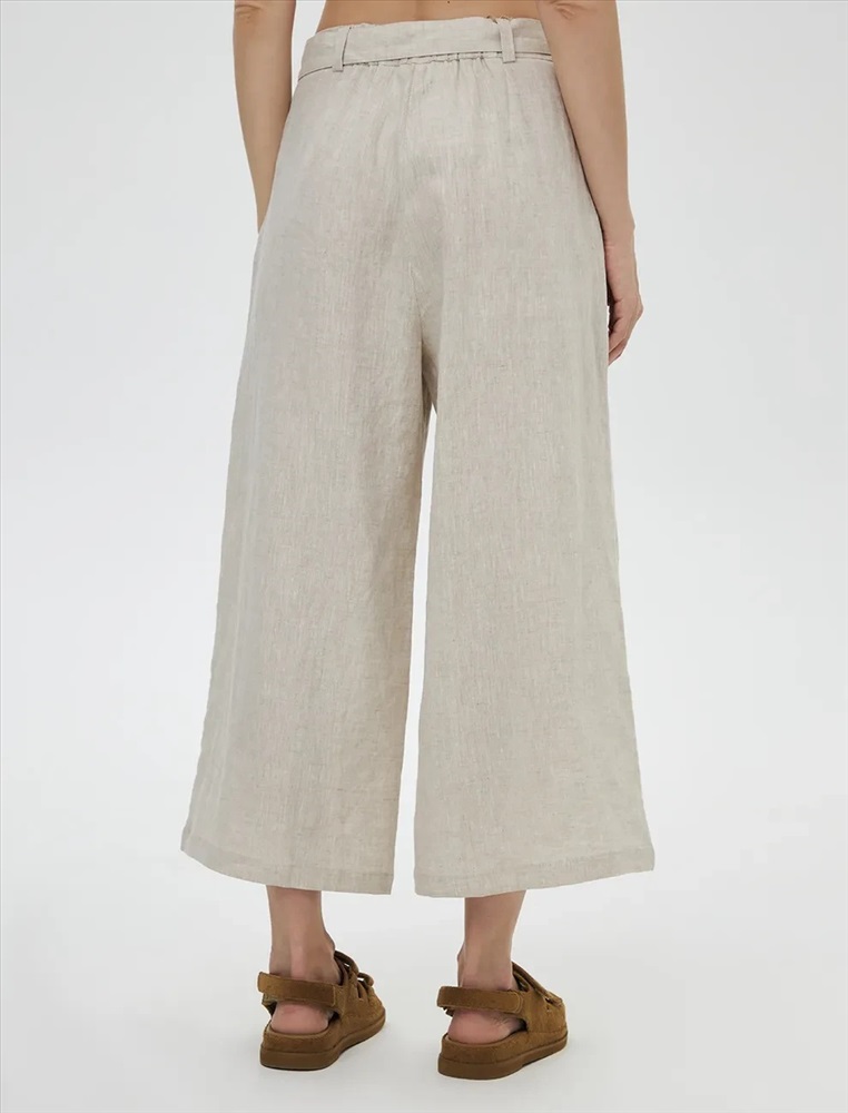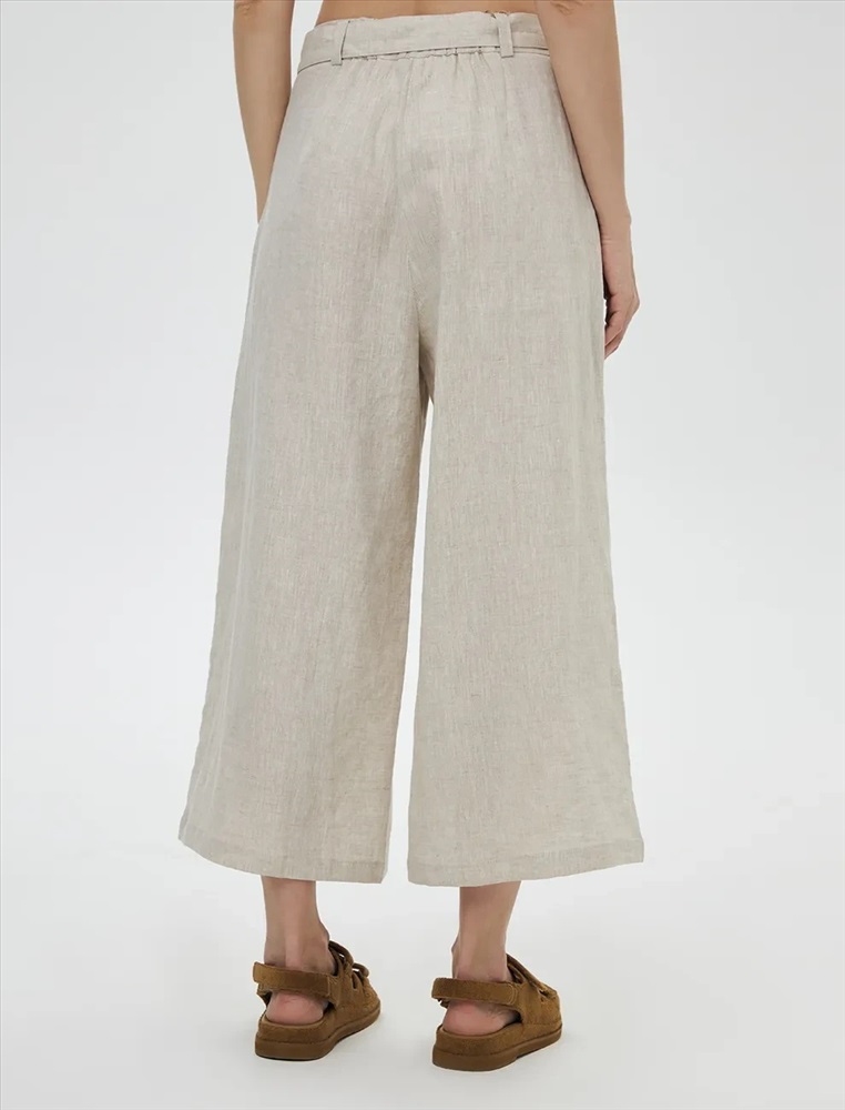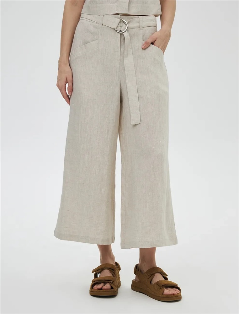 Брюки кюлоты высокой посадки. Акцентом изделия являются скошенные боковые карманы по переду. На поясе располагаются декоративные металлические полукольца, на спинке резинка, которая регулирует посадку.