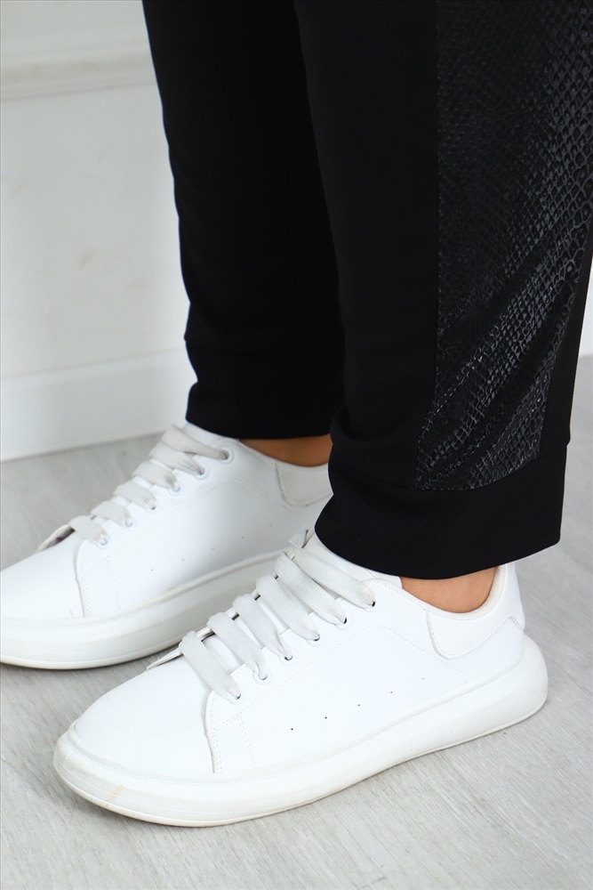 Застежка: без застежки Модель полуприлегающего силуэта со вставками по бокам, низ на широком манжете, основная ткань-креп, вставка из эко-кожи. Брюки изготовлены из трикотажной ткани , которая хорошо тянется, удобна в носке, выдерживает многократные стирки. Замечательно сочетаются с любым верхом и обувью, подойдут и к классическому стилю, и к спортивному.
