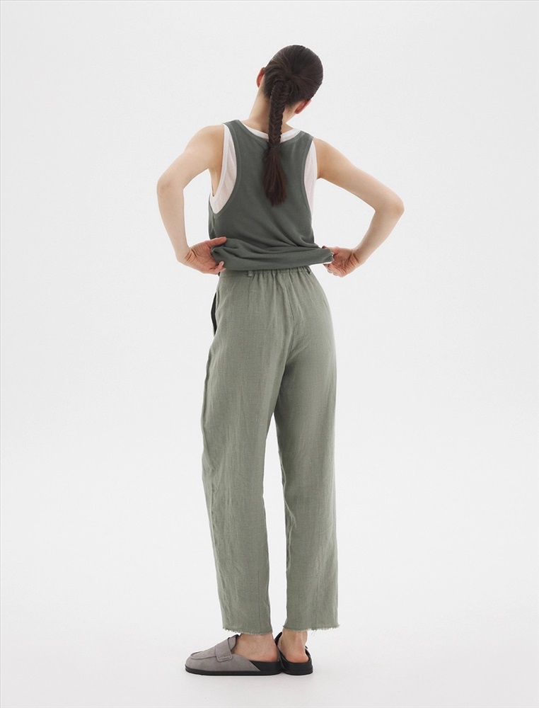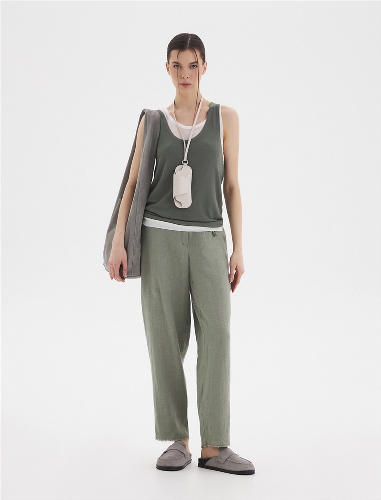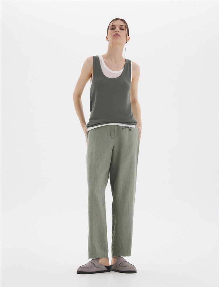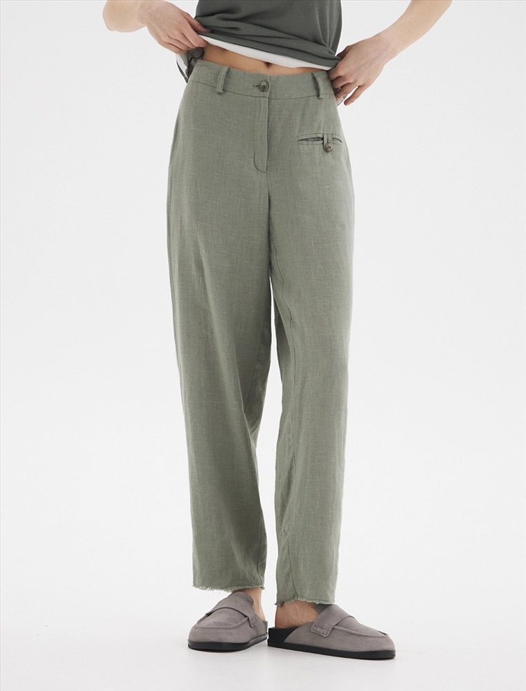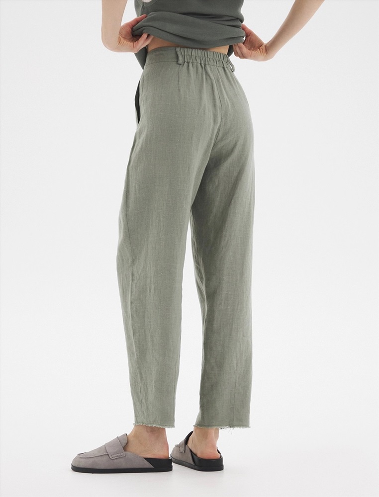 Брюки зауженного к низу силуэта, с поясом со шлевками. По передней части изделия расположен гульфик с застежкой на молнию и пуговицу. С левой стороны - карман в рамку с застежкой на пуговицу с помощью петли. По задней части брюк по поясу расположена резинка, для более комфортной посадки. Изготовлены из 100% льна.