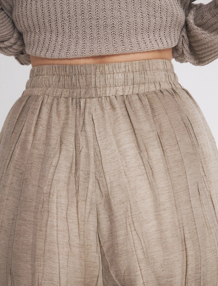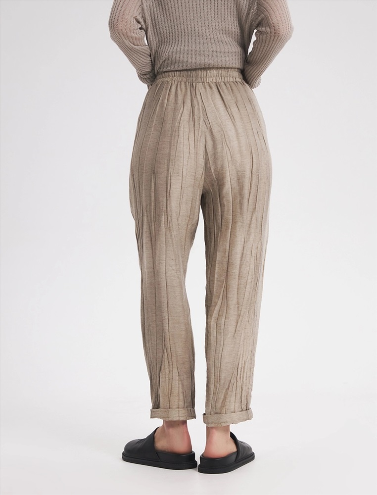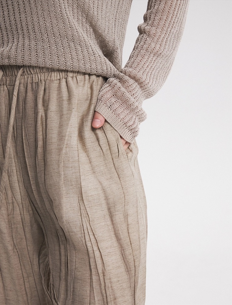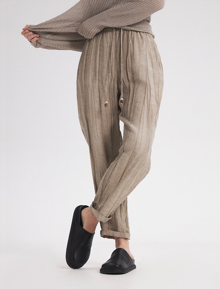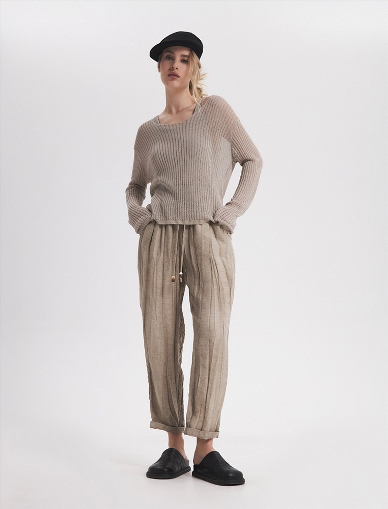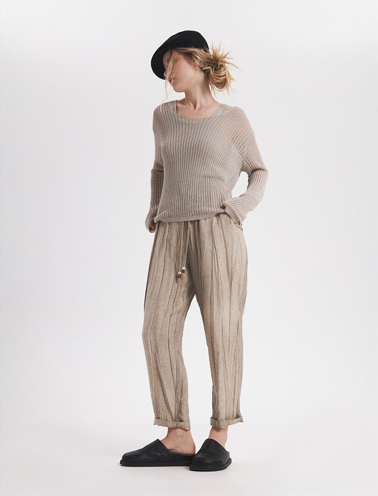 Видео: https-//hassfashion.ru/upload/iblock/f98/3ap3z1k0ofntq22rlwu985w3coh6ea5y.mp4 весна-лето 60% Лен, 40% Тенсел Брюки зауженного к низу силуэта с резинкой и затяжниками по поясу.