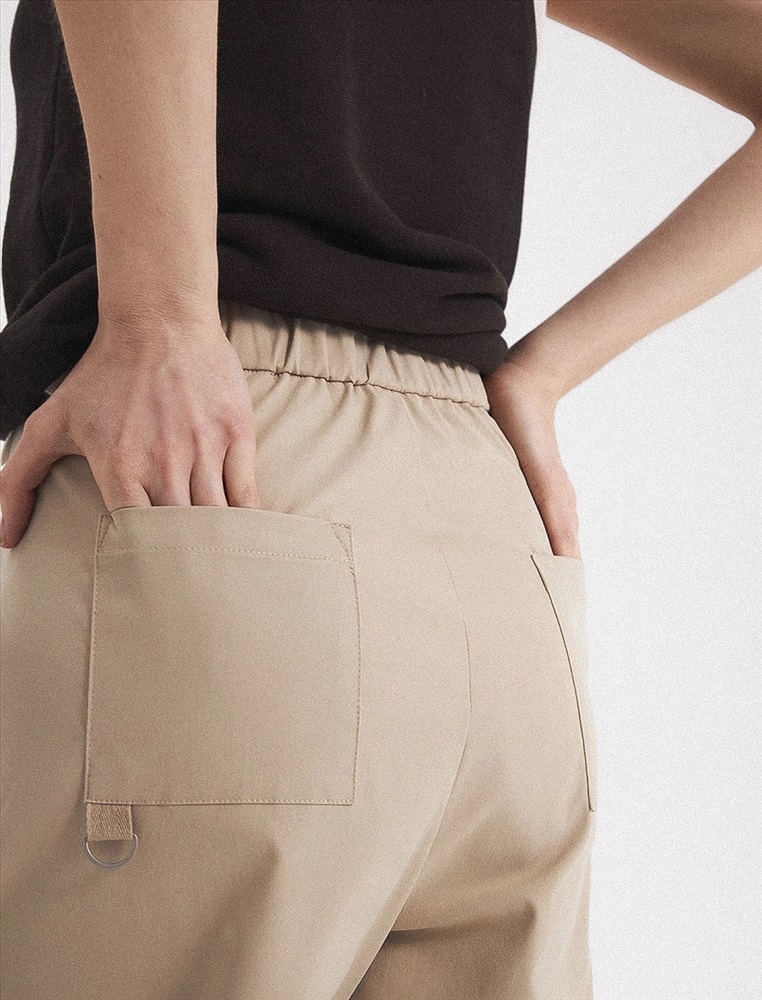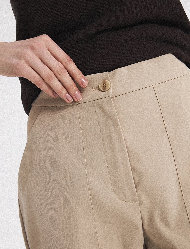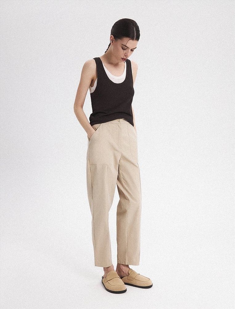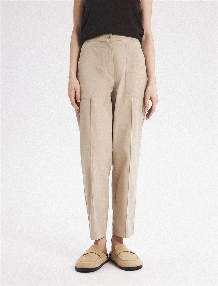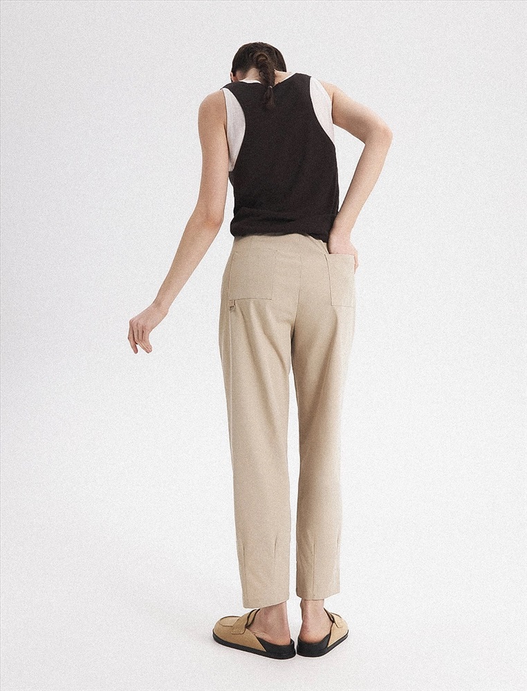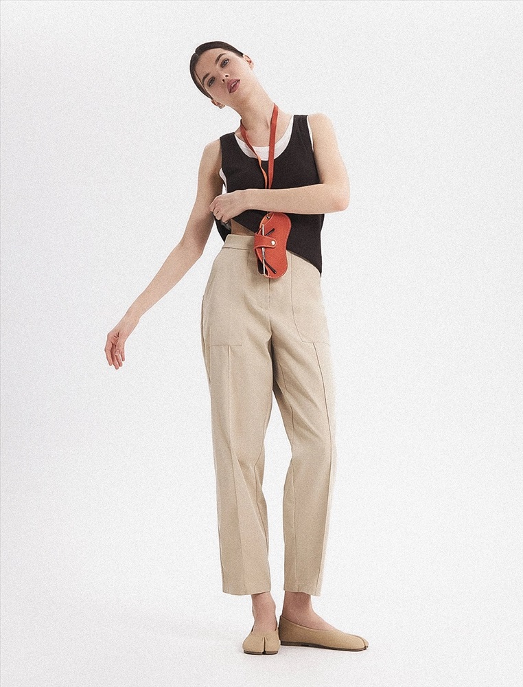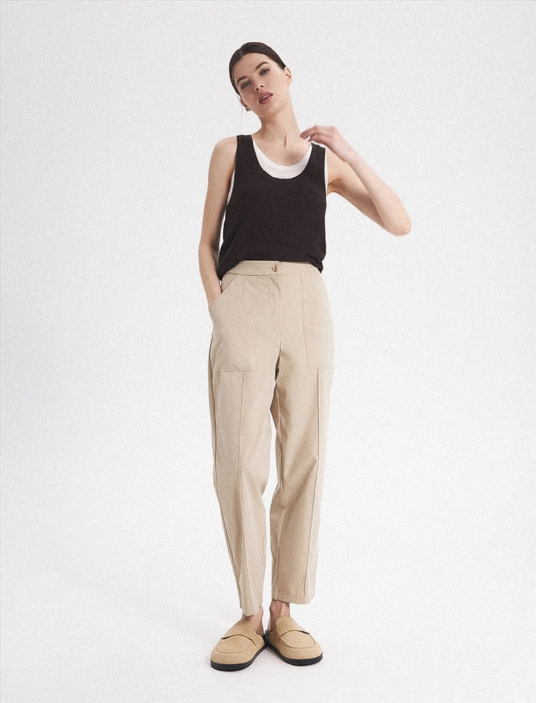 Брюки зауженного к низу силуэта. Спереди застежка на пуговицу, молнию и гульфик, а так-же накладные карманы и стрелки. Сзади квадратные накладные карманы, на одном из кото-рых полукольцо для ключей.
