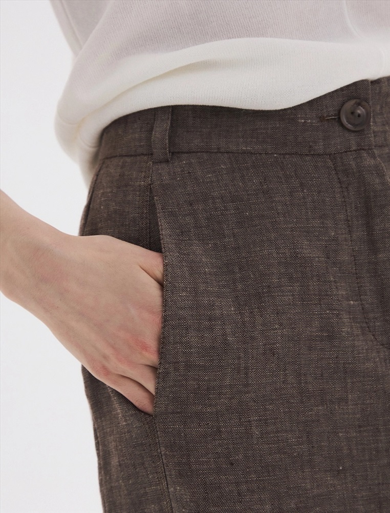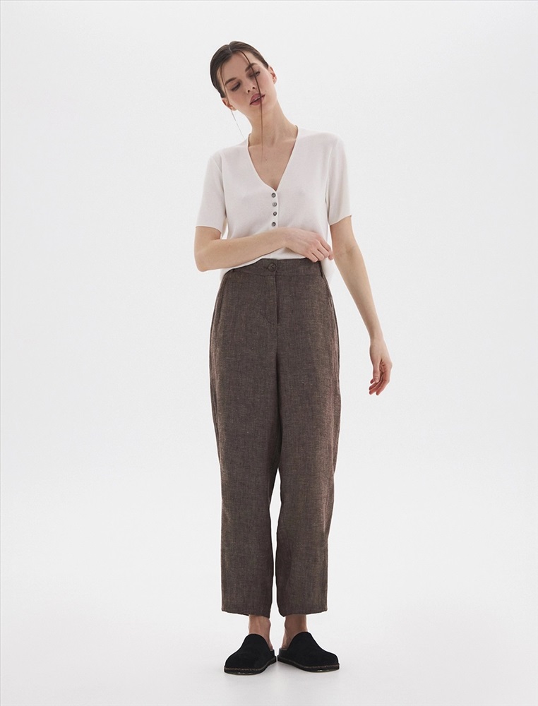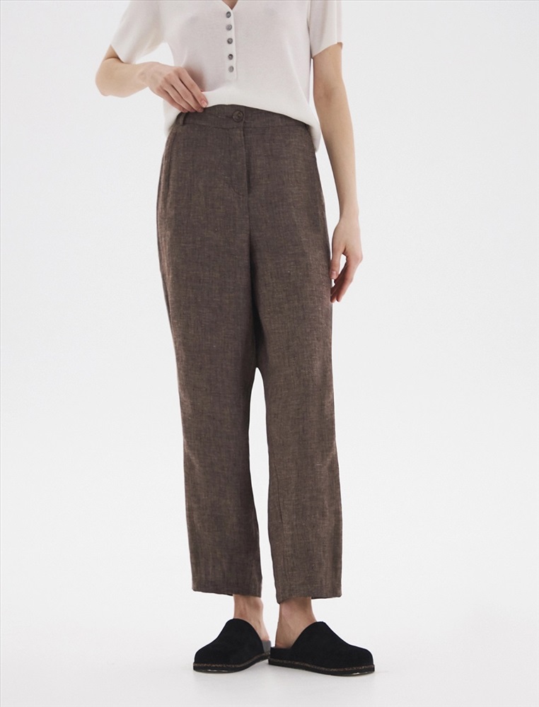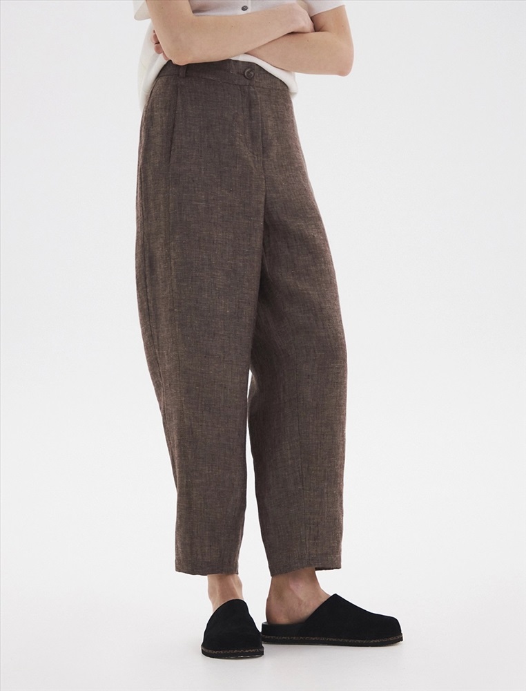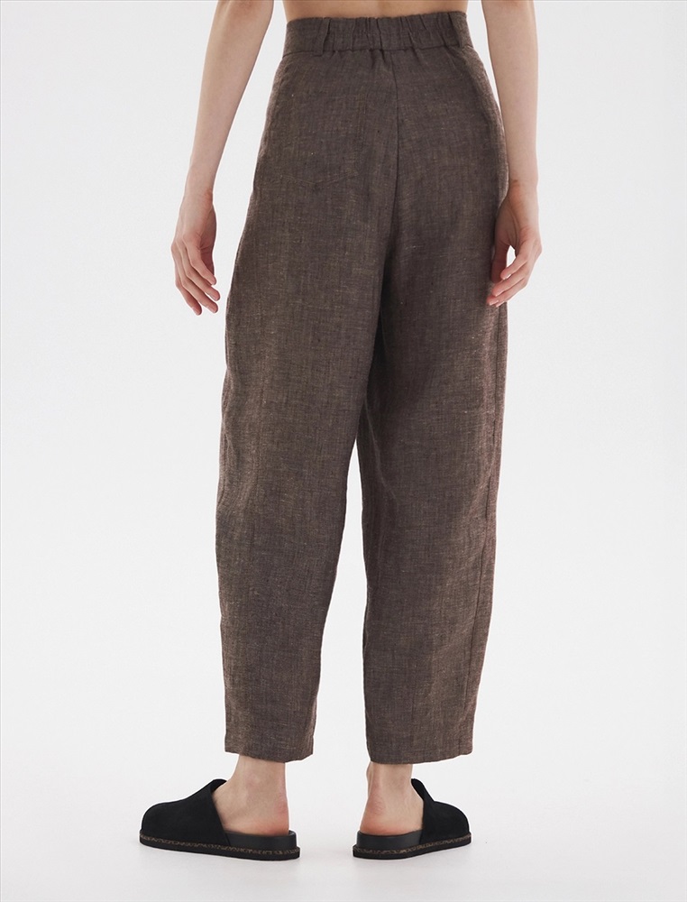 Брюки зауженного к низу силуэта, с поясом со шлевками. По передней части изделия расположен гульфик с застежкой на молнию и пуговицу. На задней части брюк, с левой стороны расположен карман. По поясу резинка для более комфортной посадки.
