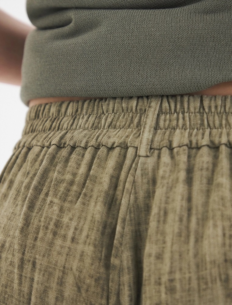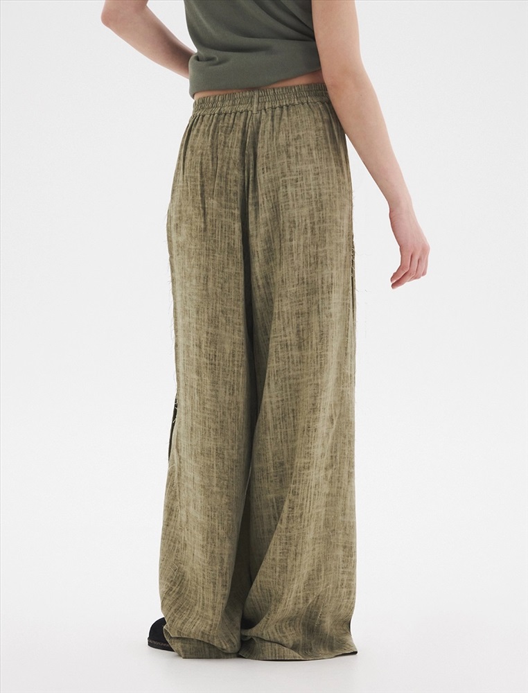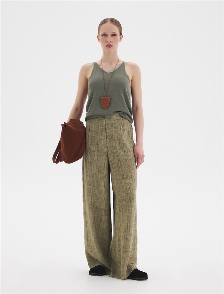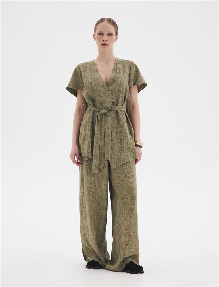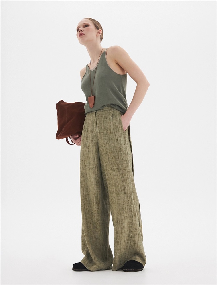 Видео: https-//hassfashion.ru/upload/iblock/af6/dncrip0y367t2f0onzu0kwuck90gwdvt.mp4 весна-лето 75% Лен, 25% Район Брюки-палаццо прямого силуэта. По передней части изделия застежка на пуговицу и молния с гульфиком. Выполнены изо льна и района.