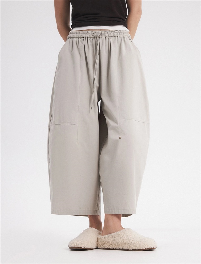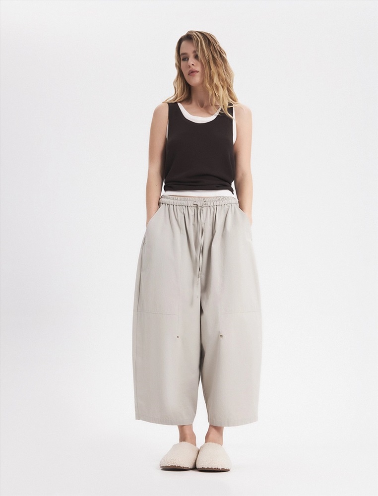 Видео: https-//hassfashion.ru/upload/iblock/ba8/n06vfydex0ei9pr18cfnavqcc2chb1qr.mp4 весна-лето 90% хлопок, 10% спандекс Широкие укороченные брюки с резинкой и затяжниками по поясу.