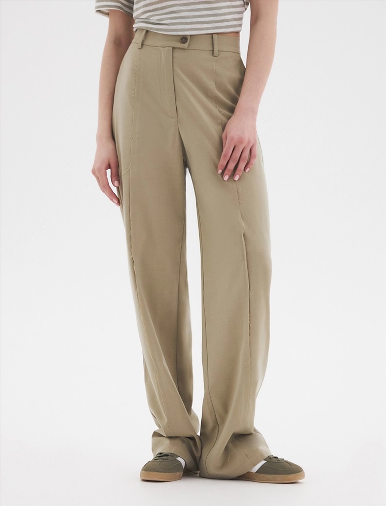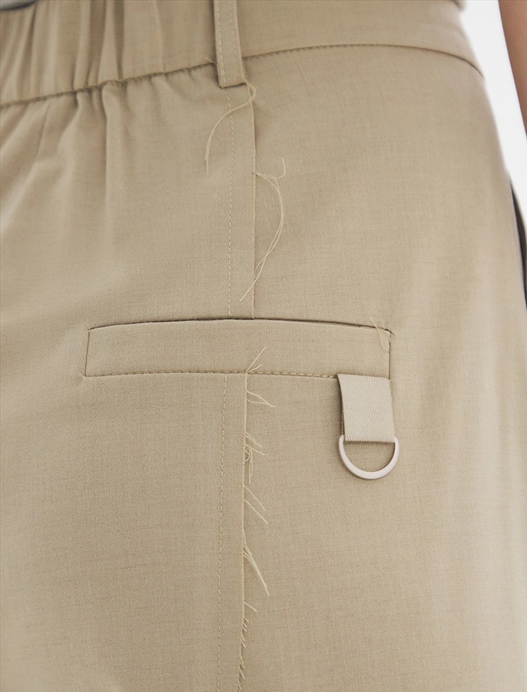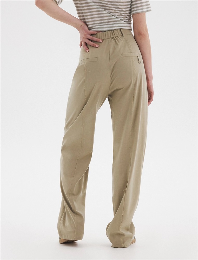 Брюки-палаццо прямого силуэта с поясом и шлевками. По передней части - гульфик с за-стежкой на молнию и пуговицу. А также резы с оранжевым эффектом. По бокам — карма-ны. Сзади карманы с листочкой, на одном из которых декоративное полукольцо По поясу — резинка.