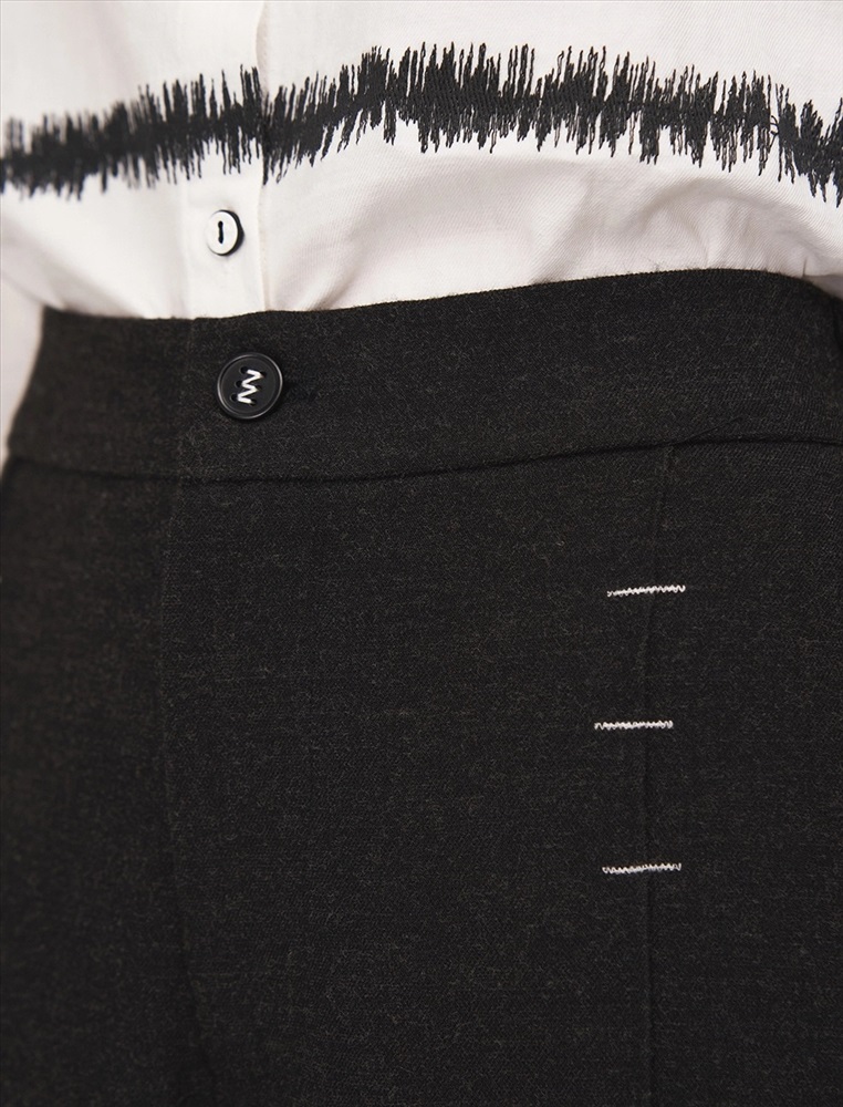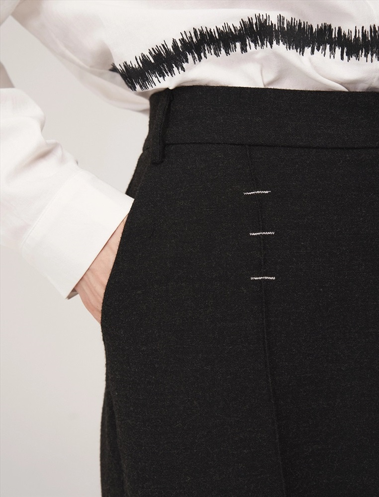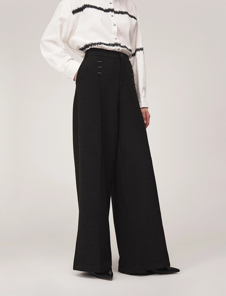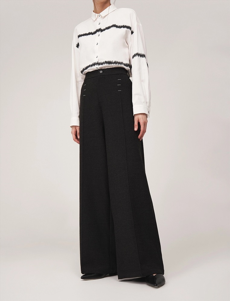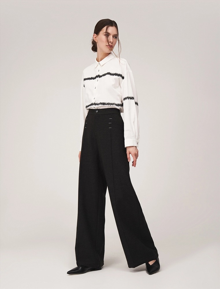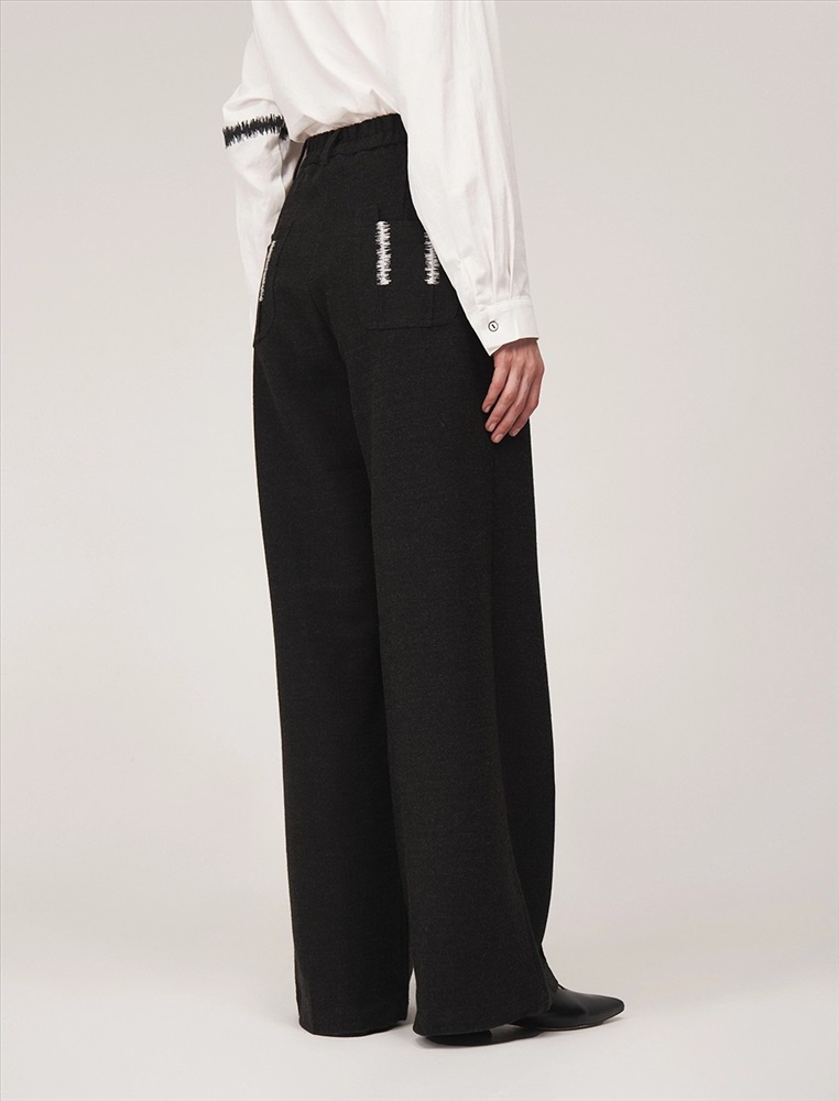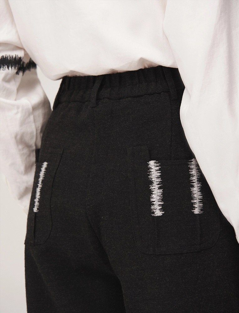 Брюки широкие с посадкой на уровне талии. Спереди классический гульфик и застежка на молнию. По бокам врезные карманы. По поясу шлевки. По передней части вертикальные застроченные складки, на которых, на уровне бедер, расположены контрастные вышивки, визуально напоминающие закрепки. По задней части накладные карманы с контрастной вышивкой и эластичная резинка по поясу.