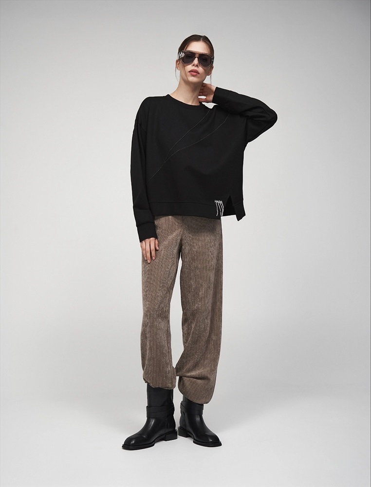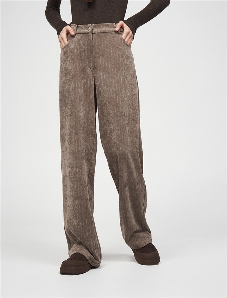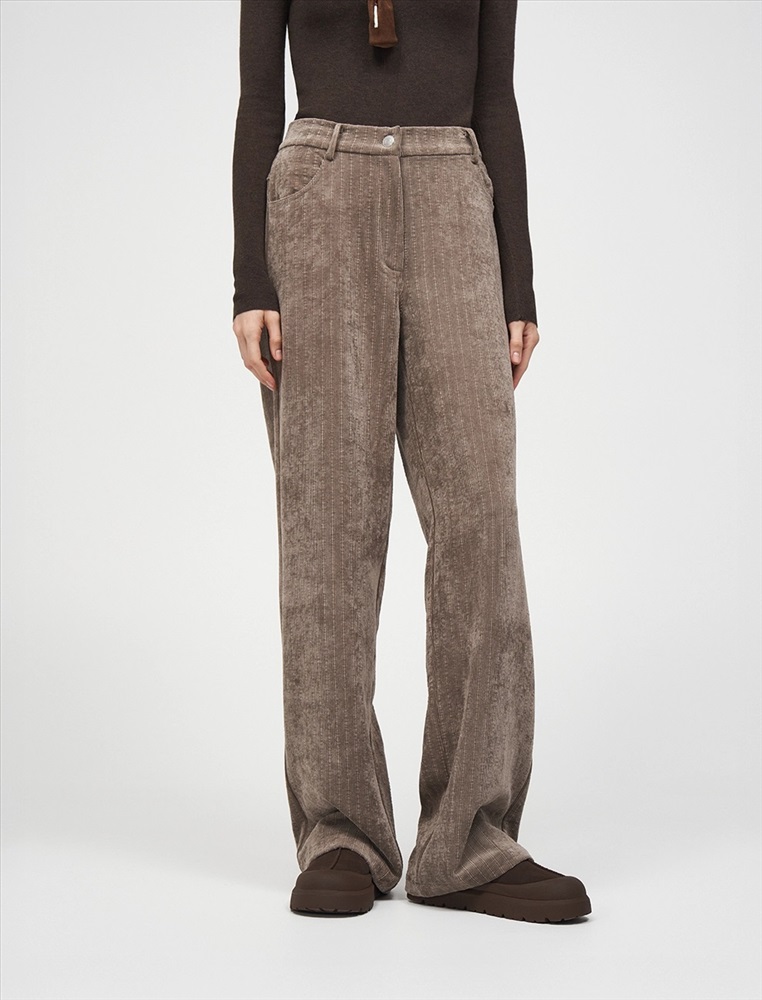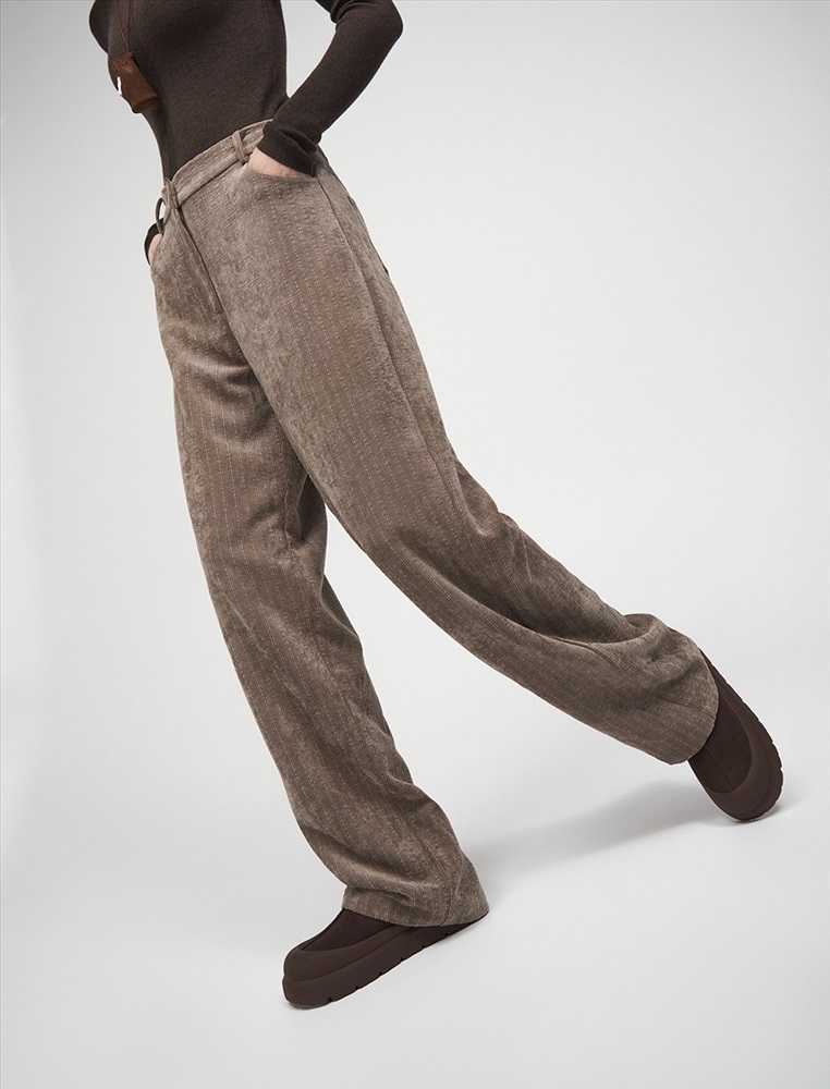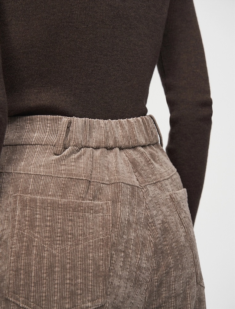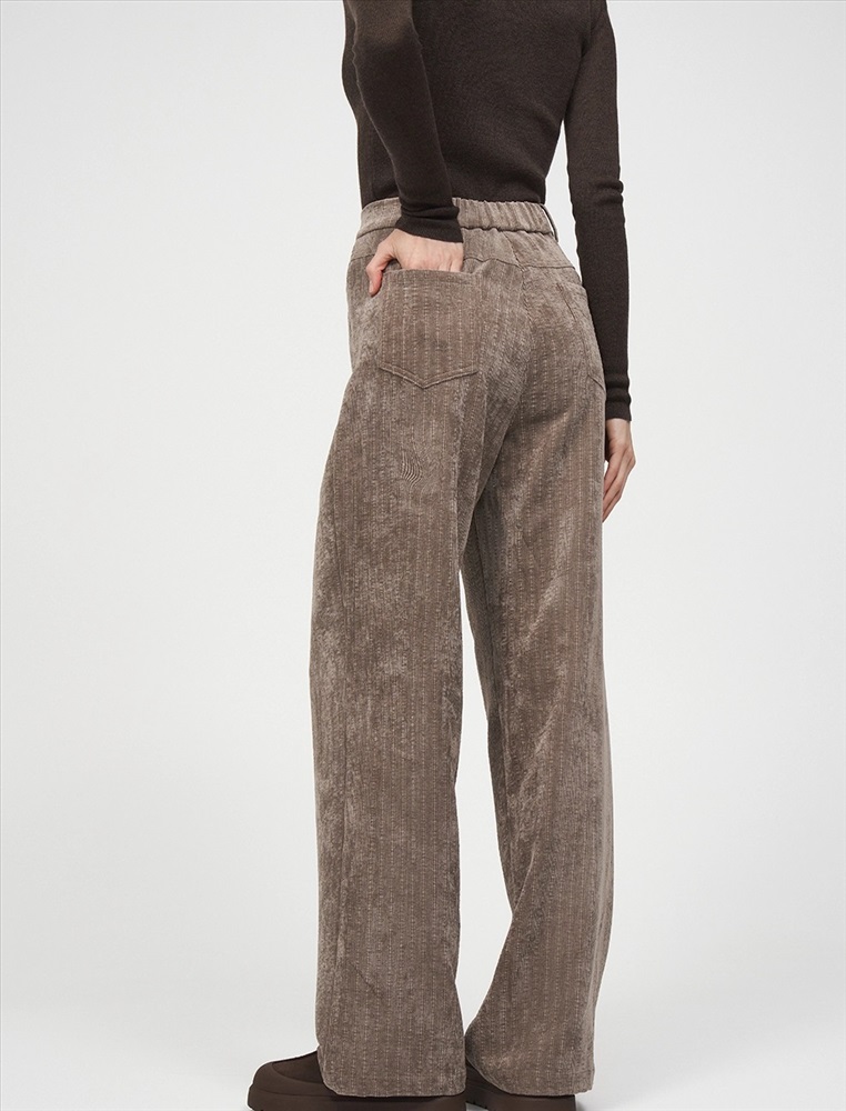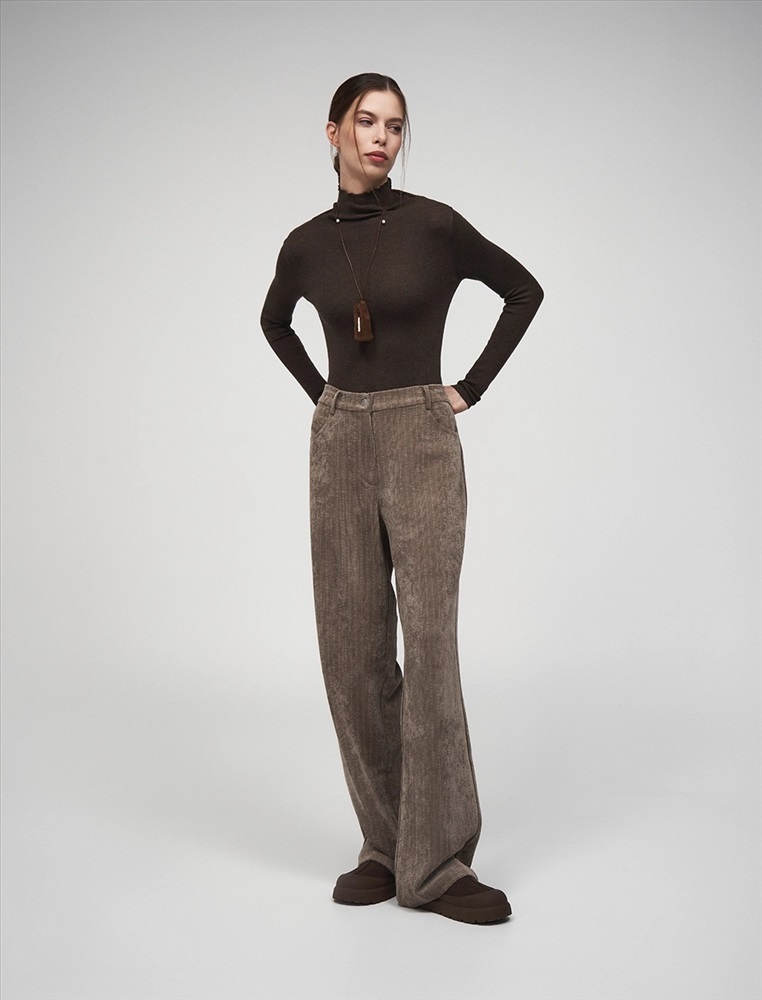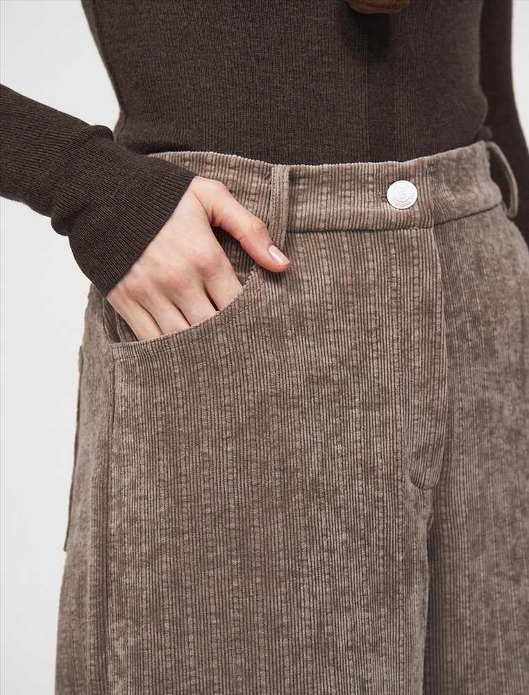 Вельветовые брюки прямого силуэта с посадкой на уровне талии. По передней части изделия — классический гульфик и застежка на пуговицу. По бокам врезные карманы. По задней части — кокетка, накладные карманы и встроенная в пояс резинка, для лучшей посадки по фигуре. По всему поясу расположены шлевки. Выполнены из хлопка (70%), терилена и вискозы. Представлены в коричневом оттенке.