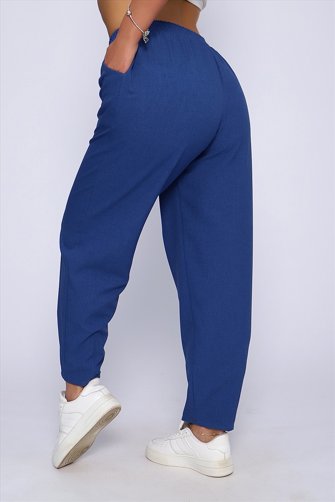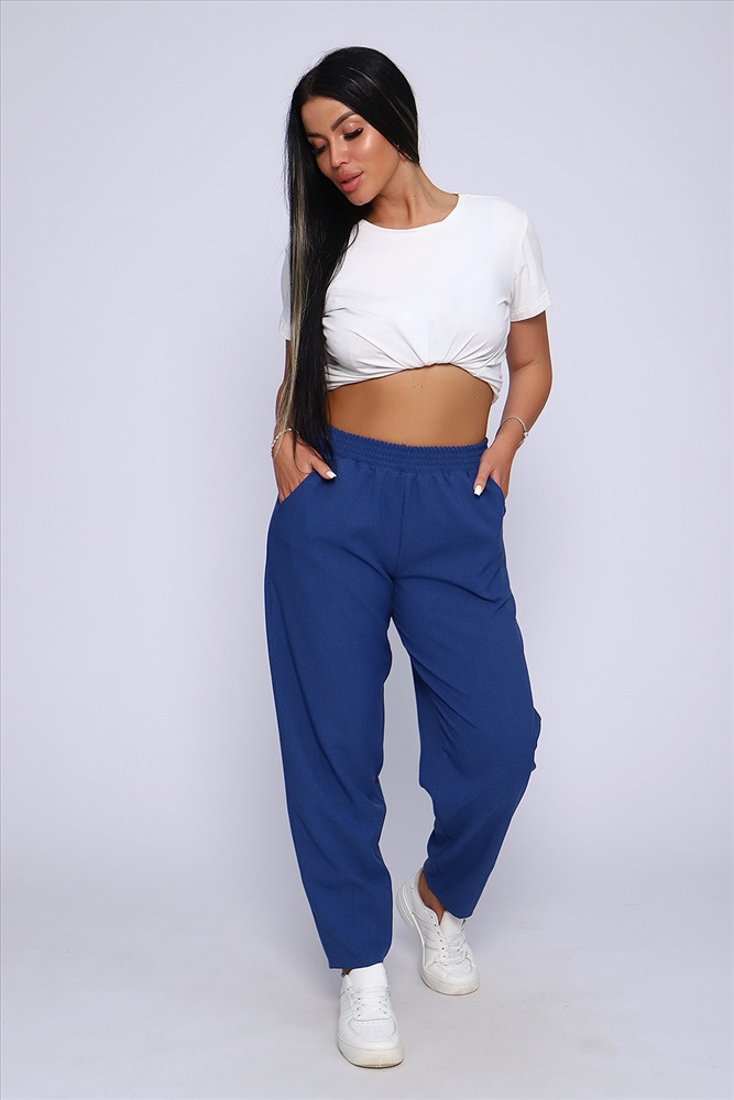 Застежка: без застежки Модные женские брюки-бананы из смесовой ткани с содержанием льна. Свободные, зауженные к низу с помощью вытачек, широкий пояс на резинке, по бокам внутренние карманы. Длина брюк до щиколотки (рост модели 165 см). Очень комфортны и удобны в носке, не мнутся, отлично смотрятся со спортивной обувью. Обхват резинки в растянутом виде: 46р - 98см, 48р - 100см, 50р - 102см, 52р - 104см, 54р - 106см, 56р - 108см