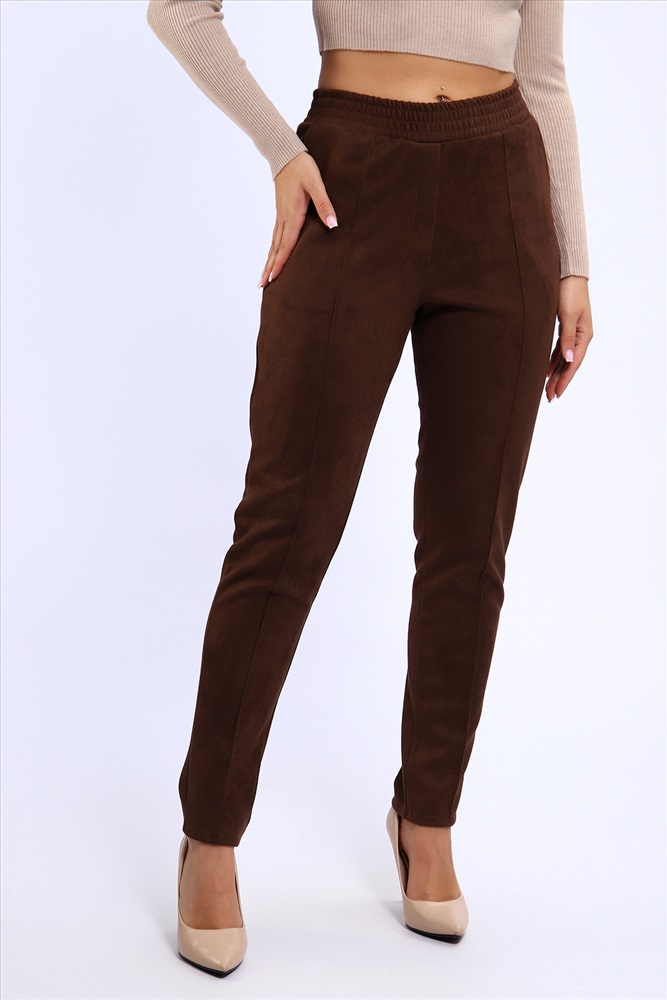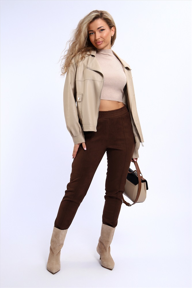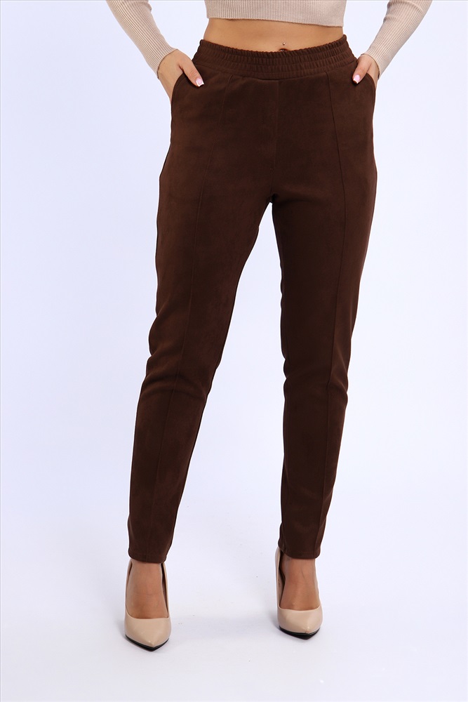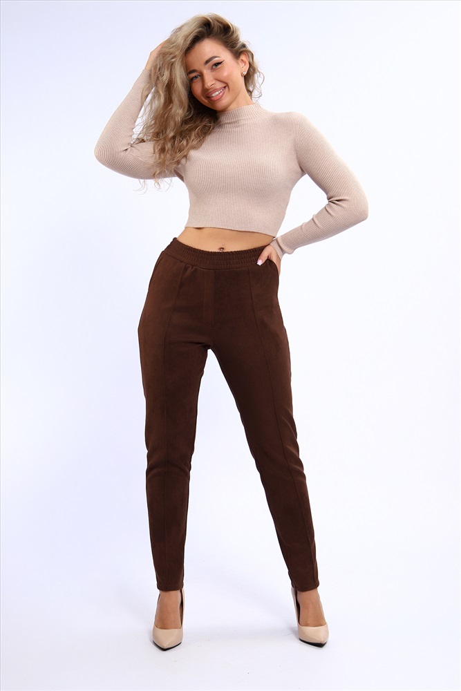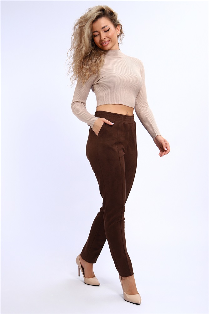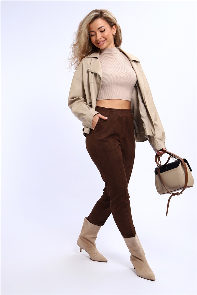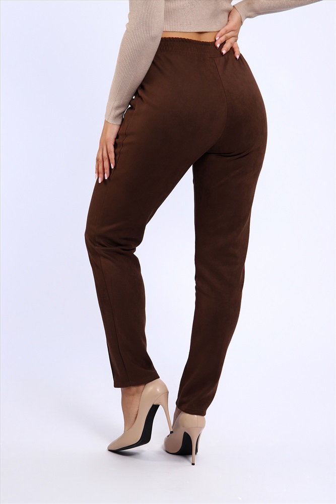 Застежка: без застежки Удобные и практичные брюки из экозамши на все случаи жизни. Искуственая замша имеет приятную бархатистую поверхность, очень плотная, влагоустойчивая, хорошо тянется, проста в уходе. Брюки из этой ткани будут незаменимы в прохладное время года для прогулок и для офиса. Брюки прилегающего силуэта, средняя посадка, на передних половинках прострочены стрелки и обработана имитация гульфика. Удобный пояс на резинке, по бокам внутренние карманы. Брюки будут хорошо смотреться с обувью на каблуке и без каблука. Тем , кто желает более плотного прилегания по фигуре, советуем брать размер поменьше. В замерах обхват талии соответствует длине резинки в растянутом виде. Утюжить изделие лучше с изнанки или через ткань.