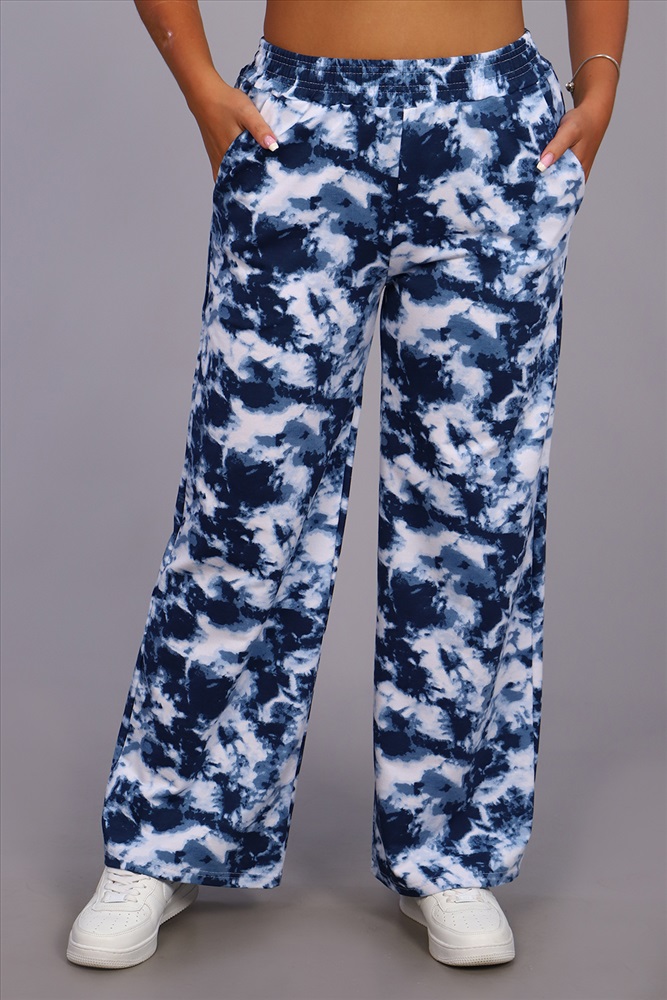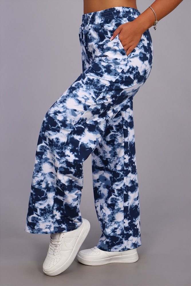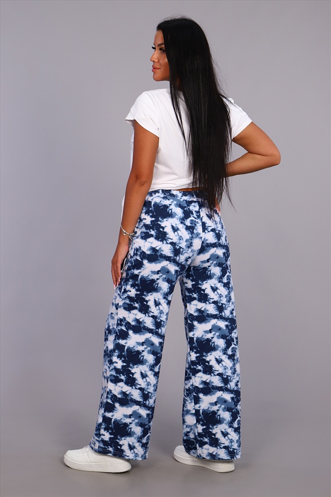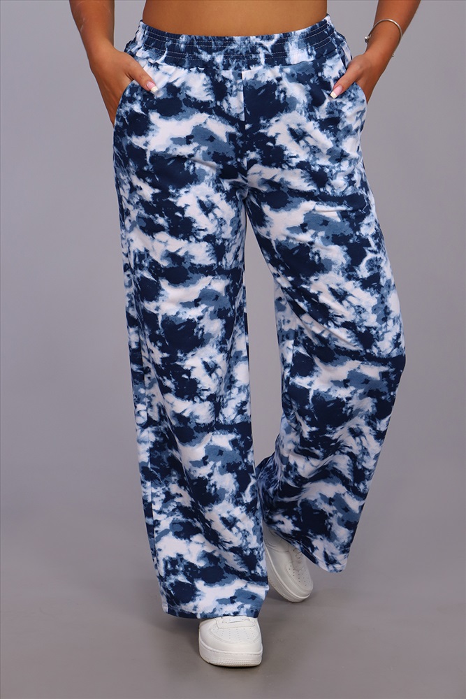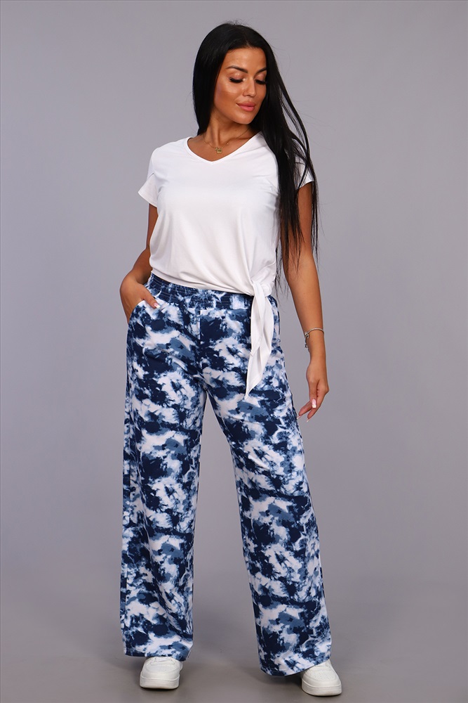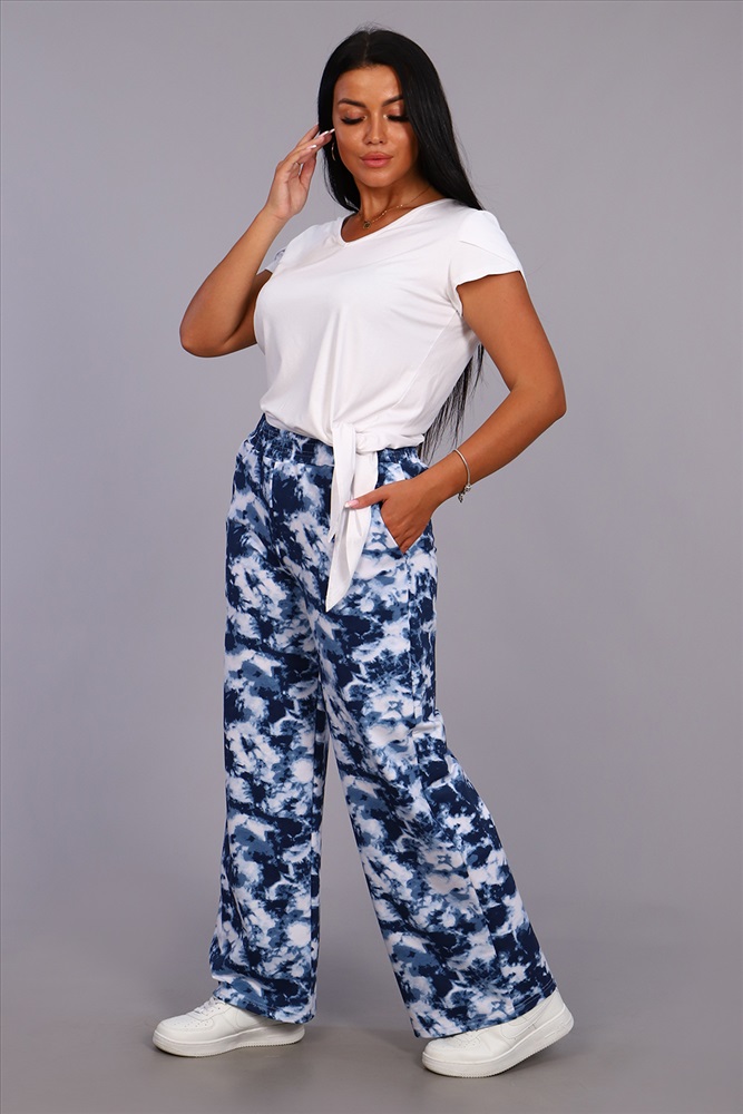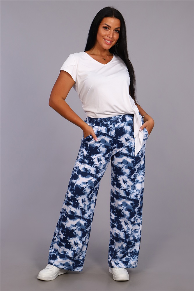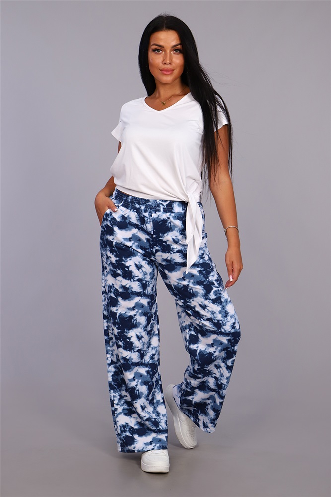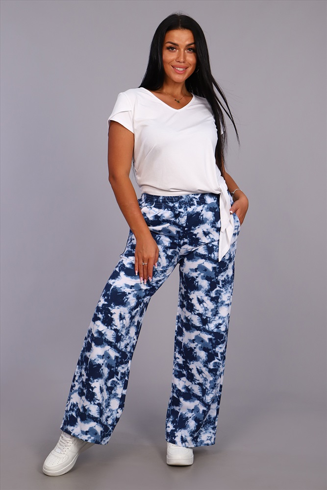Застежка: без застежки Женские модные брюки-палаццо выполнены из футера в стиле тай-дай. Тай-дай стал настолько большим феноменом, что даже смог проникнуть в уличную и высокую моду, где совершенно не затерялся и получил множество интересных интерпретаций. Высокая удобная посадка, вместительные боковые карманы и качественно обработанный на специальной машине пояс - все это позволит Вам чувствовать себя максимально комфортно. В брюках такого плана Вы будете выглядеть неординарно, модно и стильно.