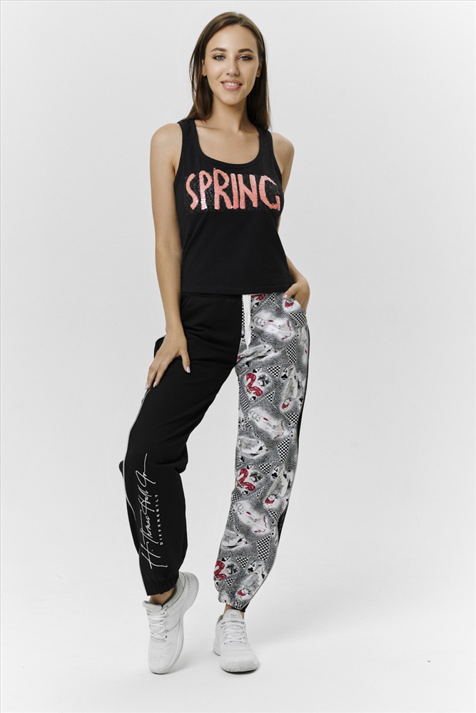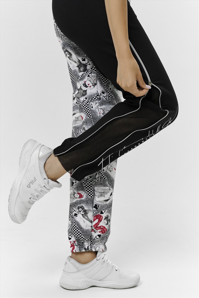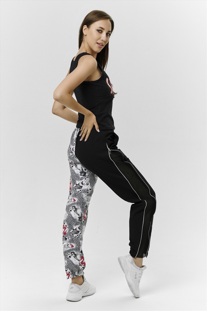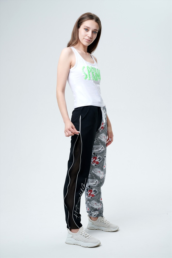 Застежка: без застежки Брюки молодежные выполнены в технике COLOR BLOCKING с сеткой и молниями в боковых швах, на правой передней половинке брюк модный принт. Низ брюк собран на широкую резинку.