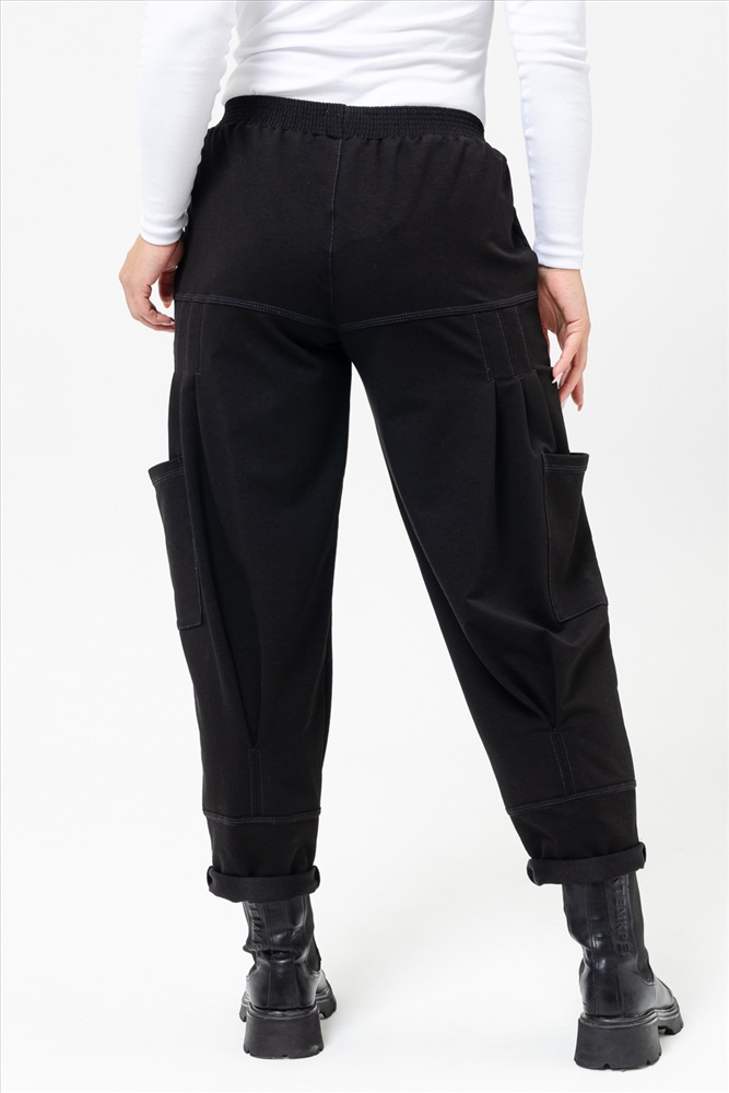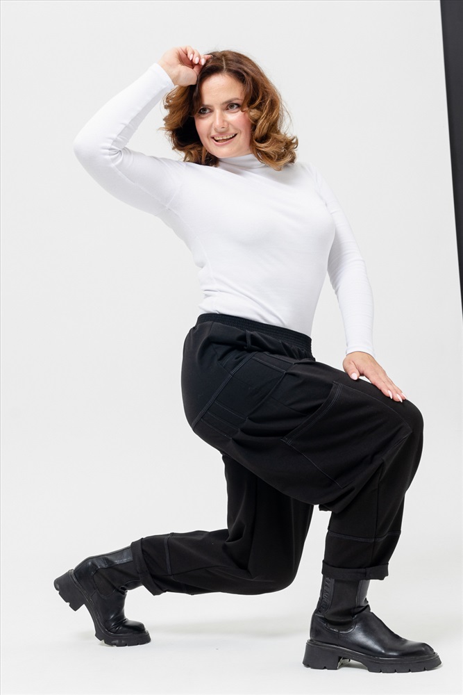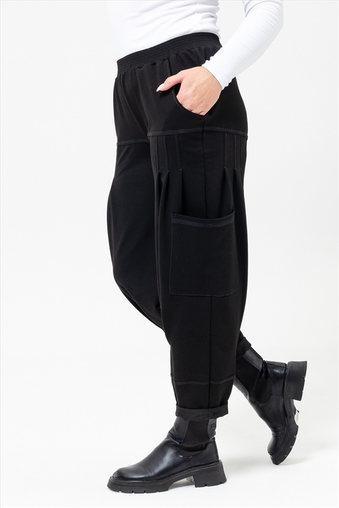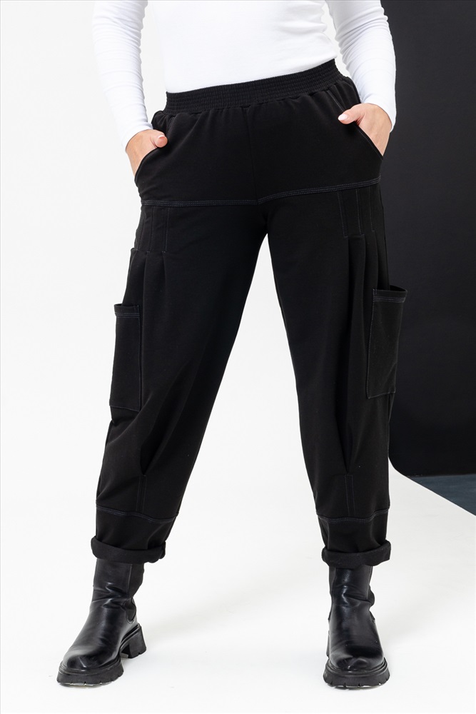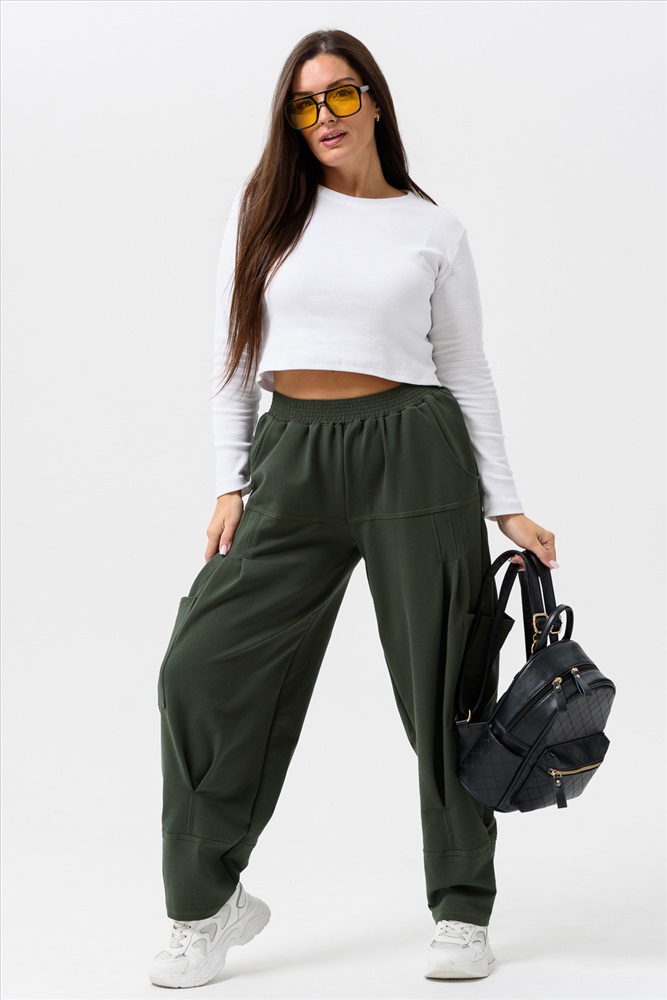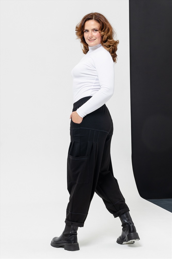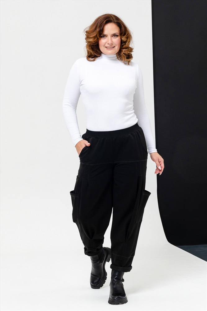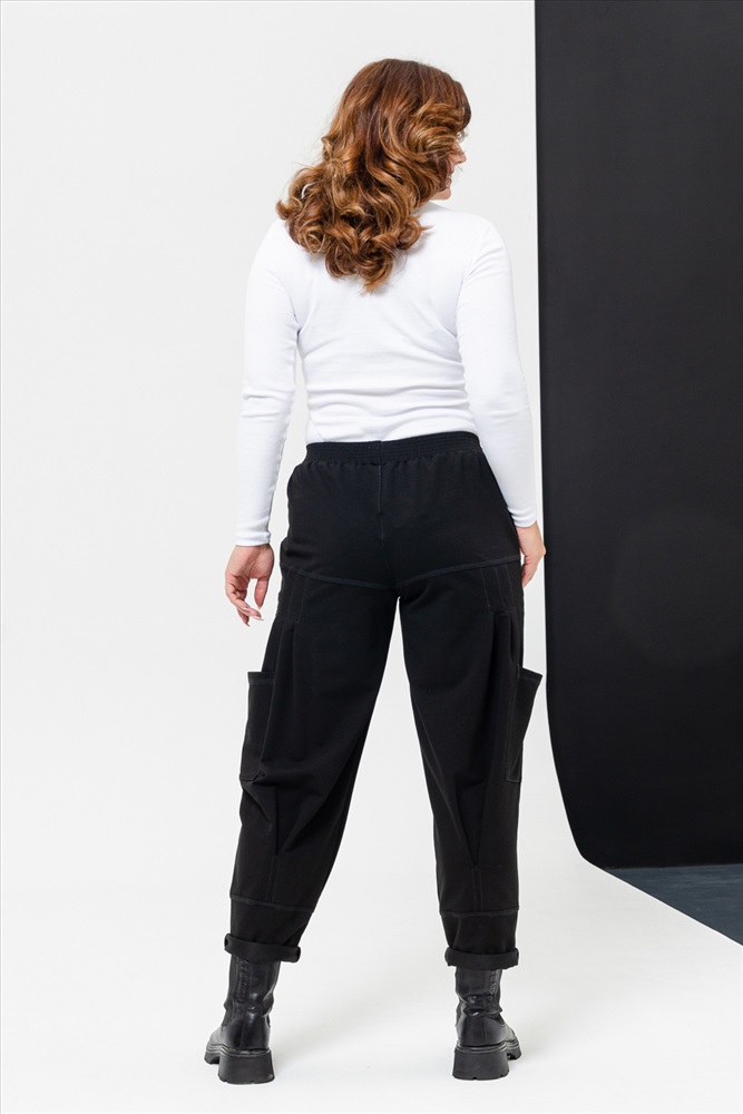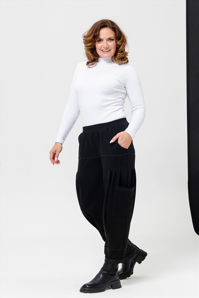Застежка: без застежки Брюки женские, бананы. Передние и задние части брюк из трех частей. В верхней передней части брюк внутренние карманы. В средней части брюк по три вертикальные складки и по-боковому накладные карманы. Конструкция брюк позволяет скрыть любые недостатки в области бедер.