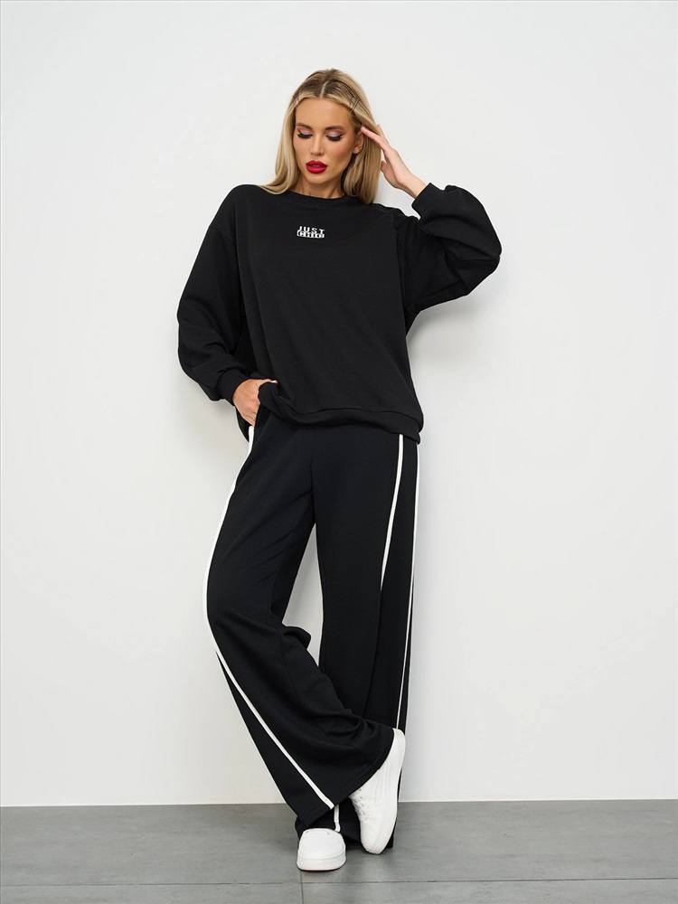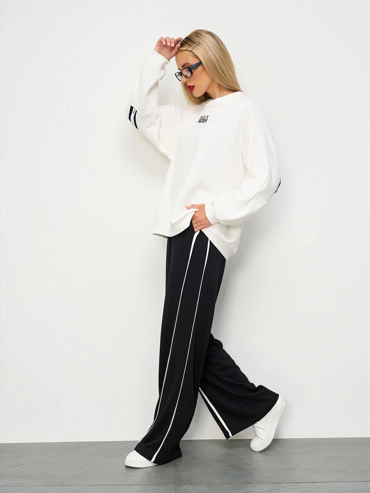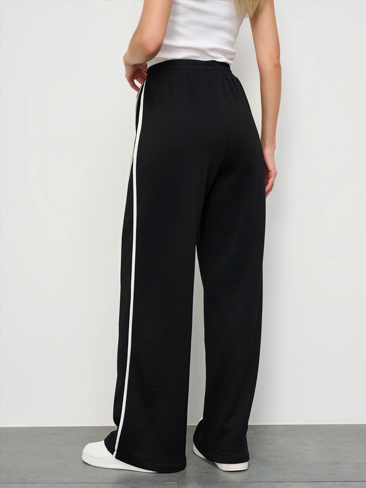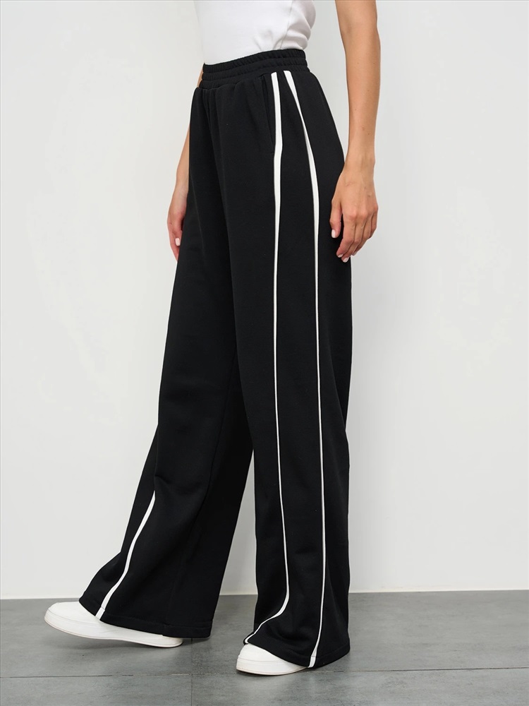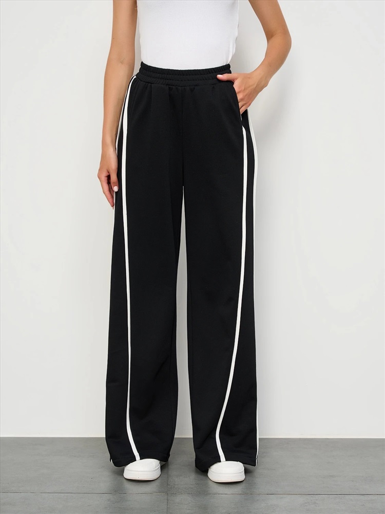 Широкие брюки с лампасами. Притачной пояс на резинке. В боковых швах карманы.