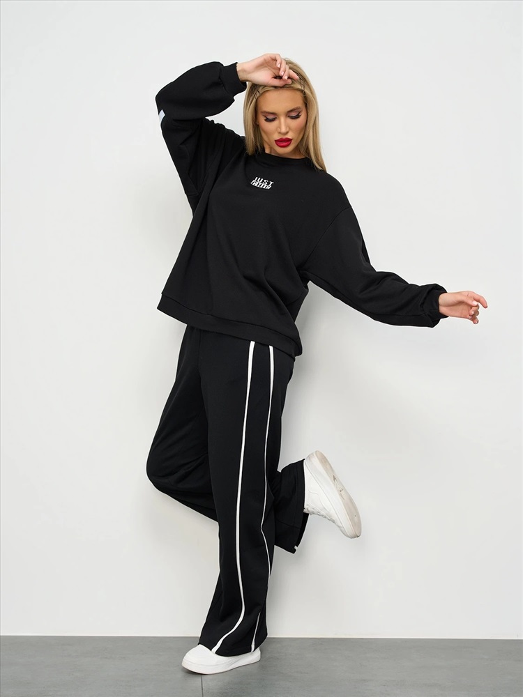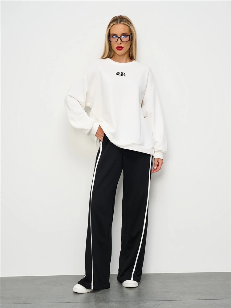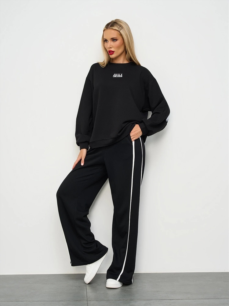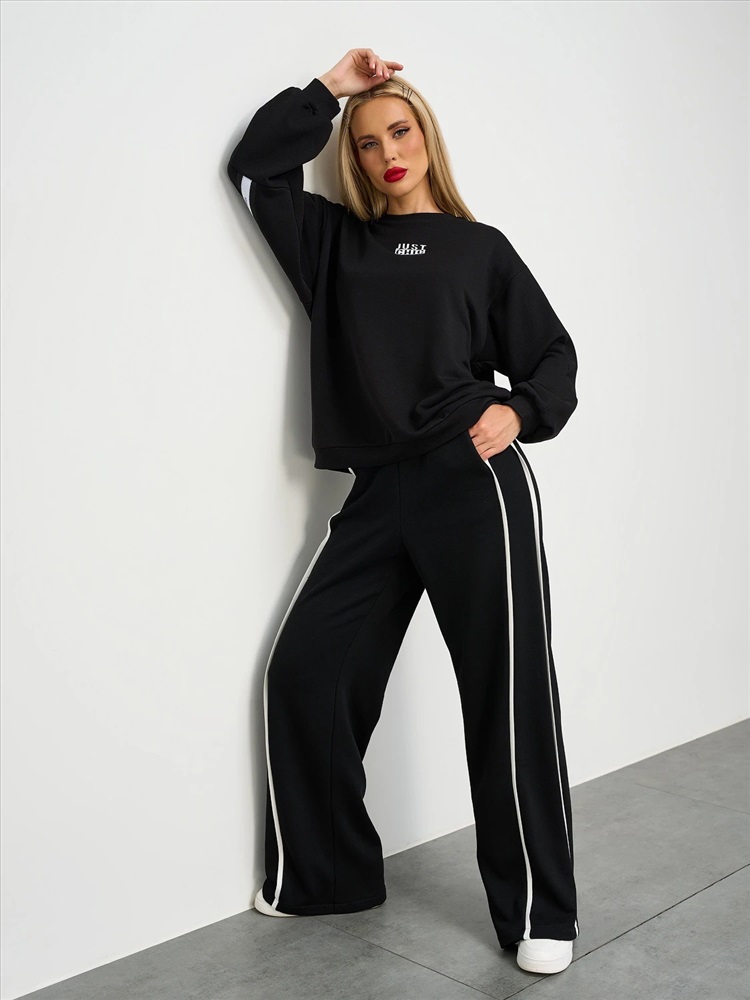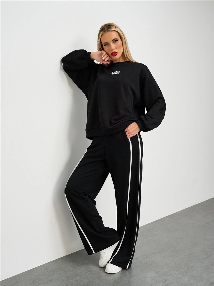 Широкие брюки с лампасами. Притачной пояс на резинке. В боковых швах карманы.