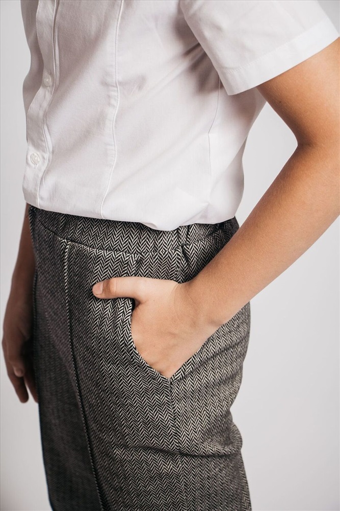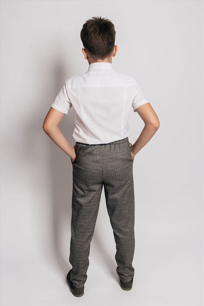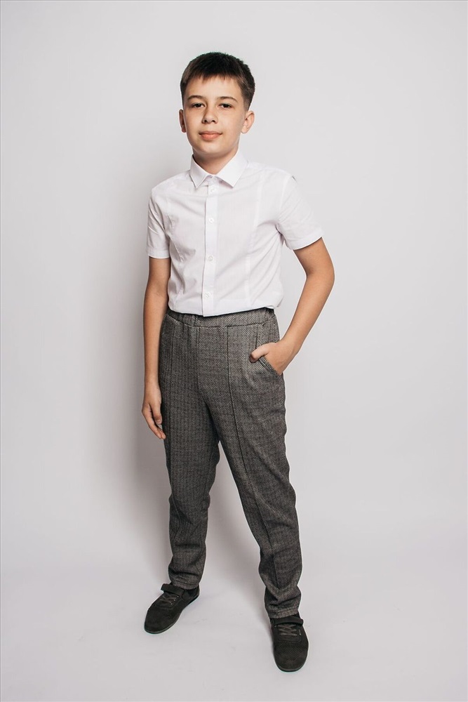 Брюки детские прямого силуэта, пояс отрезной, выполнен из основной ткани, с эластичной тесьмой внутри, тесьма закреплена в шов. На передней половинке брюк кант, который делит переднюю половинку на пополам. Низ изделия обработан швом вподгибку.