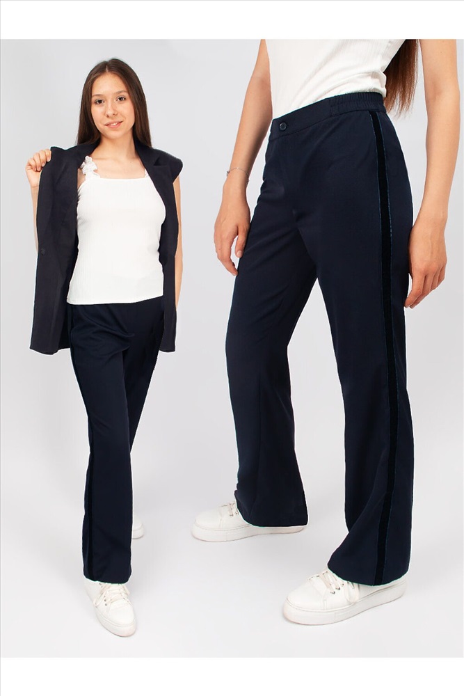 ID товара: 907913 Состав: 80% Полиэстер; 20% Вискоза Сезон: Весна/Лето Фасон: Прямой Посадка: Высокая Основная ткань: Полиэстер Стиль: Повседневный Вид ткани: Габардин Страна бренда: Россия Страна производства: Россия Элегантные, классические брюки для девочки СольПерец. Брюки декорированы бархатными лентами по бокам, в пояс вшита резинка. Брюки гармонично сочетаются с разнообразными блузками, водолазками и джемперами. Комментарии к товару