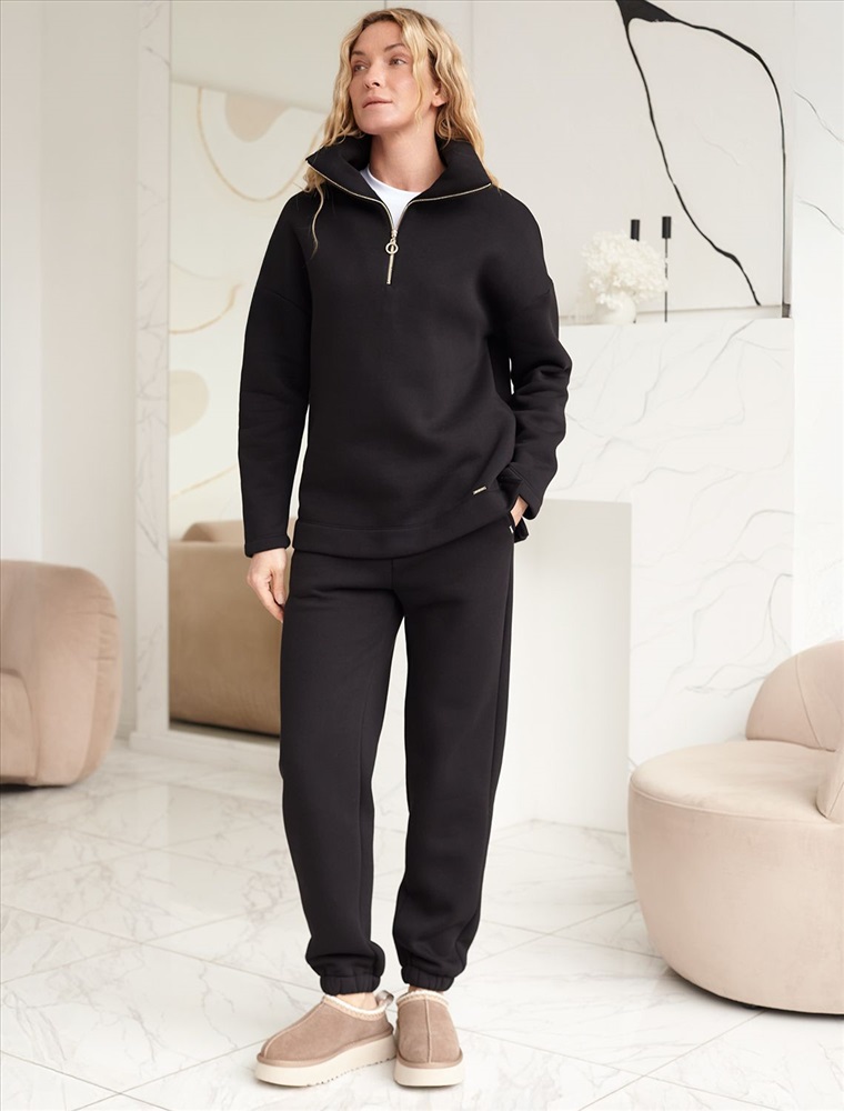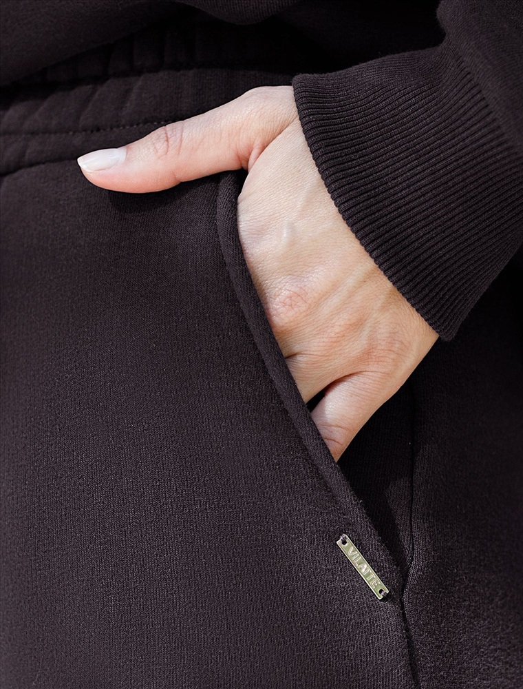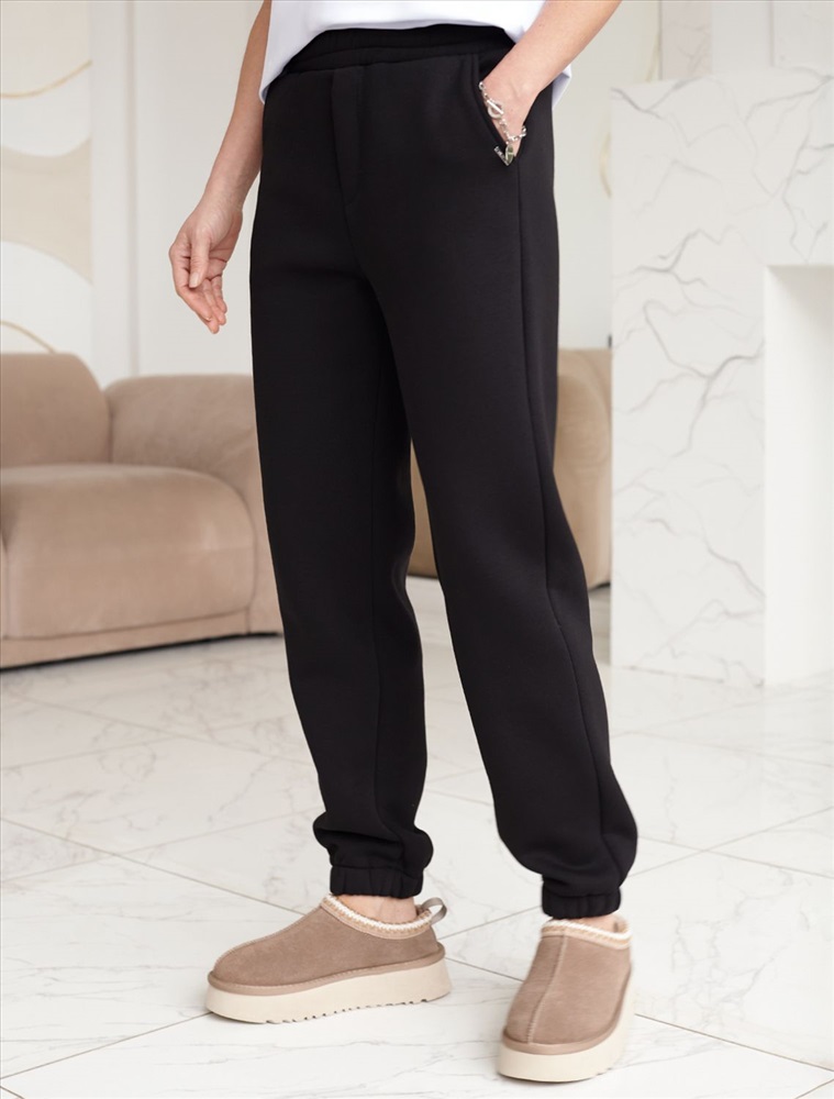 Плотность: 320 Г/м2 Размер товара на первом фото: 42 Сочетается с артикулами: D49.102, D49.103, D49.062 Теплые джоггеры с удобным поясом на резинке и карманами по бокам выполнены из премиального футера-трехнитки. Наличие эластана в составе гарантирует комфорт и долговечность изделия, материал хорошо пропускает воздух, позволяя телу дышать, а мягкий начес обеспечивает дополнительное тепло и комфорт в прохладную погоду. Эти уютные брюки черного цвета созданы для вашего комфорта. Стильные спортивные штаны из натурального материала и правильного кроя подойдут для девушек и женщин любого размера, в том числе на плюс-сайз фигуру. Зауженные к низу брюки отлично вытянут силуэт и скроют недостатки за счет правильного кроя. Идеальный выбор для прогулок, отдыха или занятий спортом. В повседневных трикотажных брюках вы будете чувствовать себя комфортно и уверенно, наслаждаясь каждым моментом дня. Комментарии к товару