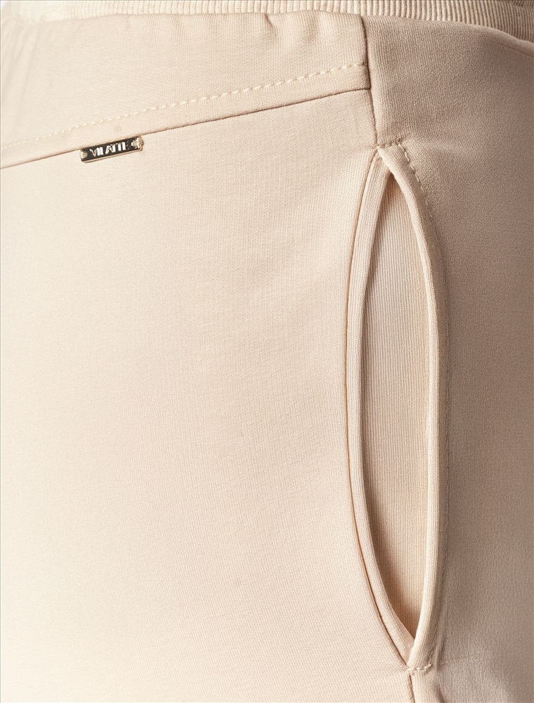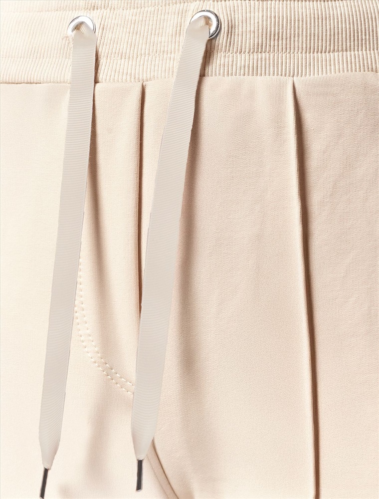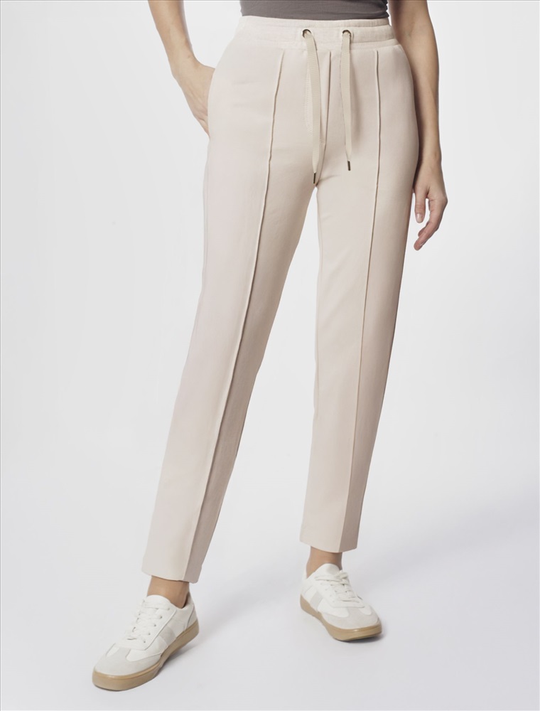 Брюки выполнены из эластичного футера-двухнитки. Модель дополнена застроченными стрелками, что визуально вытягивает силуэт. Эластичный пояс на резинке с хлопковым шнурком и металлической фурнитурой. Брюки сочетаются в костюме с футболкой D49.031 и бомбером D49.038
