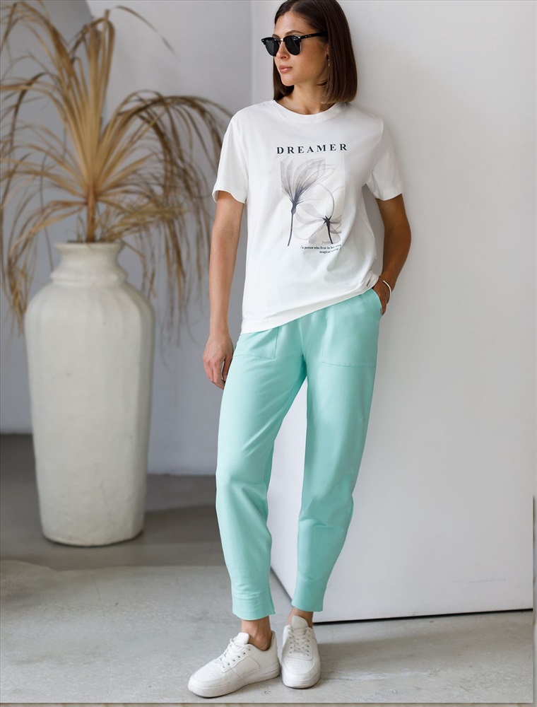 Плотность: 240 Г/м2 Брюки выполнены из футера двухнитки с эластаном. Модель зауженная к низу дополнена карманами и эластичным поясом с фактурой в рубчик. В пояс вставлен плоский хлопковый шнур в тон изделия с серебристыми наконечниками. Изделие дополнено металлическим логотипом бренда. Сочетается в костюме с жакетом D49.078, джемпером D49.079, D49.080 и футболкой D49.081 Комментарии к товару