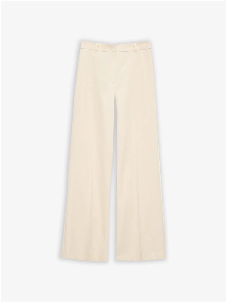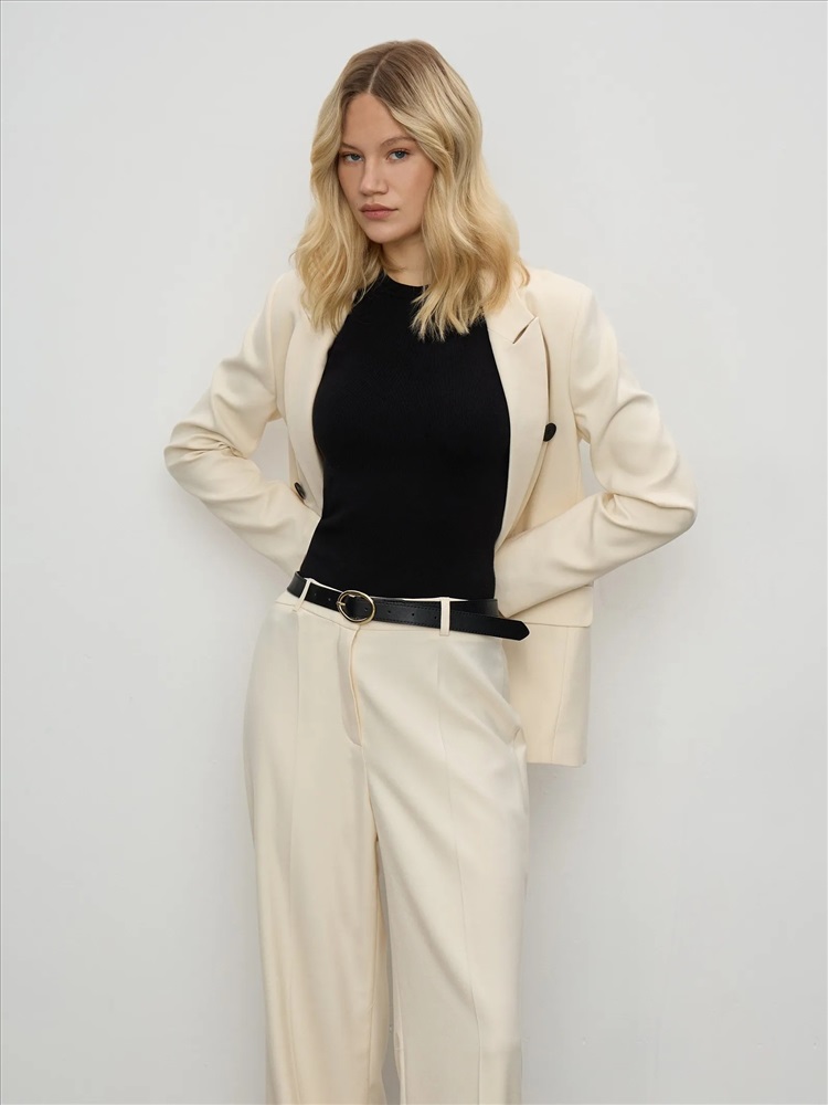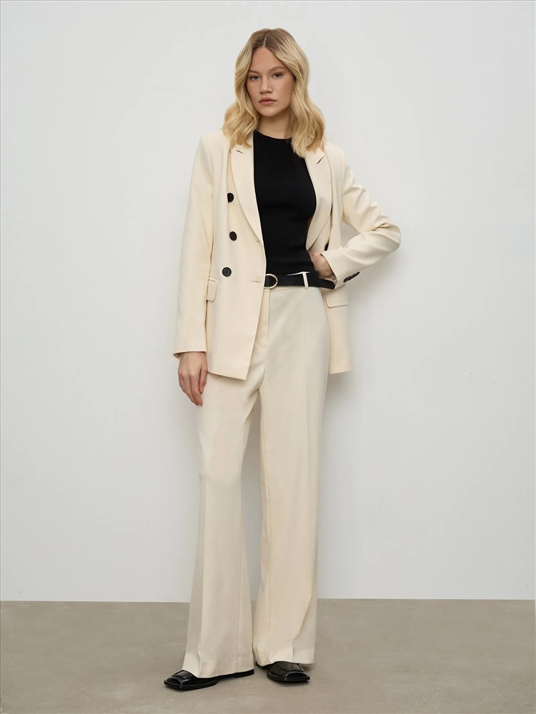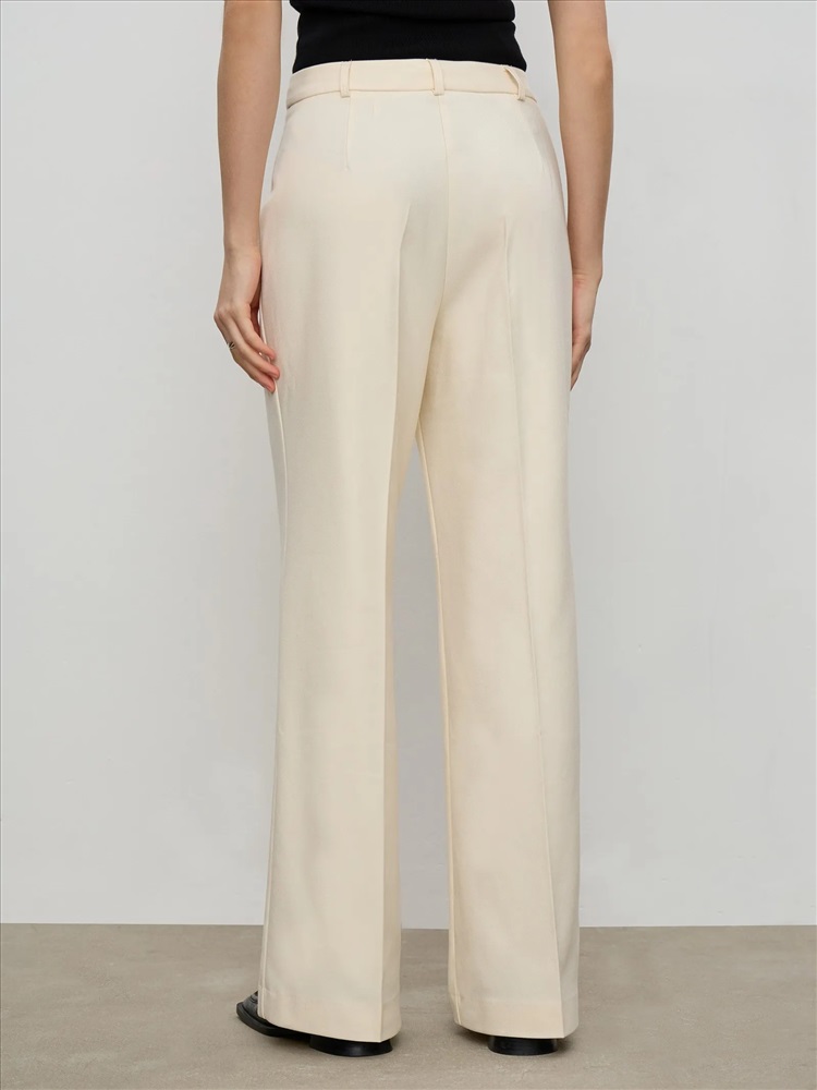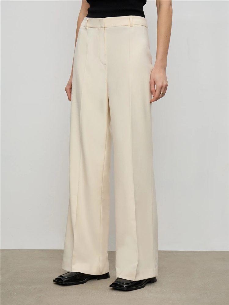 Лаконичные брюки молочного цвета отлично подойдут для деловых образов. Модель широкого кроя полной длины имеет высокую посадку. По бокам расположены функциональные карманы. Брюки без пуговицы застёгиваются на молнию, скрытую планкой. Изделие выполнено из материала с содержанием вискозы, без подкладки. Образ с брюками можно дополнить жакетом из комплекта.