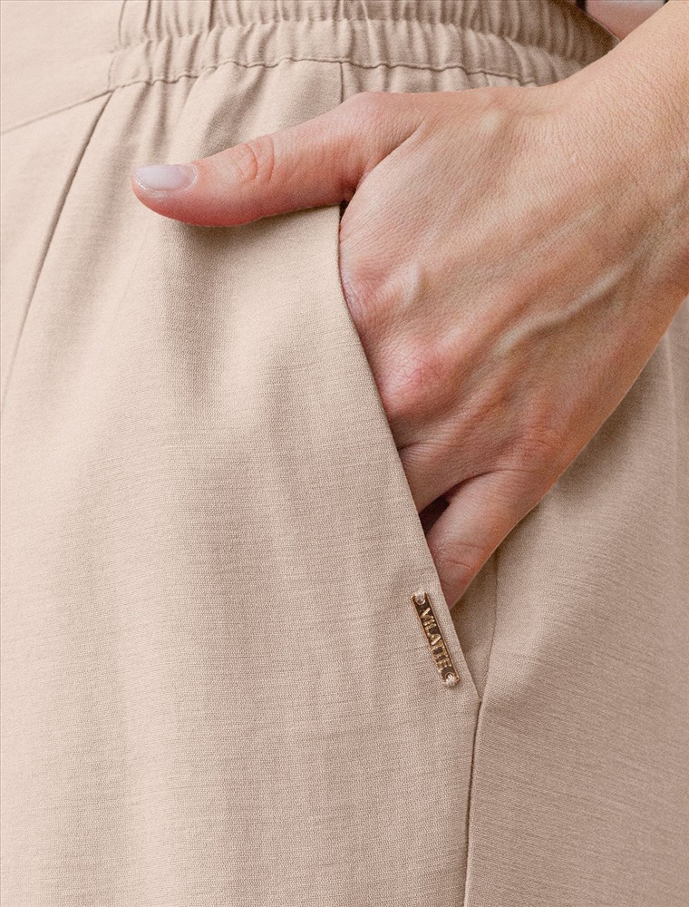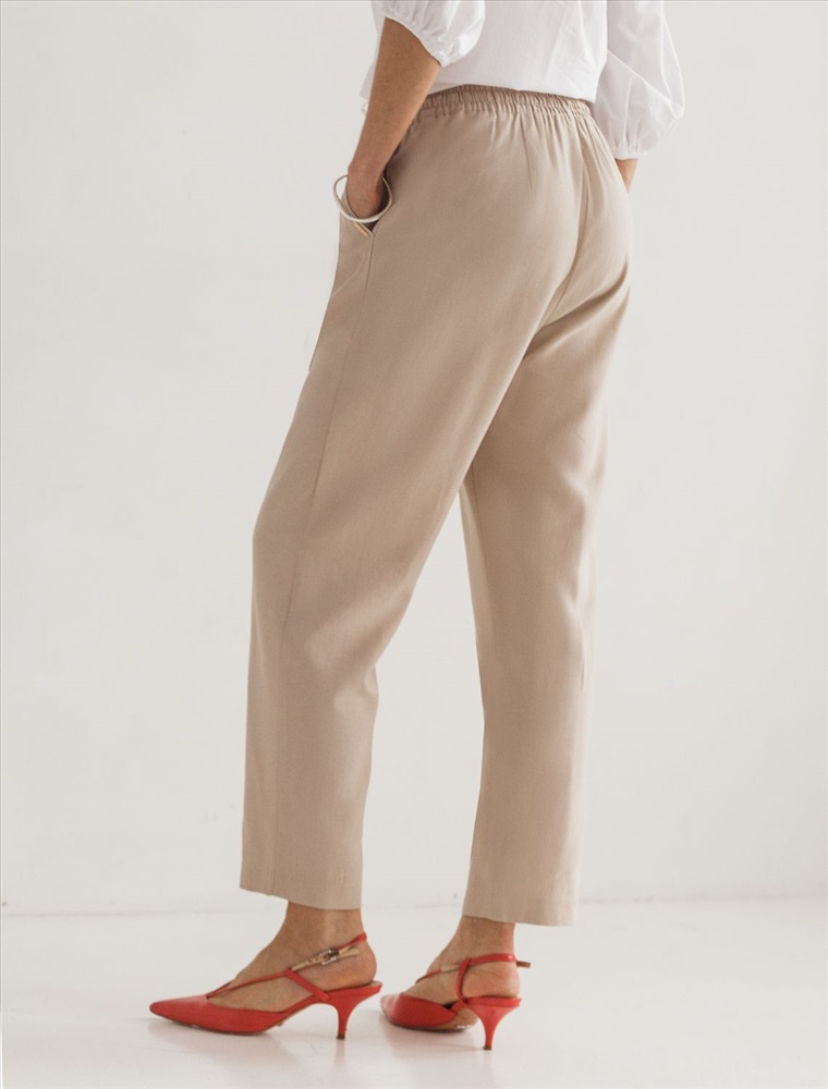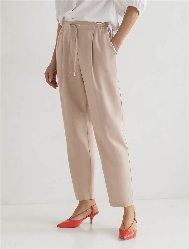 Параметры модели на первом фото: Рост 172, бюст 88, талия 64, бедра 88 Брюки выполнены из плотного лиоцелла. Модель дополнена карманами и поясом с эластичной резинкой и регулируемым шнурком с золотистой фурнитурой. Ткань изделия отлично держит форму, плавно драпируется и не просвечивает. В теплое время года приятно охлаждает кожу. Добавление синтетических волокон в составе изделия, предотвращает сминаемостьи поддерживает формоустойчивость. Брюки сочетаются в костюме с топом D23.063 и блузкой D29.266, D29.267 и жилетом D27.002 Комментарии к товару