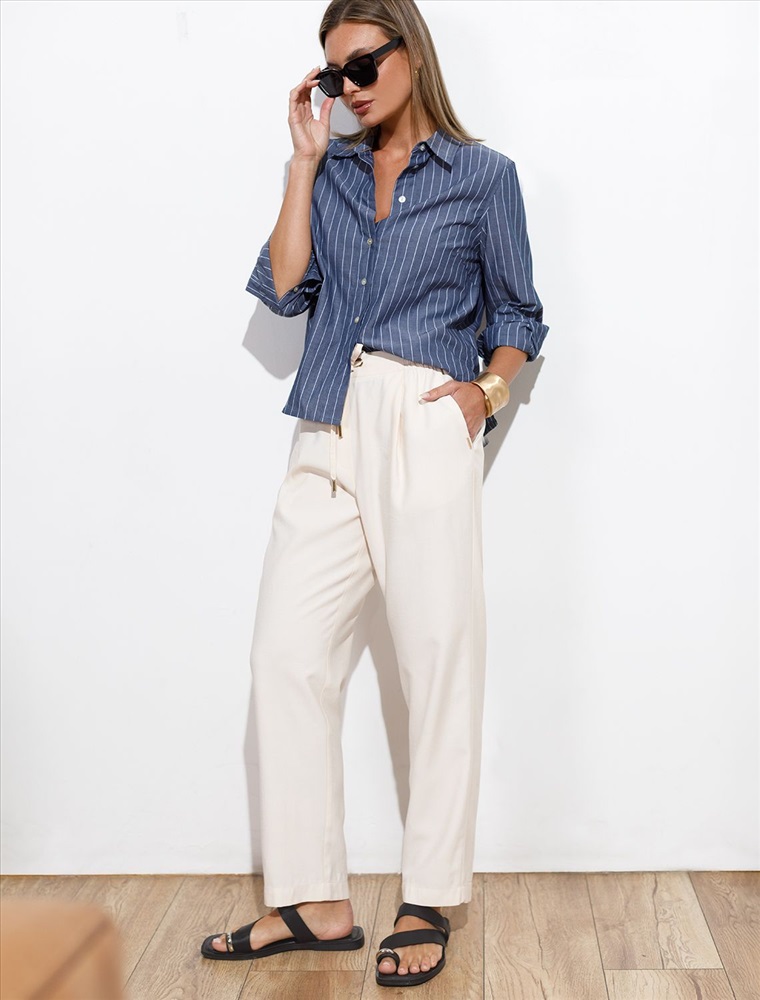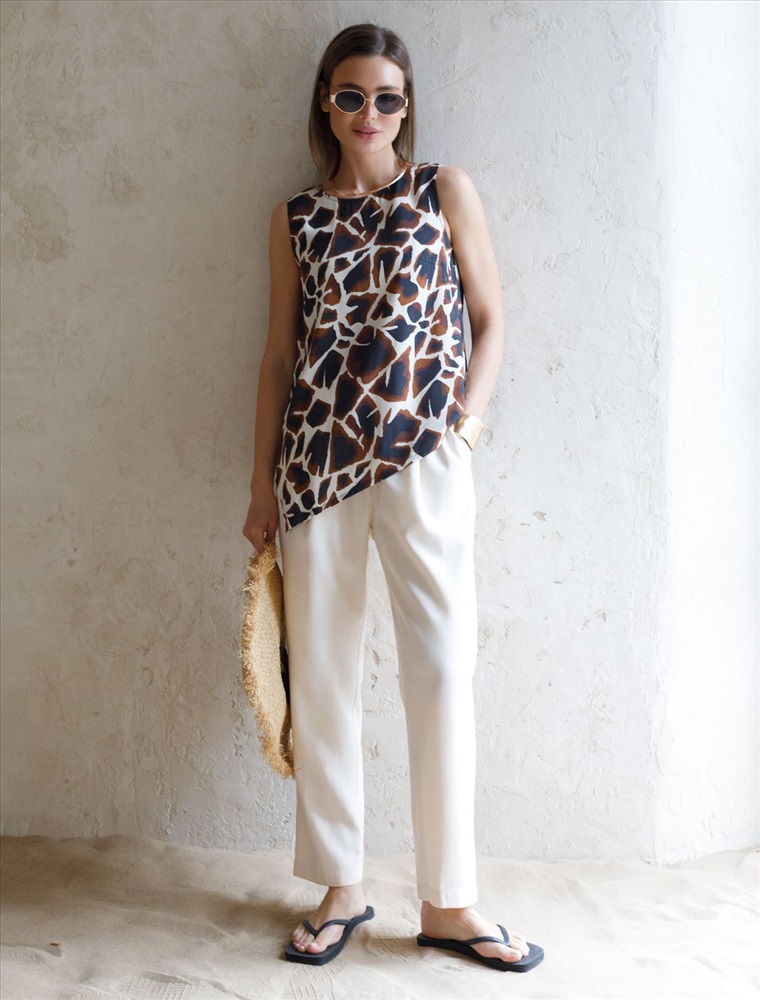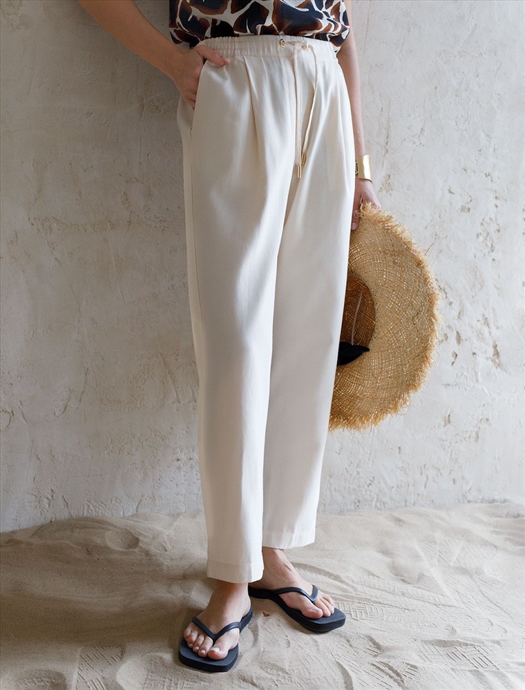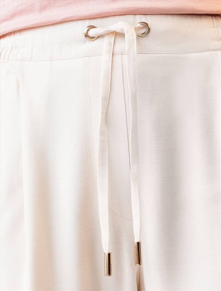 Параметры модели на первом фото: Рост 172, бюст 88, талия 64, бедра 88 Брюки выполнены из плотного лиоцелла. Модель дополнена карманами и поясом с эластичной резинкой и регулируемым шнурком с золотистой фурнитурой. Ткань изделия отлично держит форму, плавно драпируется и не просвечивает. В теплое время года приятно охлаждает кожу. Добавление синтетических волокон в составе изделия, предотвращает сминаемостьи поддерживает формоустойчивость. Брюки сочетаются в костюме с топом D23.063 и блузкой D29.266, D29.267 и жилетом D27.002