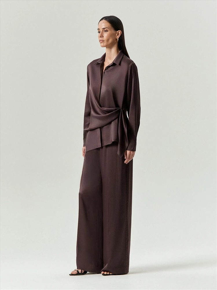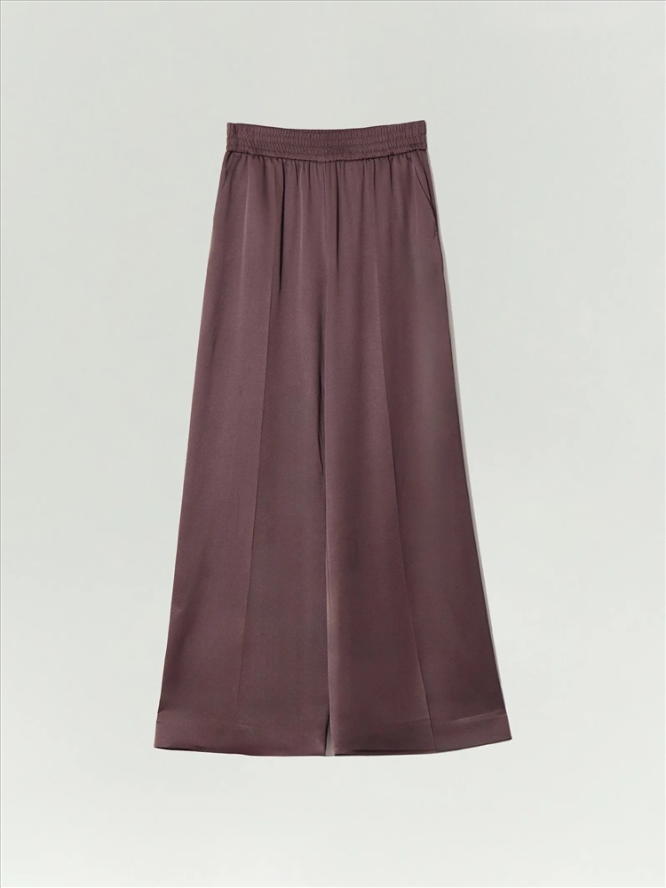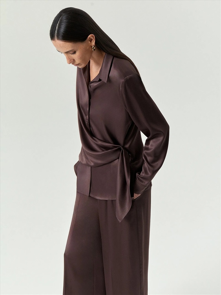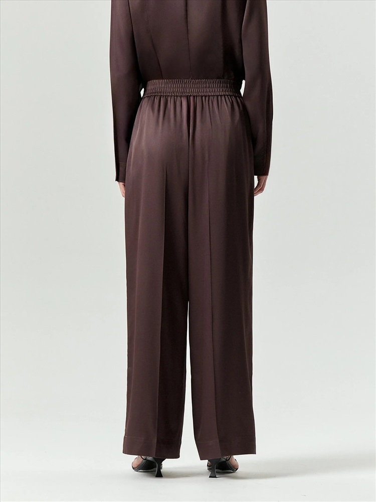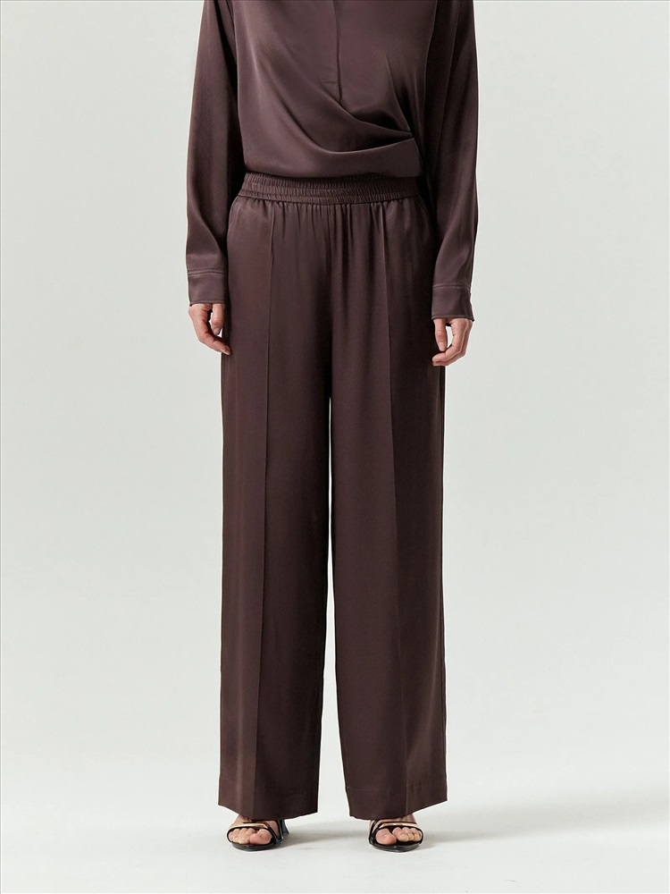 Стильные брюки в шоколадном цвете выполнены из струящегося материала с высоким содержанием вискозы, что делает их приятными к телу и дышащими. Модель на комфортной широкой резинке с высокой посадкой имеет широкий крой и полную длину. Образ с брюками в стиле кэжуал-шик можно дополнить блузкой из комплекта.