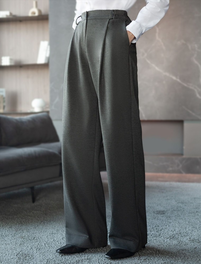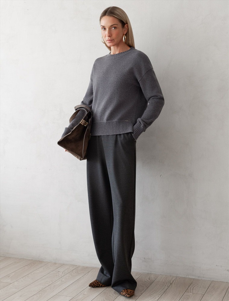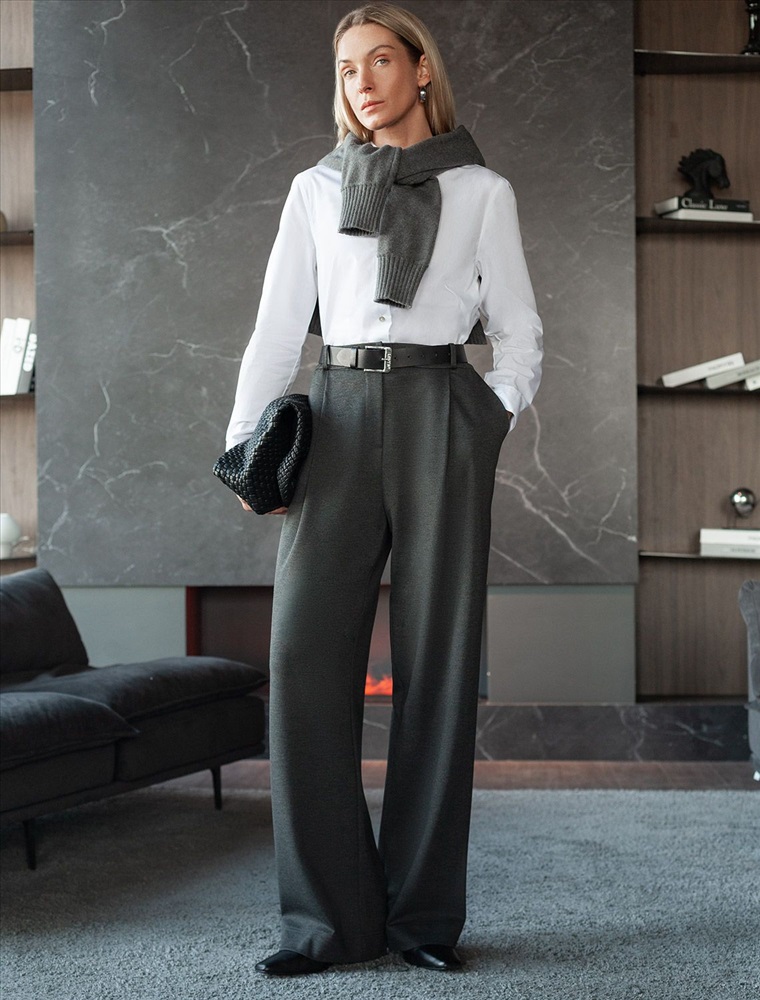 Брюки-палаццо выполнены из ткани джерси. Свободная модель дополнена карманами и поясом на резинке сзади. Посадка на талии и заутюженные стрелки визуально удлиняют ноги и вытягивают силуэт. Идеальный вариант для офисного дресс кода или в повседневный классический стиль.