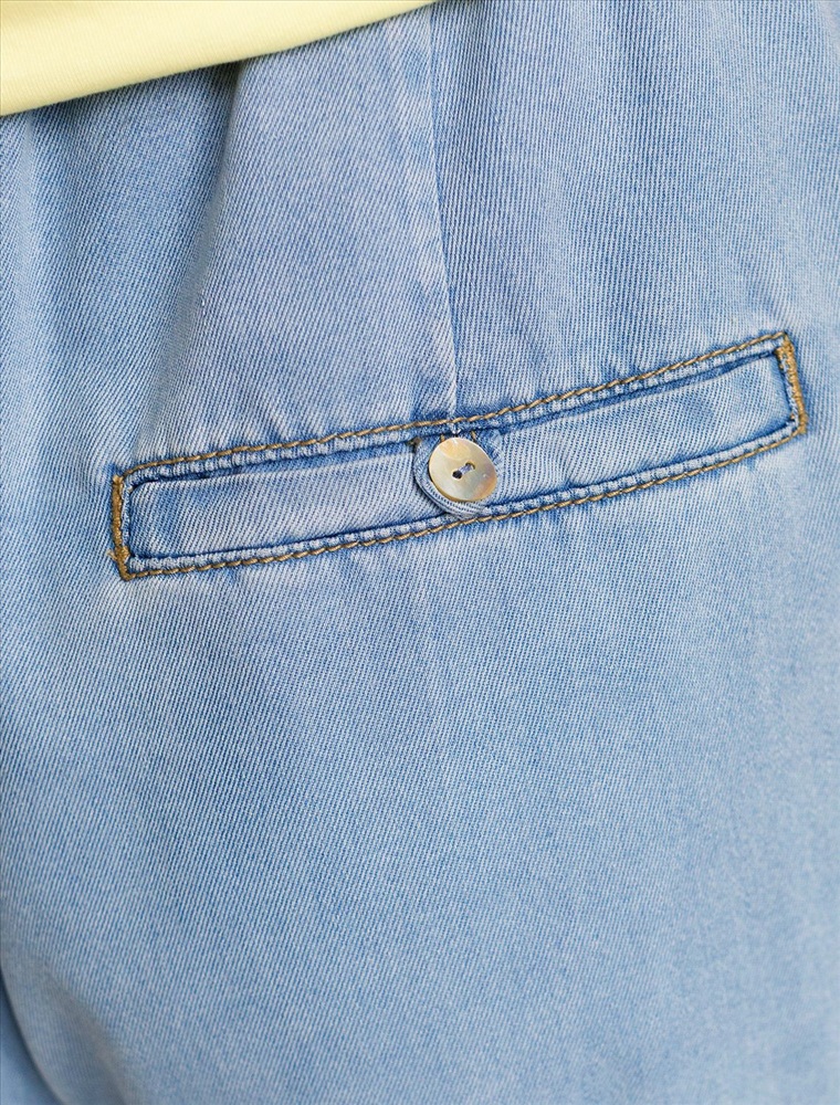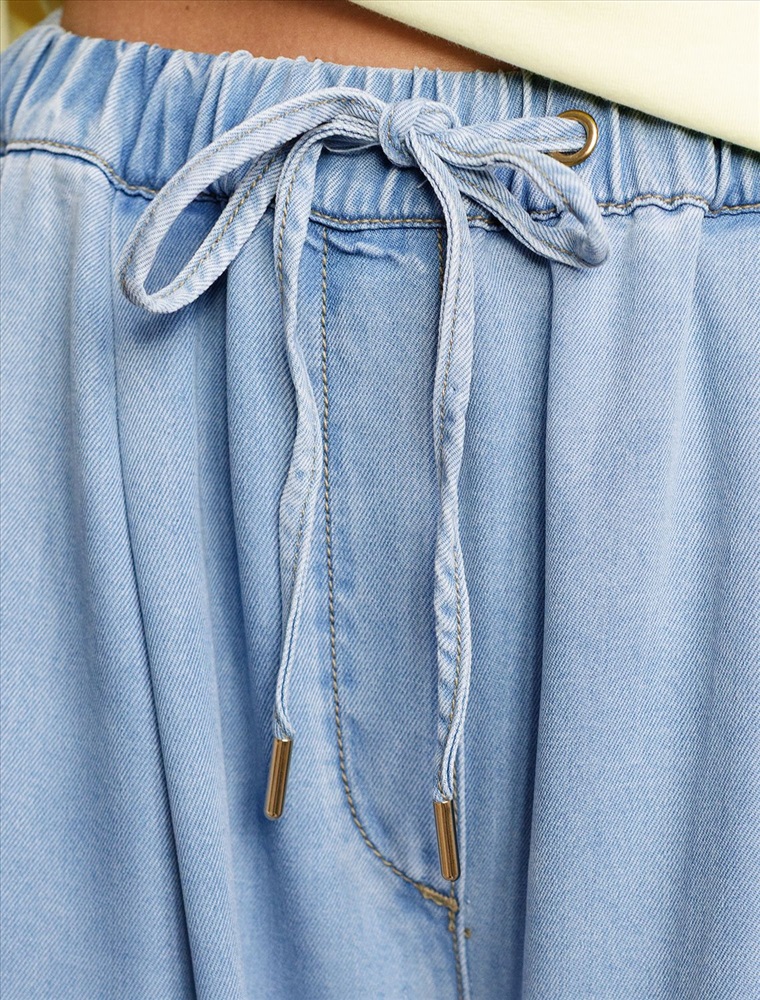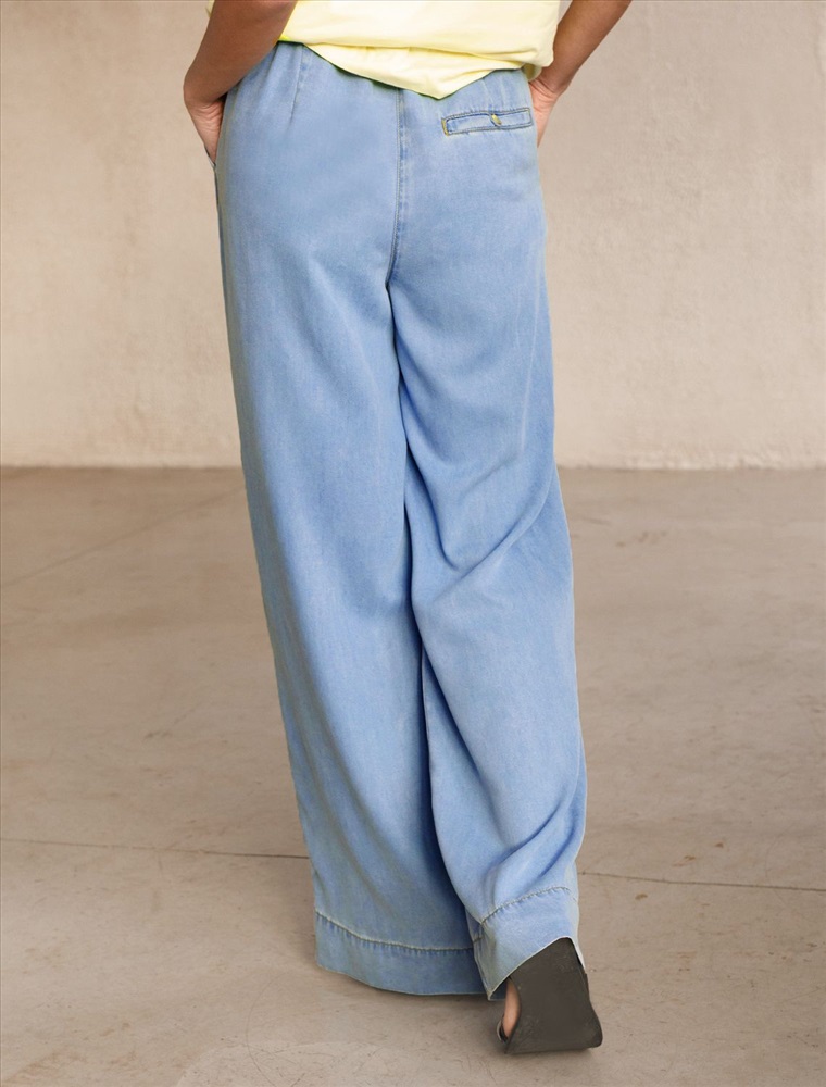 .Эффектные брюки-палаццо светло-синего цвета из джинсового лиоцелла плотностью 7,8 OZ отлично подойдут для лето и весну. Свободные и легкие палаццо смотрятся стильно и незаменимые в гардеробе женщин. Благодаря удобному эластичному поясу и защипам в области талии они хорошо садятся на разные типы фигур, скрывают недостатки и создают модный силуэт. Такие повседневные широкие брюки комфортно носить девушкам и женщинам маленького и высокого роста, представлена различная ростовка. Их фасон универсальный: оптимален для офиса, прогулок, встреч или отдыха. Ткань сочетает прочность и мягкость лиоцелла с вискозой, что делает её невероятно комфортной, дышащей, устойчивой к сминанию и идеально подходящей для чувствительной кожи. Благодаря нежным тактильным ощущениям, будто шелк, от которого ощущается приятная прохлада, штаны отлично подходят для создания легких летних образов или стильных ансамблей на каждый день засчет своей универсальности. Тонкие джинсы можно сочетать в стиле кэжуал, а также создавать монохромные образы или добавлять яркие акценты с помощью аксессуаров. Брюки-палаццо гармонично сочетаются с разной обувью и верхом, что делает их отличным выбором для любого случая.