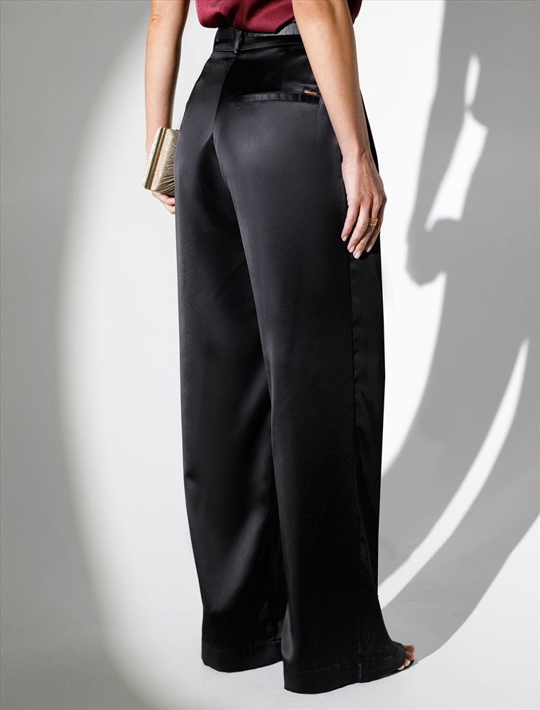 Брюки палаццо черного цвета из струящегося сатина, который придает образу эффектный и стильный вид. Мягкий сатин приятен к телу, в них комфортно на протяжении долгой носки. Брюки длиной в пол визуально вытягивают силуэт и подходят как для высоких, так и для женщин низкого роста. Модель идеально садится на большие размеры, не сковывая движений. Благородный материал обеспечивает не только привлекательный внешний вид, но и ощущение легкости в носке. Высокая посадка выгодно подчеркивает фигуру, добавляя изящества и современного шарма, они струятся при каждом движении.
