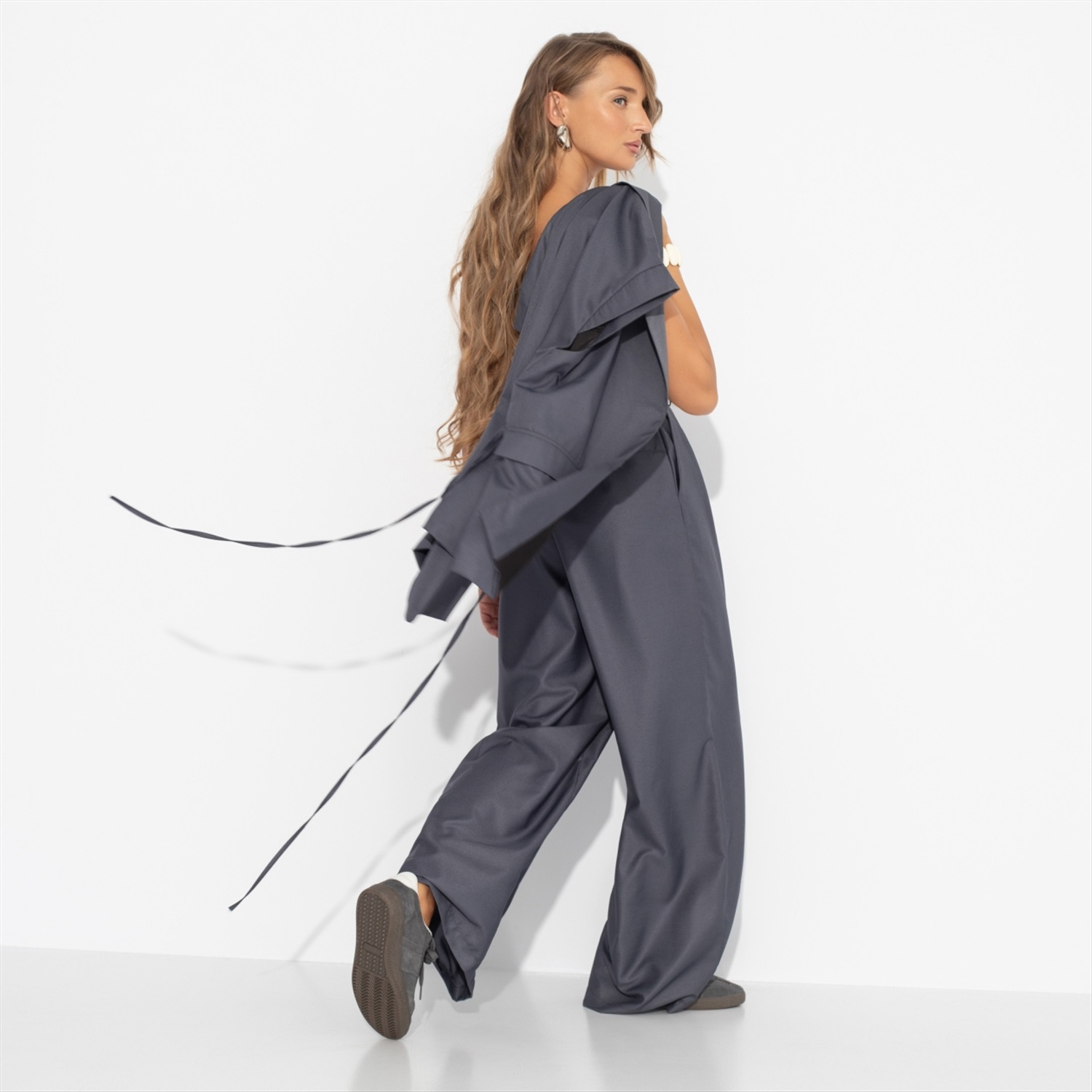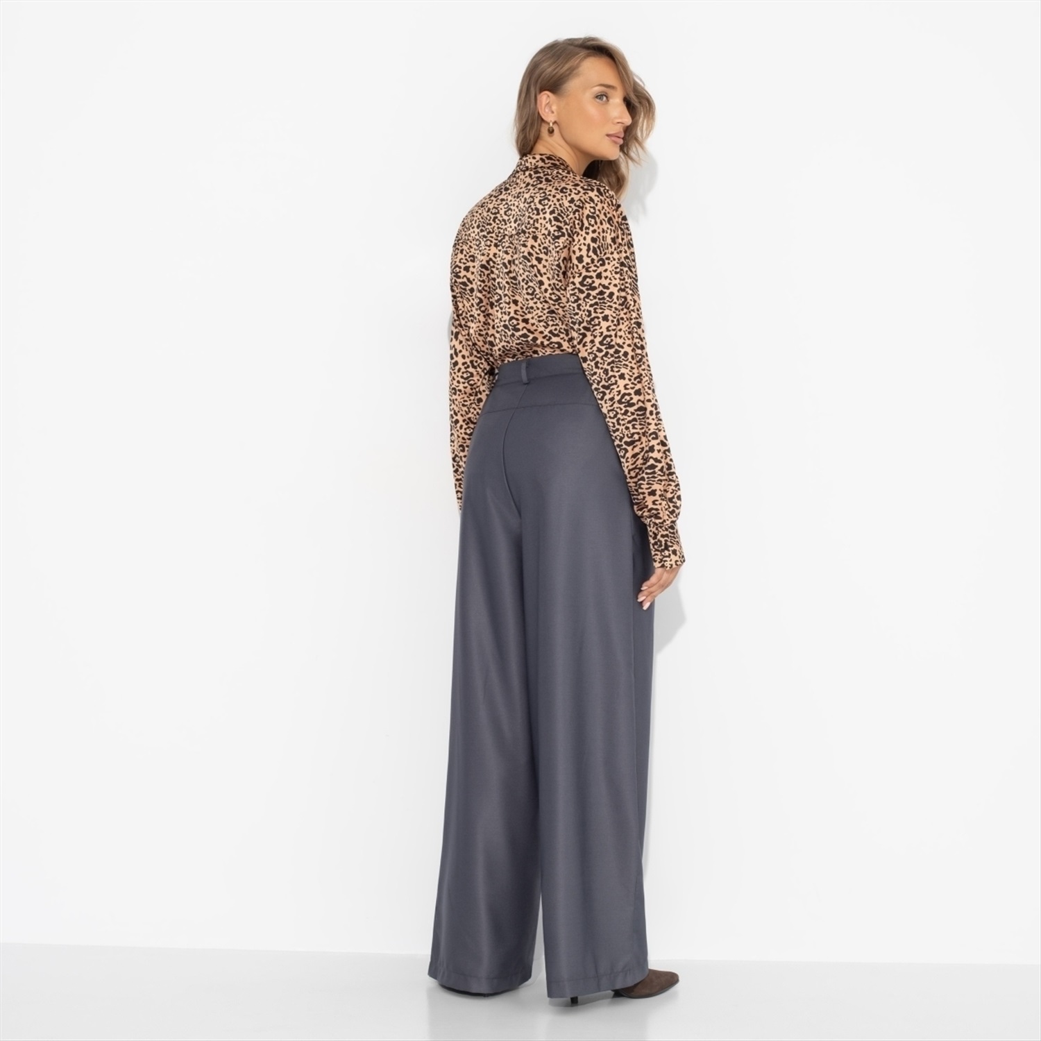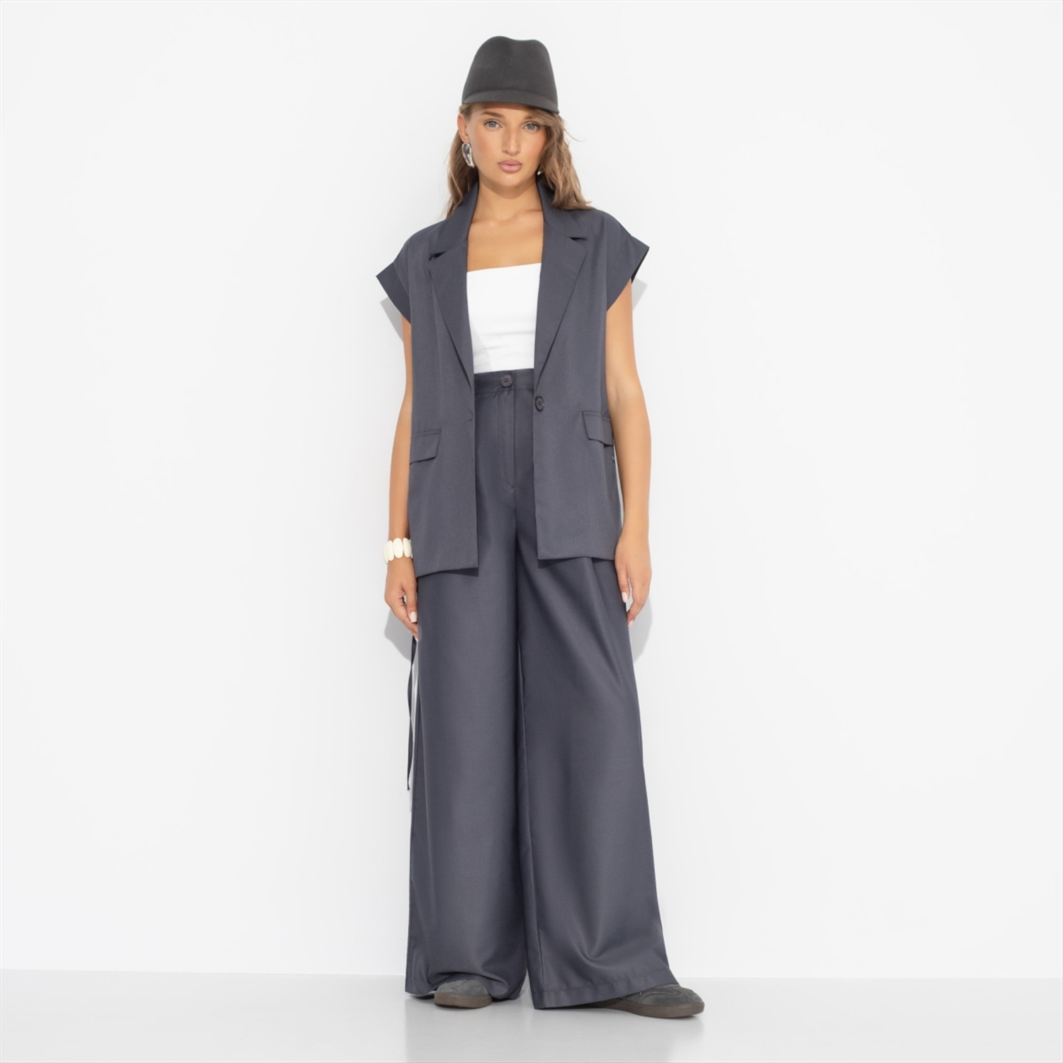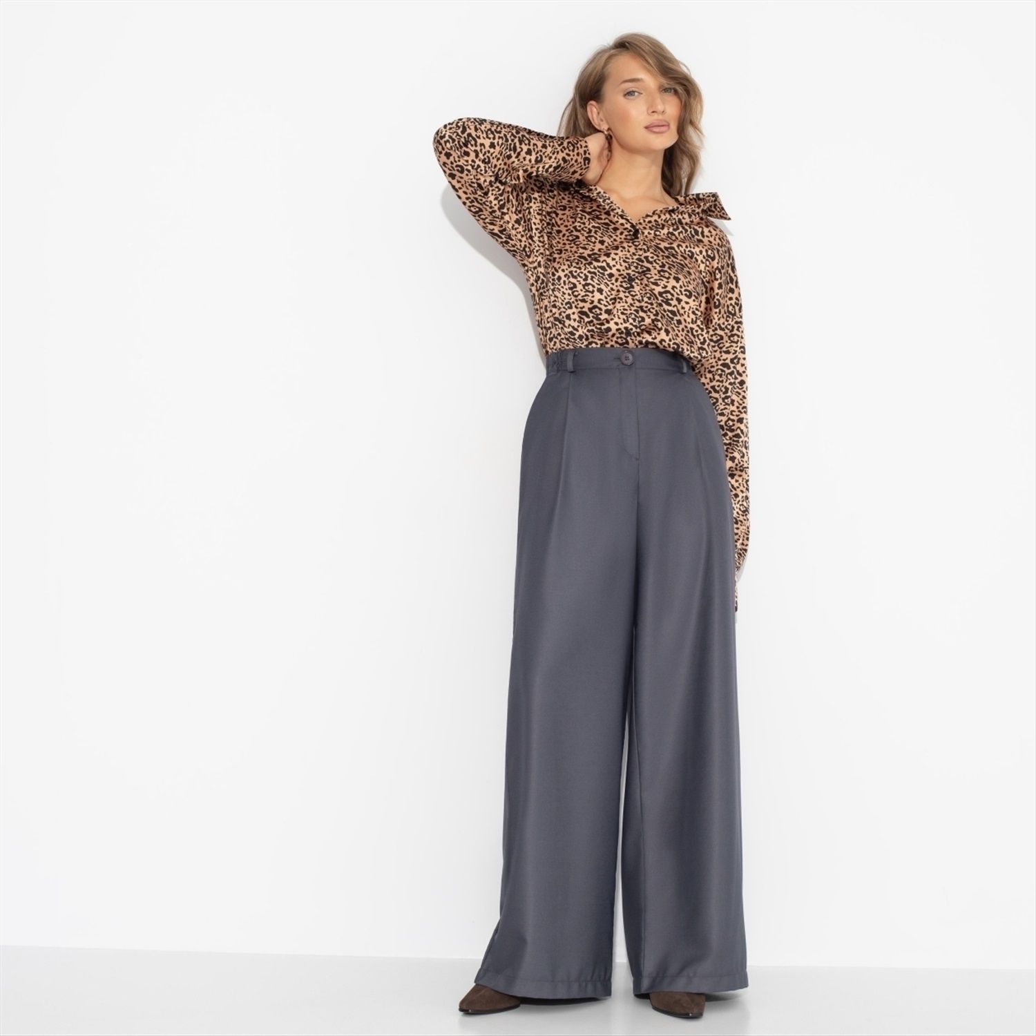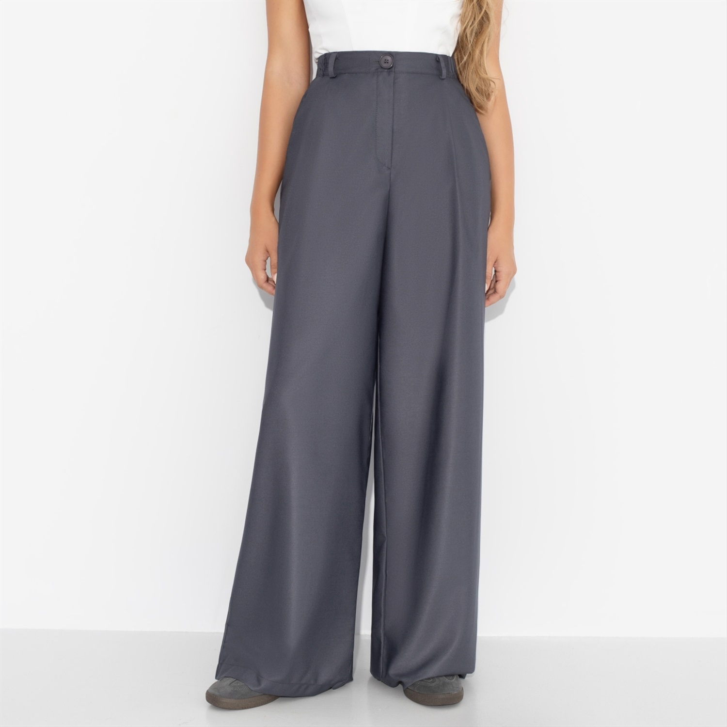 Состав: «Поливискоза» (85% п/э, 15% вискоза) Плотность ткани: Средняя Тип ткани: Текстиль Вид застежки: Пуговица/-ы, молния Высота посадки: Высокая Карманы: В боковом шве Основной цвет ткани: Серый Отрезная талия: Есть Подклад: Нет Резинка по талии: Есть Рисунок/раппорт: Нет, все изделия идентичны Сезон: Круглогодичный Стиль: Деловой Фасон брюк: Палаццо Фасон брюк: Палаццо Параметры модели на фото: