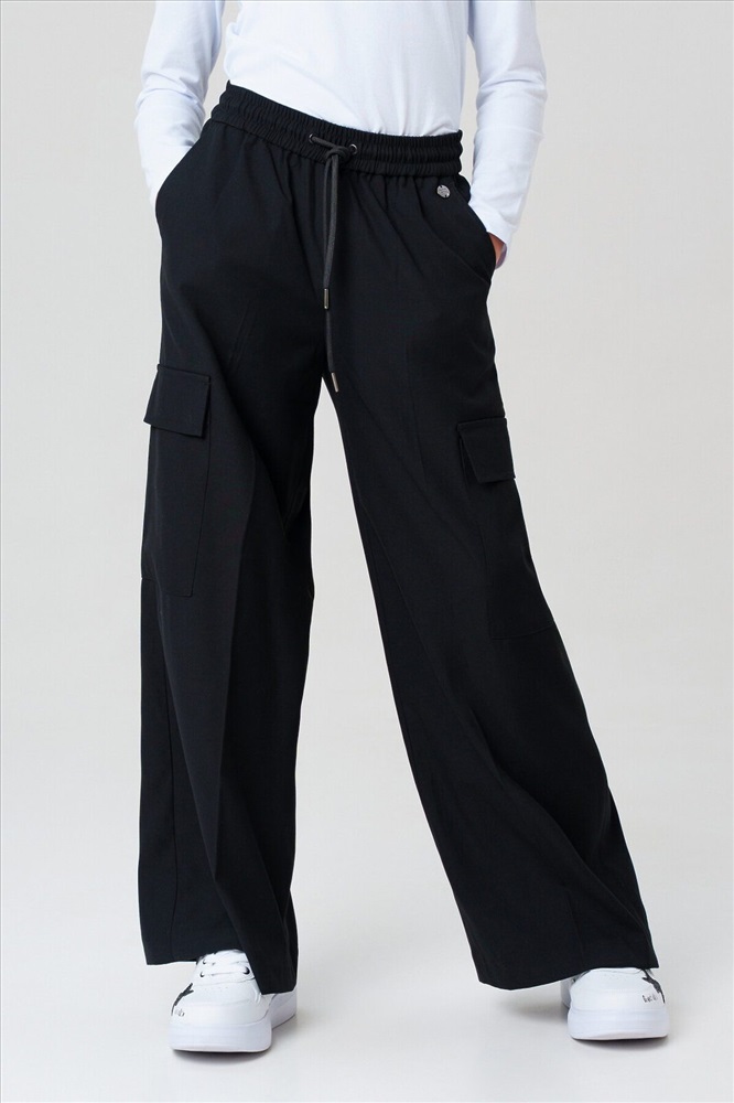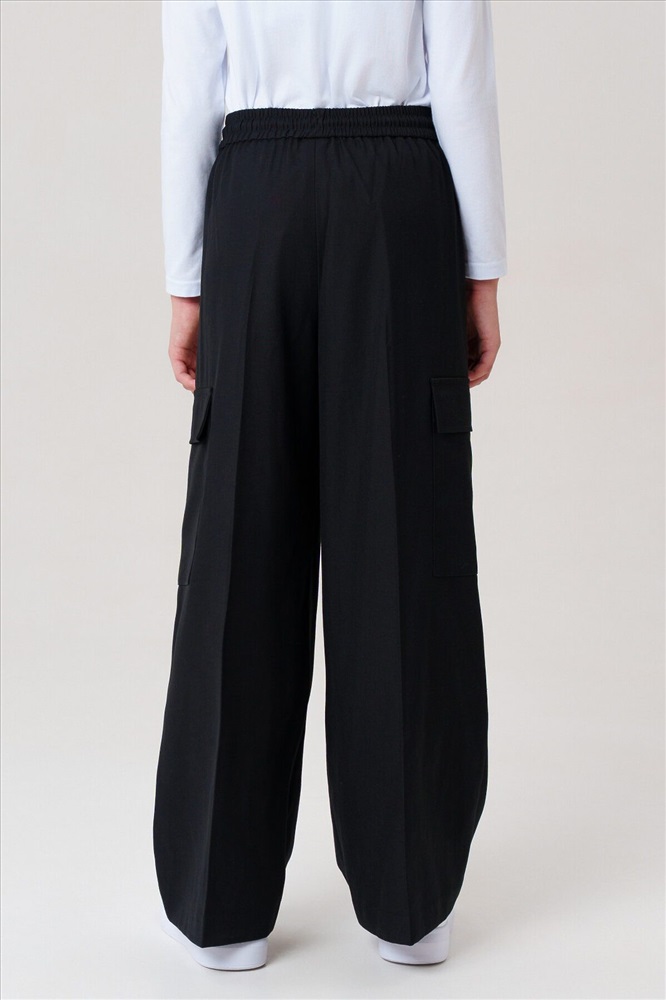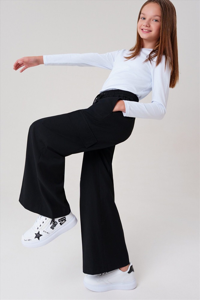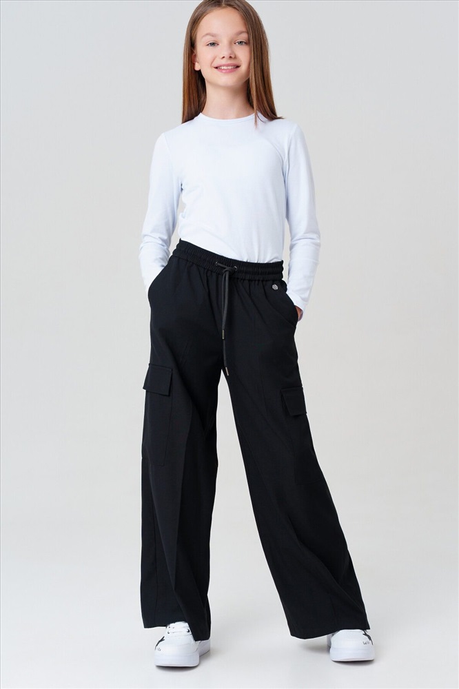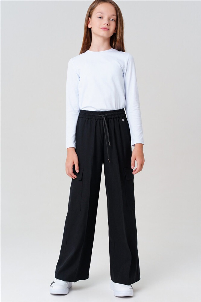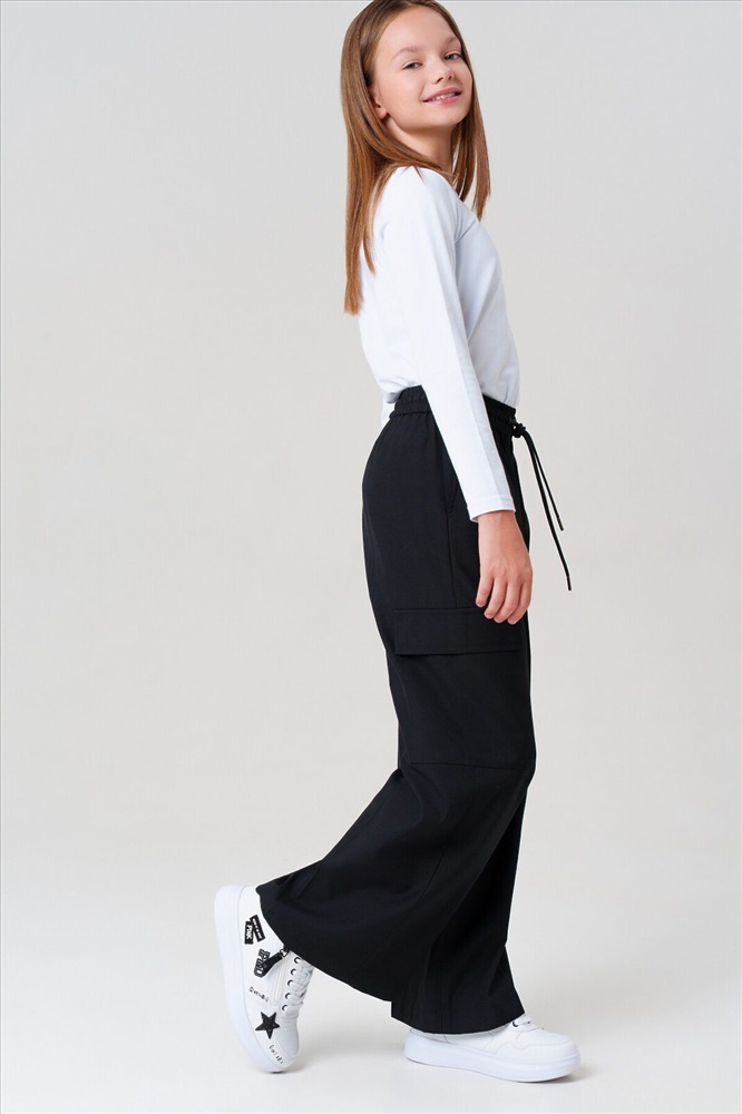 Классические черные школьные текстильные брюки палаццо для девочки. Идеальные брюки для школы, сочетающие комфорт и аккуратный внешний вид. Модель с посадкой Wide leg — это широкие брюки с расслабленной посадкой, максимальной длиной и акцентом на талии. Обеспечивает свободу движений, а резинка со шнурком позволяет легко регулировать посадку по фигуре. Особенности: + 4 кармана – два передних кармана и 2 накладных карго для мелочей. + На резинке со шнурком – удобная посадка без дискомфорта. + Классический крой – подходит для школьной формы и повседневной носки. Эти брюки для девочки-школьницы выполнены из качественного материала, устойчивого к износу. Практичный вариант в школу и на каждый день – стильно, удобно и функционально! Для девочек и подростков, которые ценят комфорт и опрятный вид.
