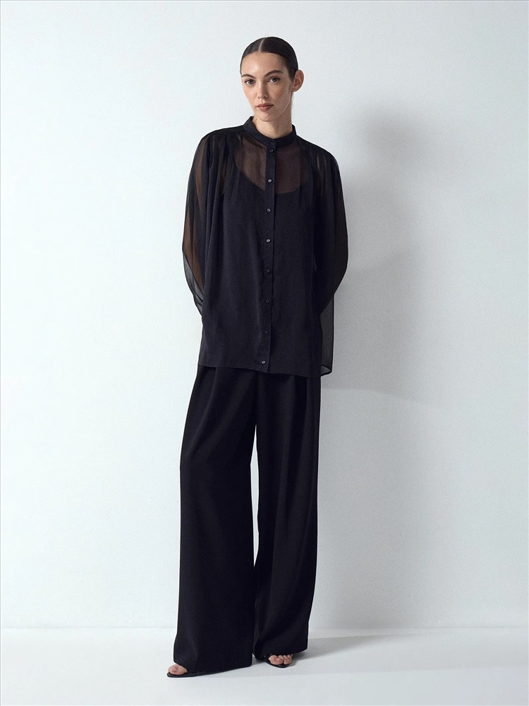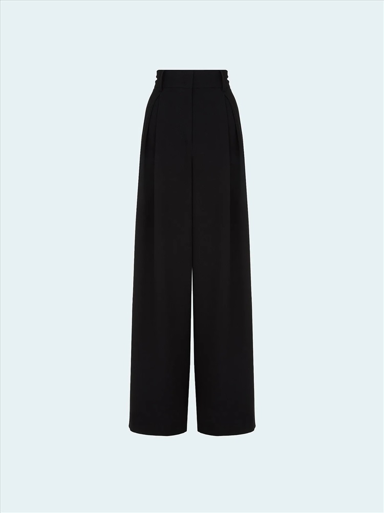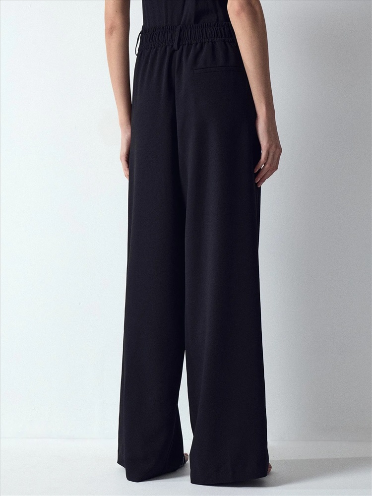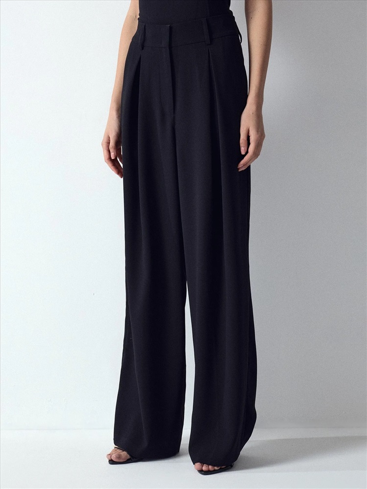 Стильные брюки в чёрном цвете. Модель широкого кроя и полной длины отличают элегантные глубокие защипы. Высокая посадка смотрится стильно. Резинка сзади обеспечивает больший комфорт. Изделие застёгиватся на потайные пуговицы и молнию. Брюки можно дополнить жакетом из комплекта.