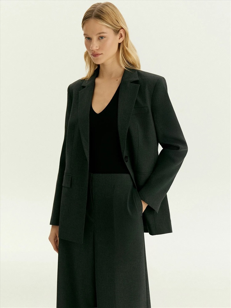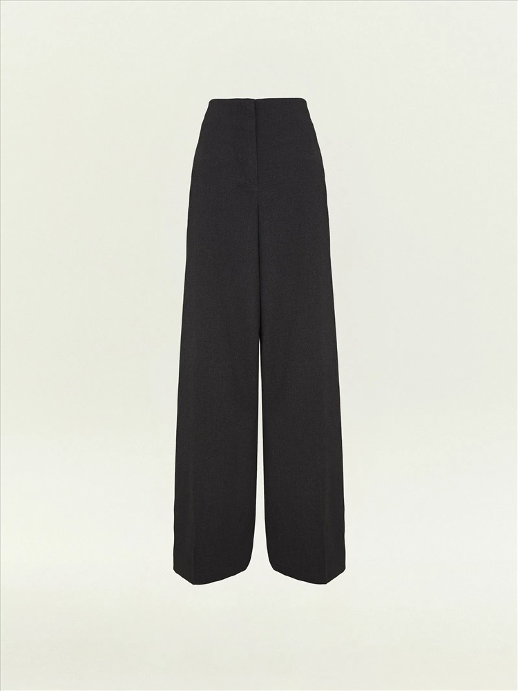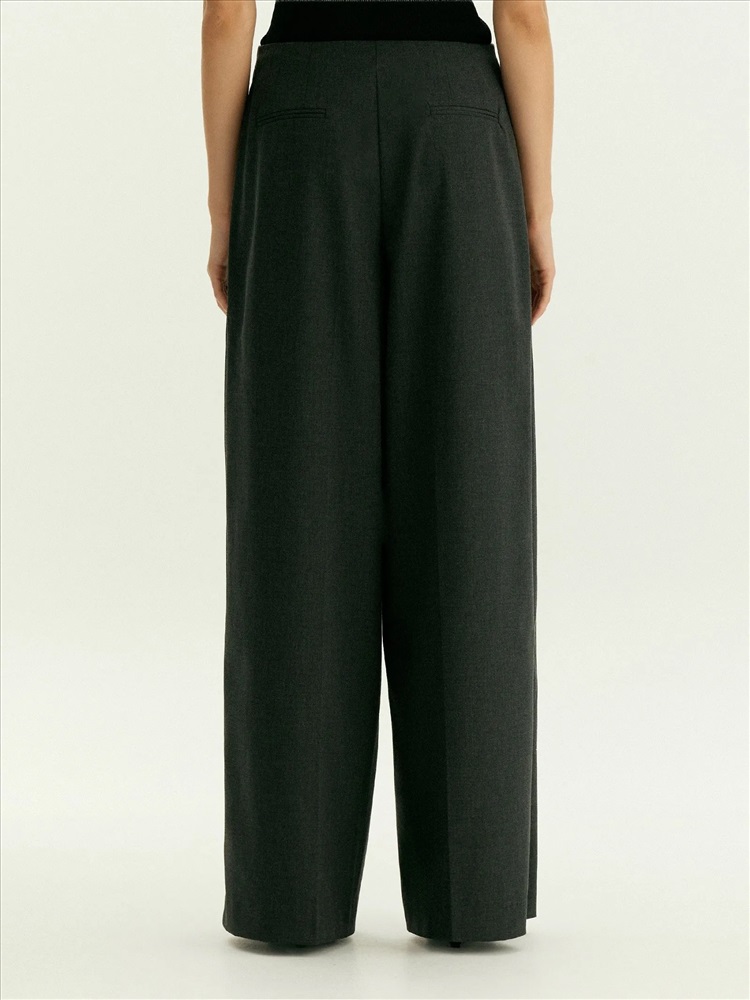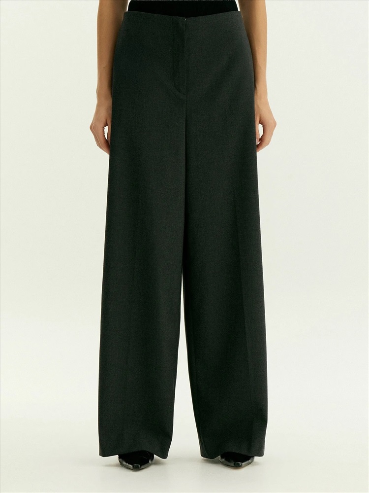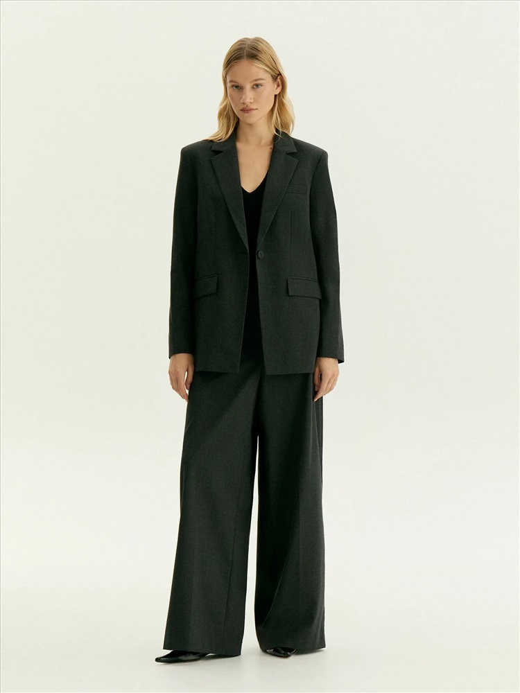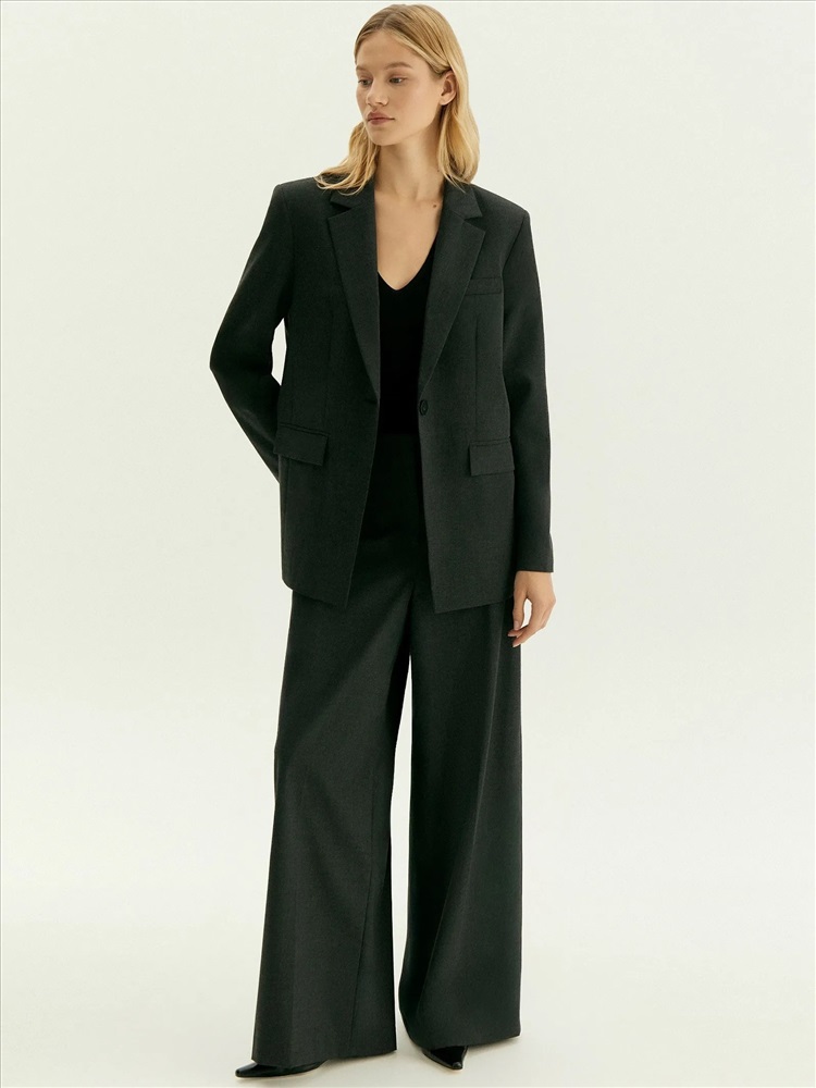 Брюки широкого кроя с посадкой на бёдрах сочетают сдержанность офисного стиля и расслабленность. Визуально формируют красивую линию бедра. Материал выполнен в красивом и насыщенном тёмно-сером цвете. Завершить образ с брюками можно жакетом из комплекта, полосатой рубашкой, воздушным сатиновым топом молочного цвета или тельняшкой. Модель большемерит на один размер.