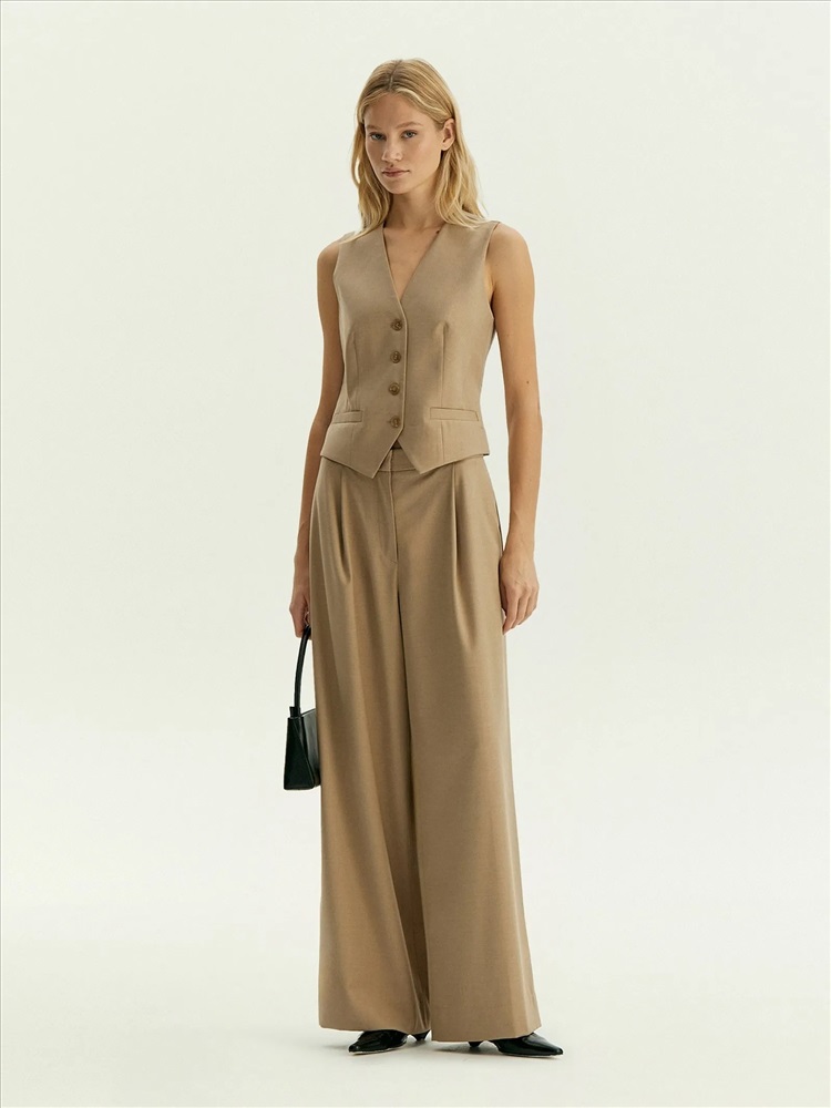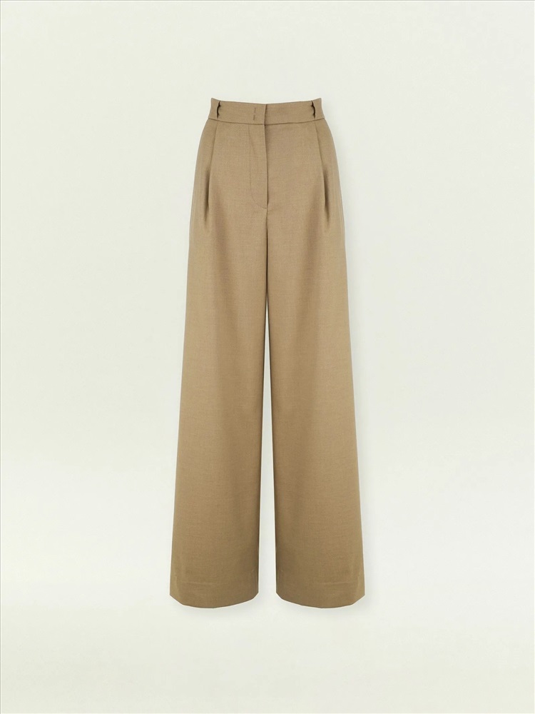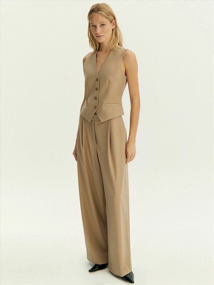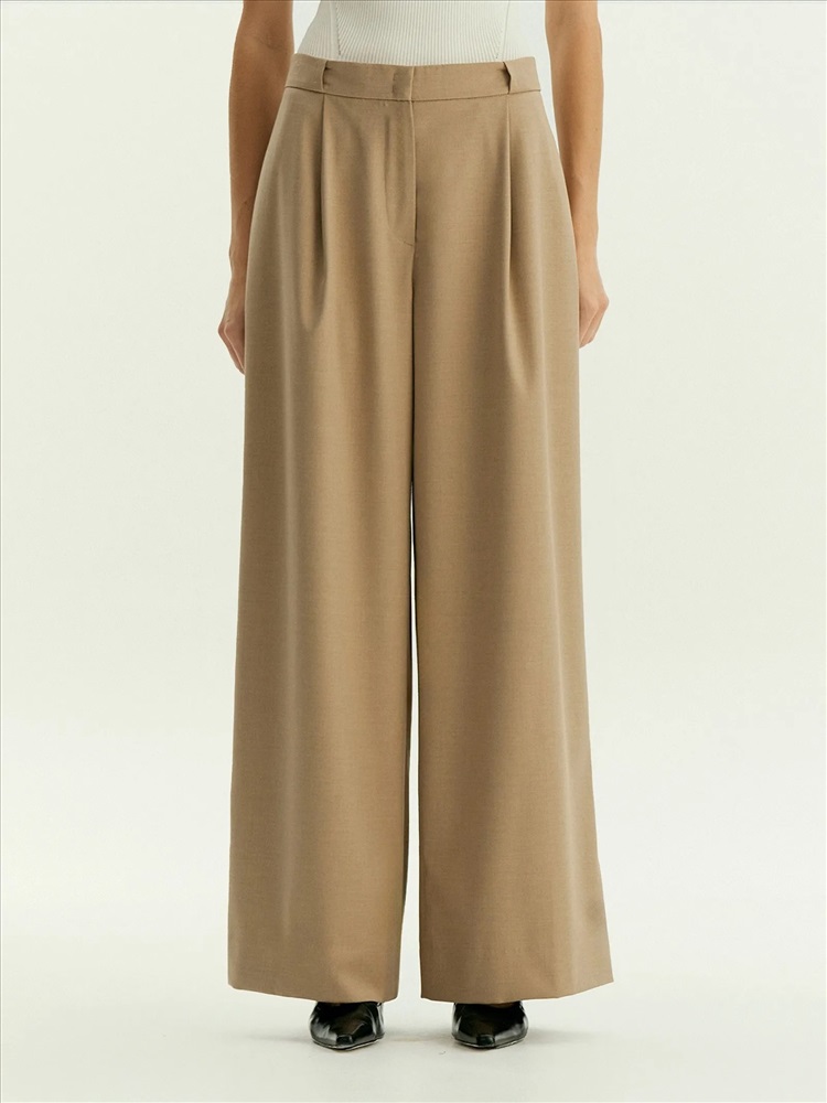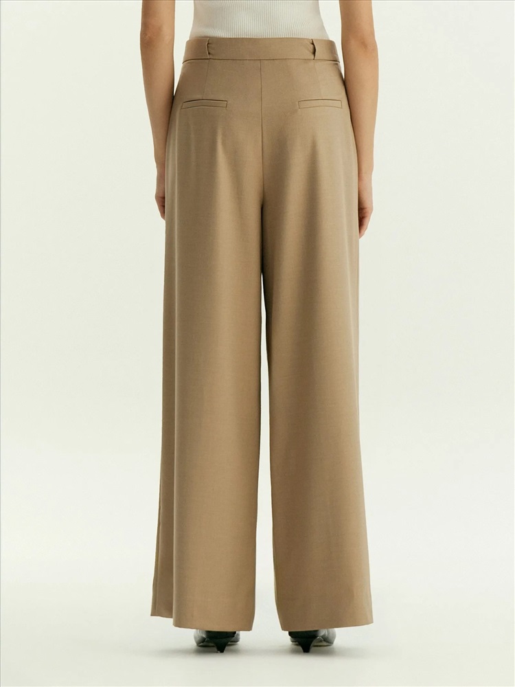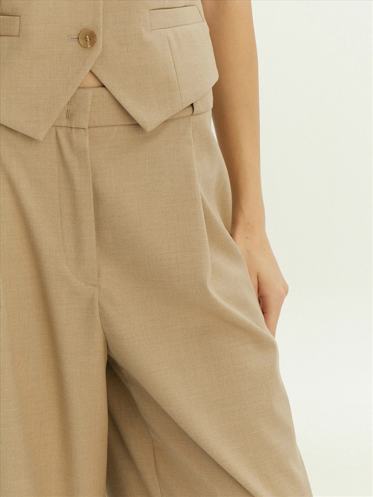Модные брюки на каждый день. Богатый оттенок бежевого сделает деловые образы ещё более стильными. В составе материала — шерсть для тепла, вискоза для мягкости и эластан для комфортной посадки. Элегантная модель полной длины с глубокими защипами и потайной застёжкой имеет модный широкий крой. Изделие выполнено без подкладки. Брюки могут стать частью капсулы с юбкой и жилетом ant.