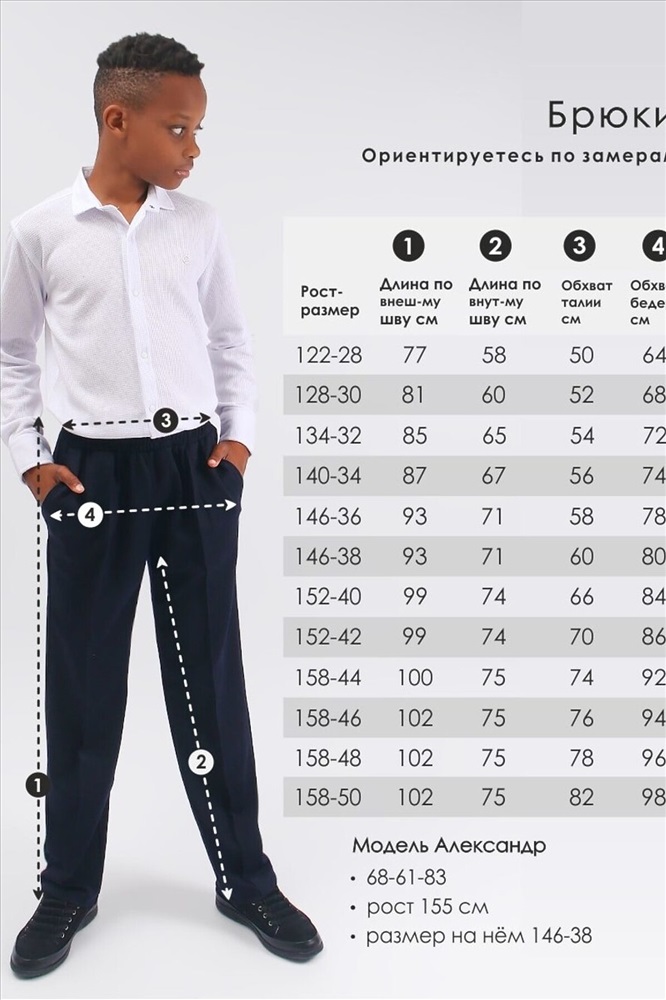 ID товара: 908090 Состав: 73% Хлопок; 22% Полиэстер; 5% Полиуретан Сезон: Демисезон Длина: Полная Фасон: Прямые Тип карманов: В шве Основная ткань: Хлопок Стиль: классический Вид ткани: Трикотаж стрейч Страна бренда: Россия Страна производства: Россия Брюки для мальчика из плотного трикотажа. Стильная модель чинос. Пояс на резинке. Удобная посадка. Размер 122-28(рост 122см) длина по внешнему шву 77 см, по внутр. 58 см, ОТ 50 см, ОБ 64 см. Размер 128-30(рост 128см) длина по внеш. Шву 81 см, по внутр. 60 см, ОТ 52 см, ОБ 68 см. Размер 134-32(рост 134см) длина по внеш. Шву 85 см, по внутр. 65 см, ОТ 54 см, ОБ 72 см. Размер 140-34(рост 140см) длина по внеш. Шву 87 см, по внутр. 67 см, ОТ 56 см, ОБ 74 см. Размер 146-36(рост 146см) длина по внеш. Шву 93 см, по внутр. 71 см, ОТ 58 см, ОБ 78 см. Размер 146-38(рост 146см) длина внеш. Шву 93 см, по внутр. 71 см, ОТ 60 см, ОБ 80 см. Размер 152-40(рост 152см) длина по внеш. Шву 99 см, по внутр. 74 см, ОТ 66 см, ОБ 84 см. Размер 152-42(рост 152см) длина по внеш. Шву 99 см, по внутр. 74 см, ОТ 70 см, ОБ 86 см. Размер 158-44(рост 158см) длина по внеш. Шву 100 см, по внутр. 75 см, ОТ 74 см, ОБ 92 см. Размер 158-46(рост 164см) длина по внеш. Шву 102 см, по внутр. 75 см, ОТ 76 см, ОБ 94 см. Размер 158-48(рост 164см) длина по внеш. Шву 102 см, по внутр. 75 см, ОТ 78 см, ОБ 96 см. Размер 158-50(рост 170см) длина по внеш. Шву 102 см, по внутр. 75 см, ОТ 82 см, ОБ 98см. Комментарии к товару