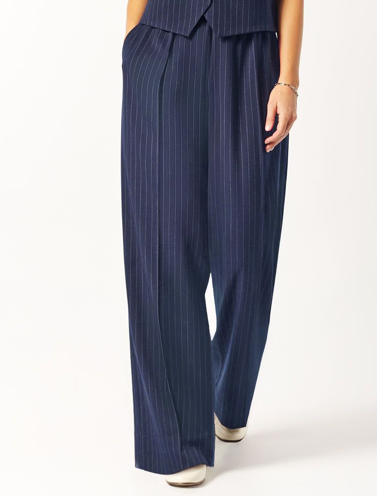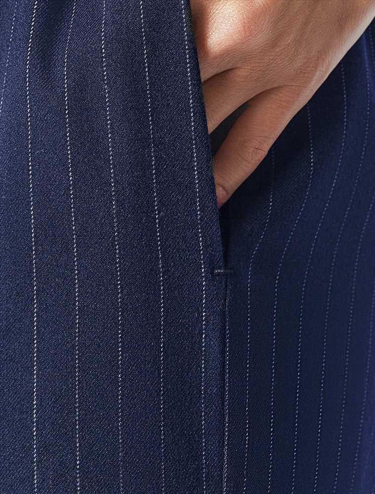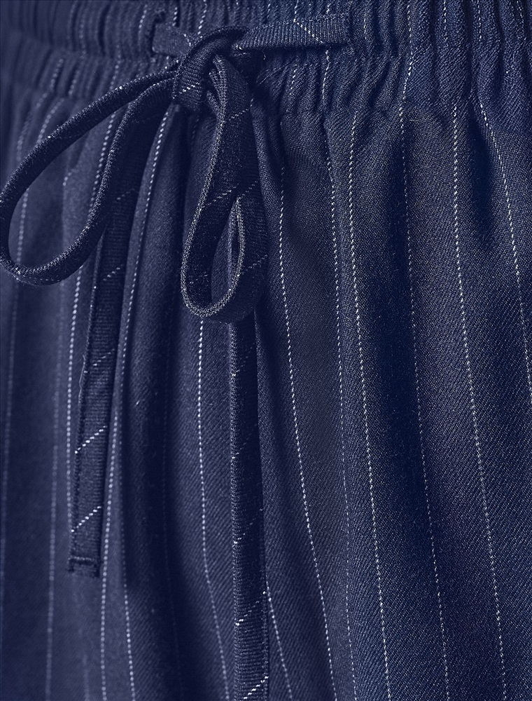 Параметры модели на первом фото: Рост 172, бюст 88, талия 64, бедра 88 Брюки свободного кроя выполнены из костюмной ткани в полоску. Модель с карманами и поясом на резинке дополнена регулируемым шнурком из основной ткани. Изделие не сковывает движений и подходит для любого типа фигуры. Сочетается в костюме с жилетом D27.001 Комментарии к товару