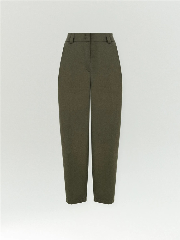 Брюки из тенсела, вискозы и льна в цвете хаки подойдут для любых повседневных дел. Материал не сильно мнётся, имеет приятный лёгкий лоск. Элегантная модель с потайной застёжкой имеет высокую посадку и зауженный крой. Брюки могут стать частью капсулы с жакетом и юбкой bavard.