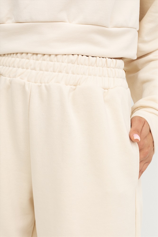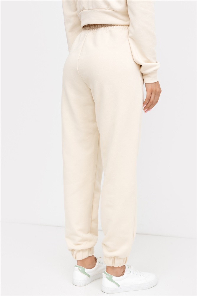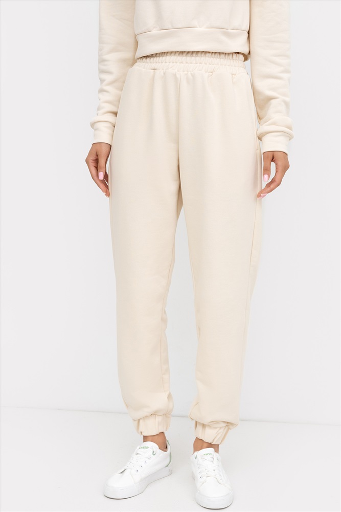 Застежка: без застежки Женские брюки-джоггеры из легкого трикотажного футера без подчеса. Силуэт свободный, максимально расслабленный. Есть удобные боковые карманы. Пояс с эластичной тесьмой внутри. Брюки завершаются манжетами с эластичной тесьмой внутри. Стильные брюки для модных городских образов!