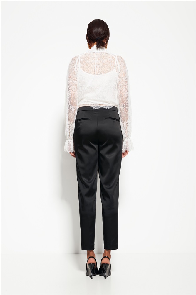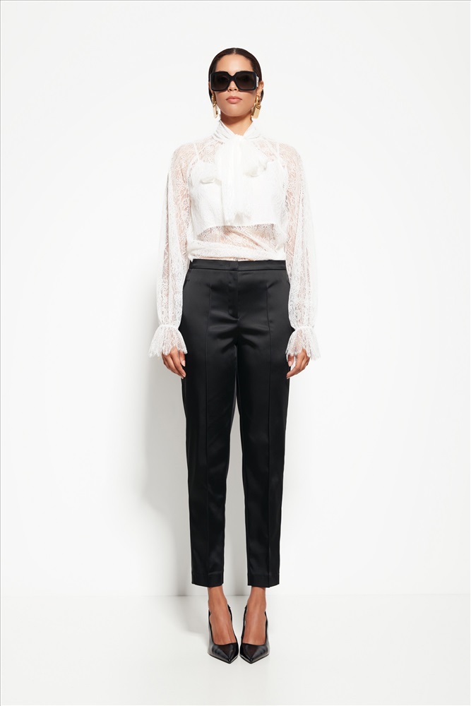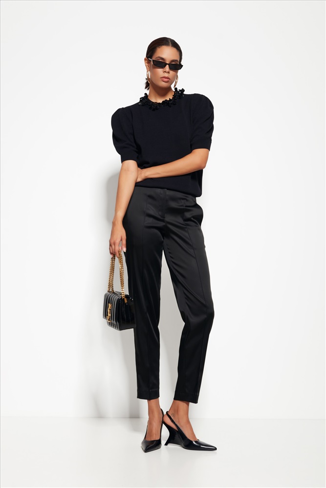 Ткань с лёгким блеском — создаёт выразительный эффект при освещении. Чистые линии и эллегантный крой — баланс между классикой и вечерним стилем. Слегка зауженный силуэт — подчёркивает фигуру без излишнего объёма. Минимализм в деталях — акцент на ткани и посадке.. Универсальность: модель хорошо сочетается с различными типами верхов