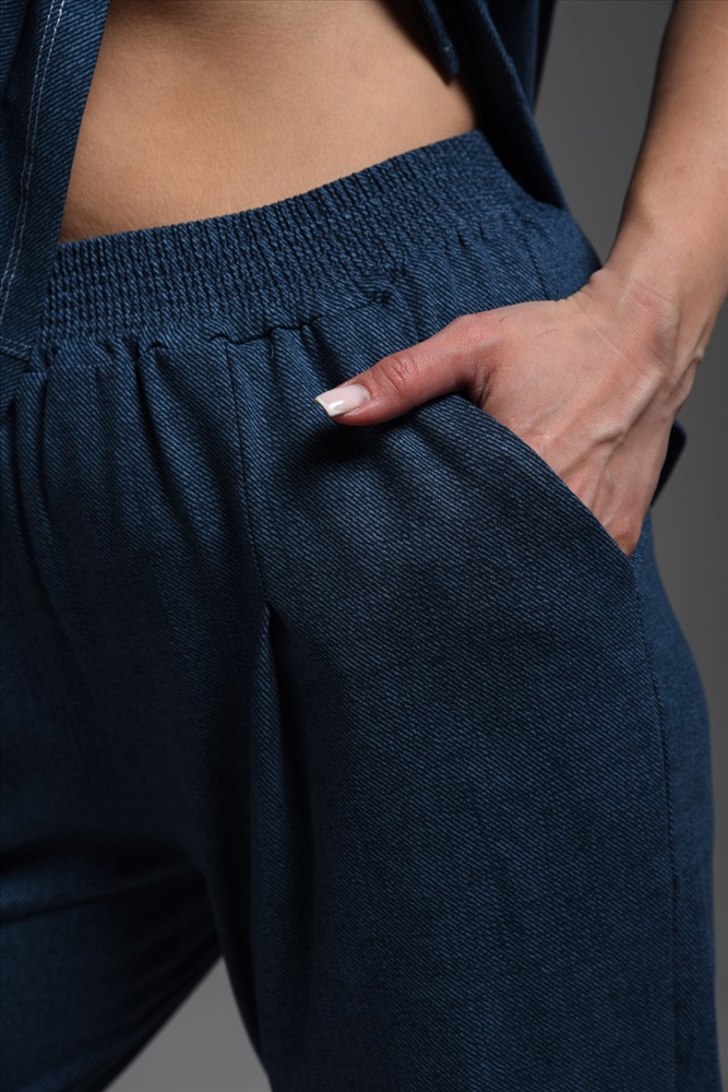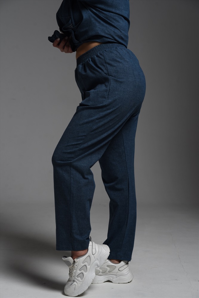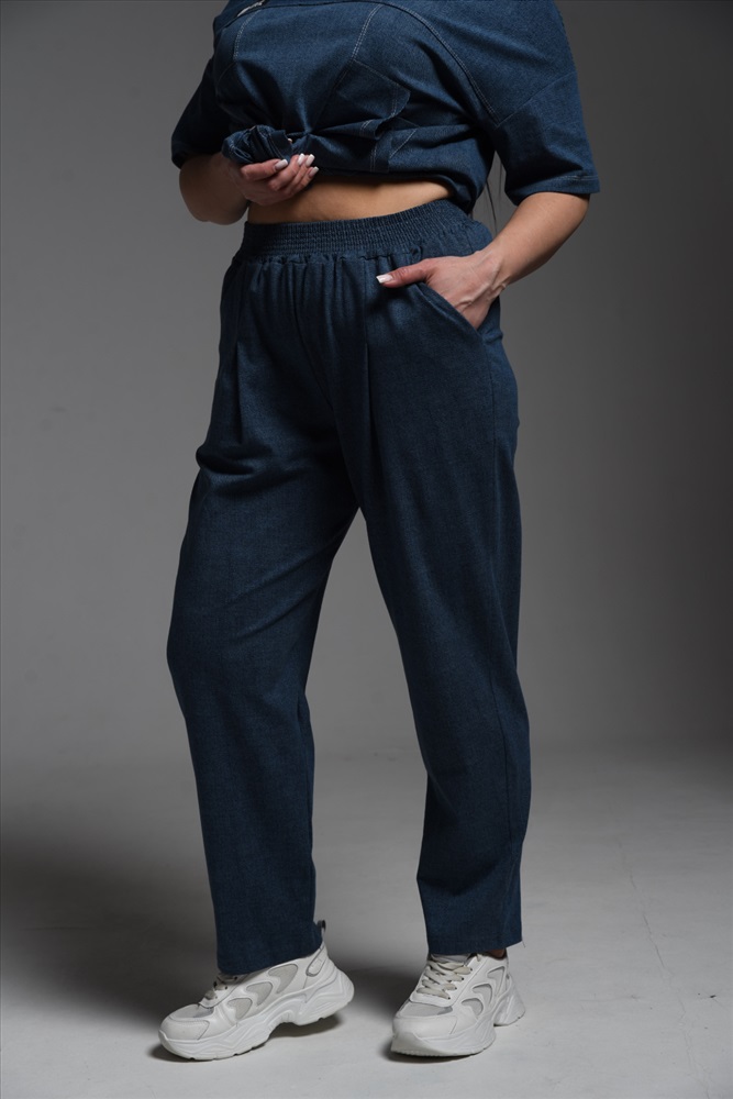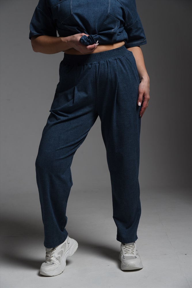 Застежка: без застежки Брюки на поясе, с боковыми карманами, спереди со складками по шву притачивания пояса.