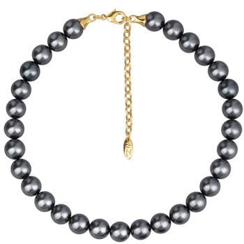 Изготовлено из ювелирного сплава на основе латуни с гальваническим покрытием золотом. Изделие украшает круглый жемчуг Майорка темно-серого цвета диаметром 12мм. Длина 38см. Шпрингельный замок с удлинителем 7см. 30 бусин.