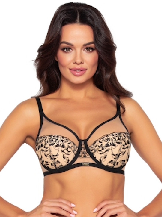 Бюстгальтер 2060 выполнен на основе модели 1030 в телесном цвете с шитыми чашками на косточках, нижняя часть чашки из тонкого поролона телесного цвета, с внешней стороны из сетки с тонкой цветочной вышивкой, незаметно скрывающей то, что должно быть скрыто, верхняя часть чашки из двух слоев сетки. Окантовка косточек на чашках, резинки и бретели контрастного черного цвета, пояс из эластичного сетчатого полотна. Бретельки регулируются по длине, не отстёгиваются. На спине застёжка на удлинитель, количество крючков в ряду 2. Фурнитура металлическая цвета желтого золота. Благодаря популярному дизайну грудь получает идеальную поддержку, а идеально скроенные чашки придают ей естественную округлую форму. Бюстгальтер идеально сочетается с трусиками из коллекции 2060, 2061.
